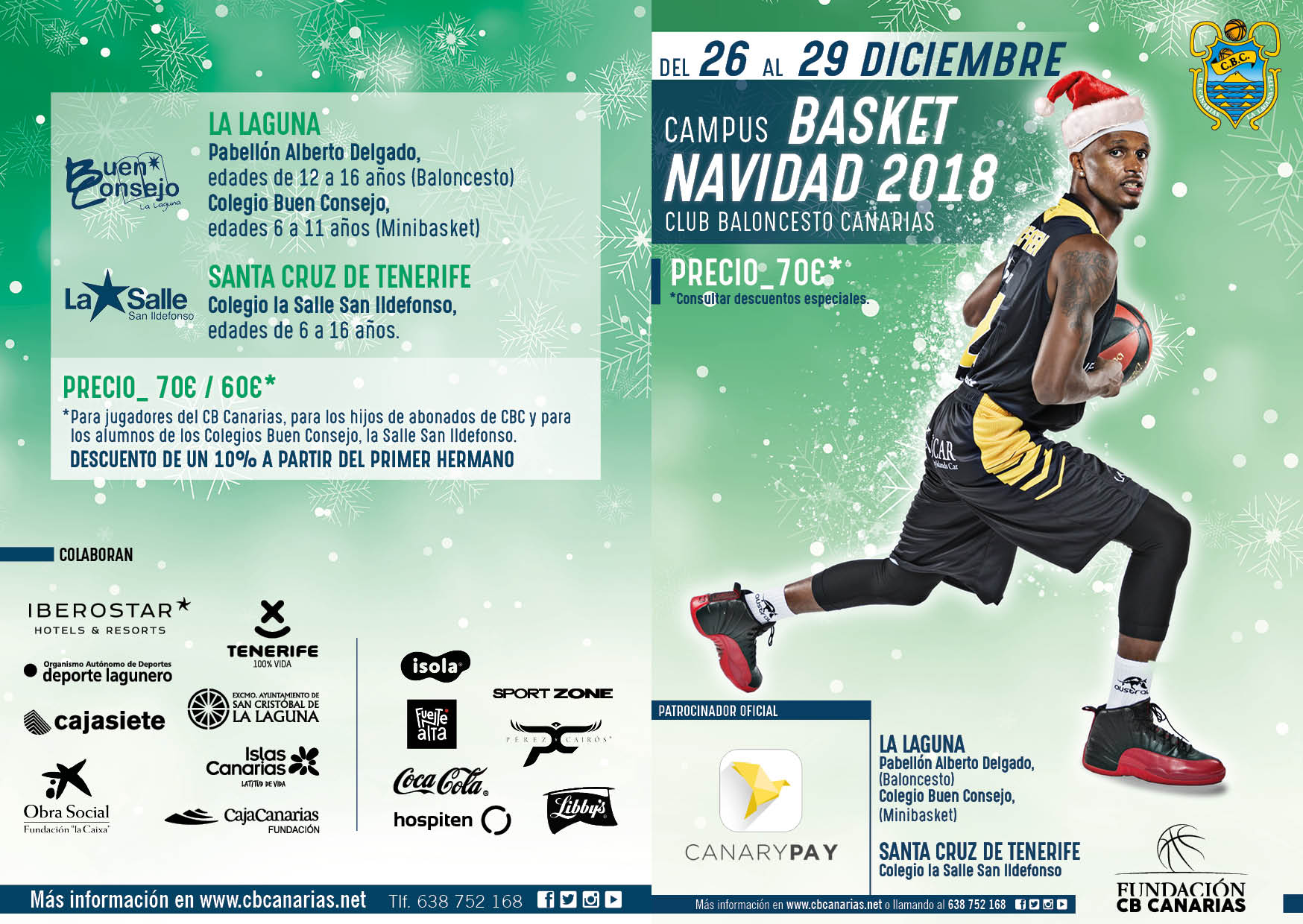 lunes, 19 noviembre, 2018 - 03:11El CB Canarias ha abierto el plazo de inscripción para sus Campus de Navidad 2018. El club tinerfeño lanza una doble oferta de ocio en La Laguna, con un campus en el Pabellón Alberto Delgado destinado a niñ@s de 12 a 16 años y otro en el Colegio Nuestra Señora del Buen Consejo para niñ@s de 6 a 11 años (minibasket); al tiempo que propone igualmente un certamen en Santa Cruz, concretamente en las instalaciones del Colegio La Salle San Ildefonso para niñ@s de 6 a 16 años.