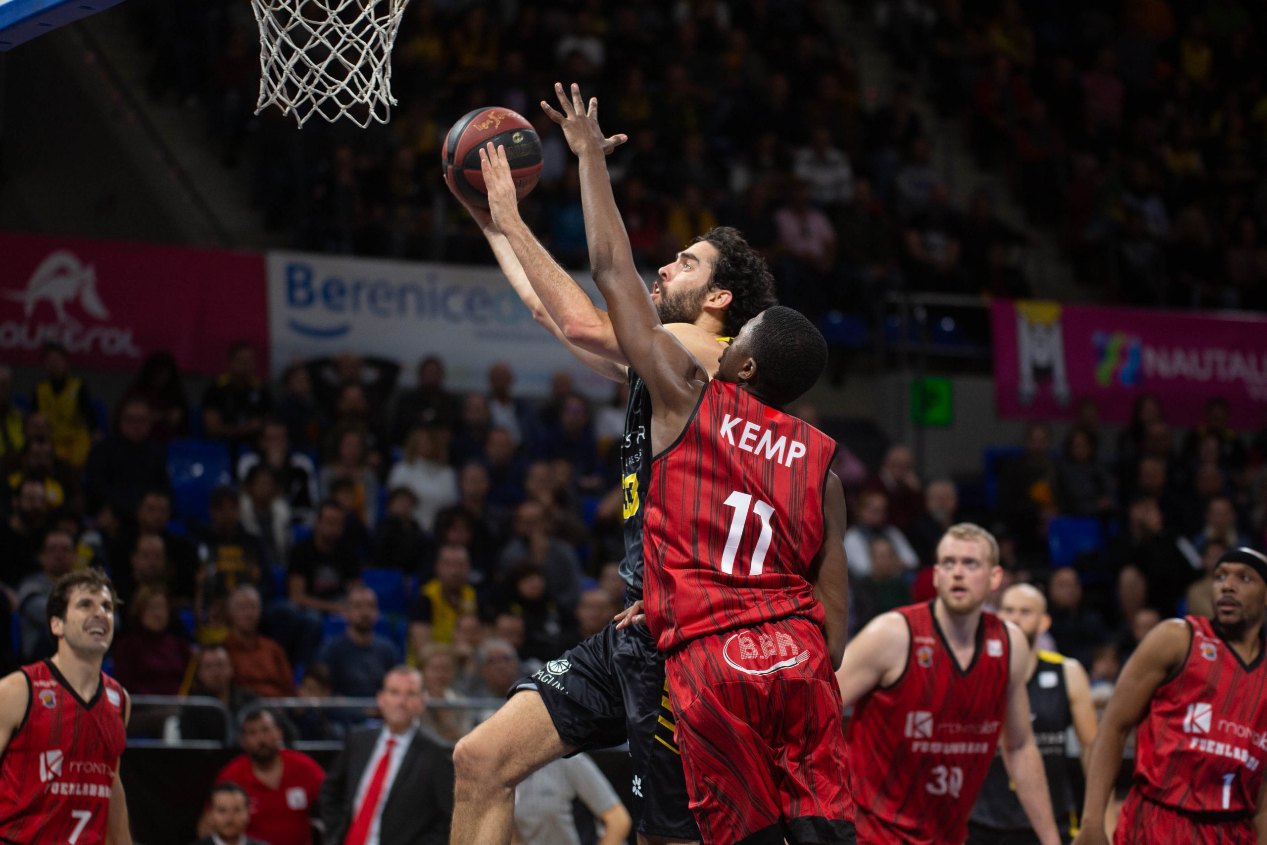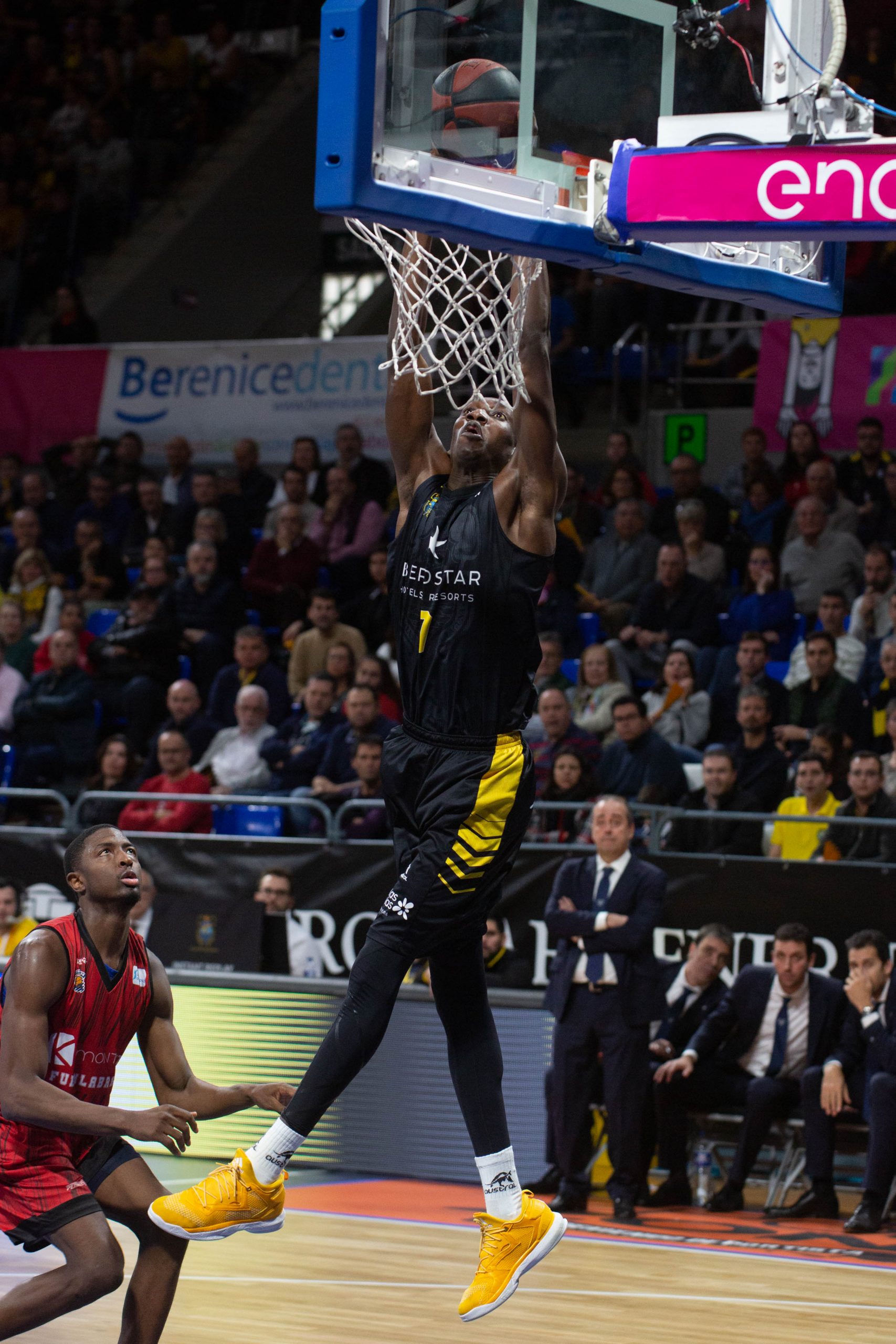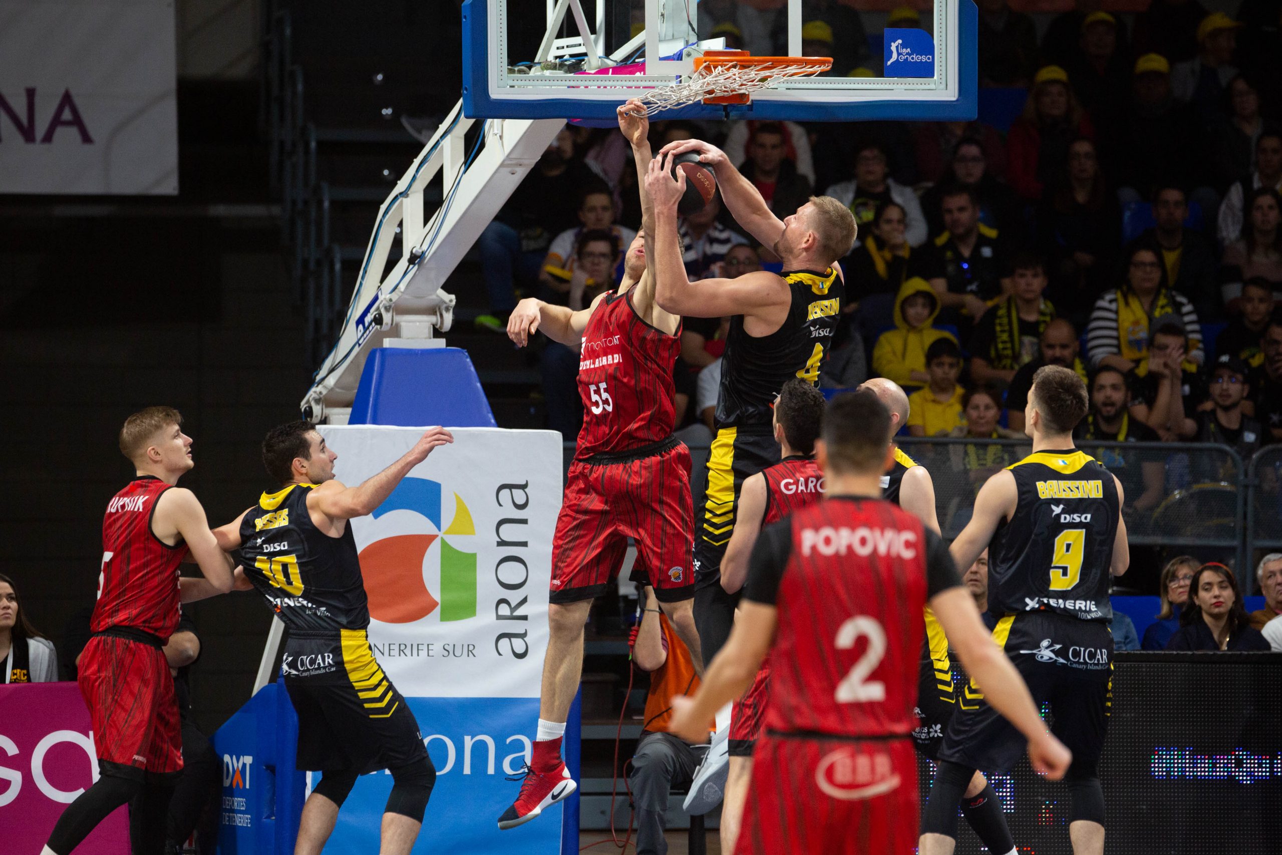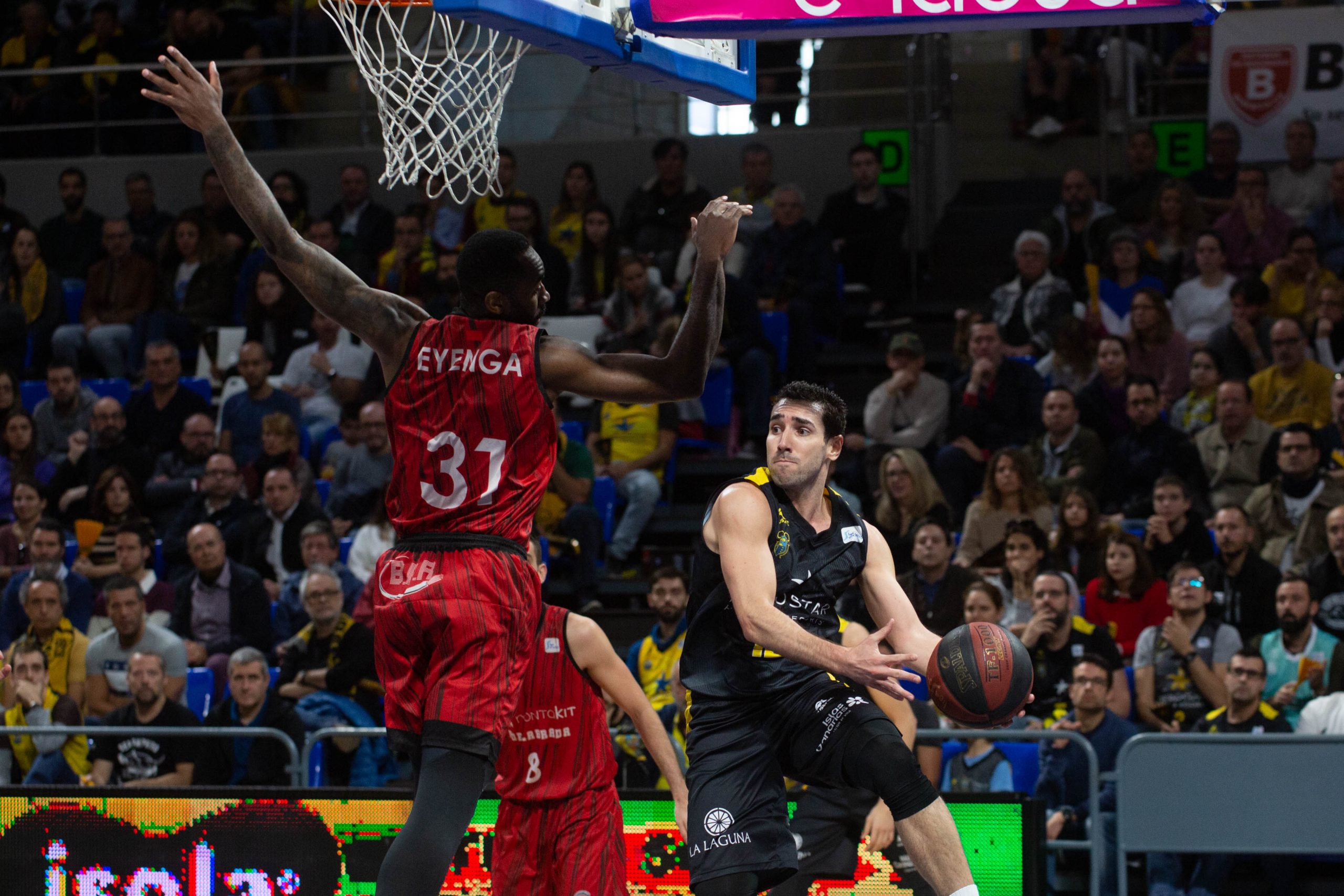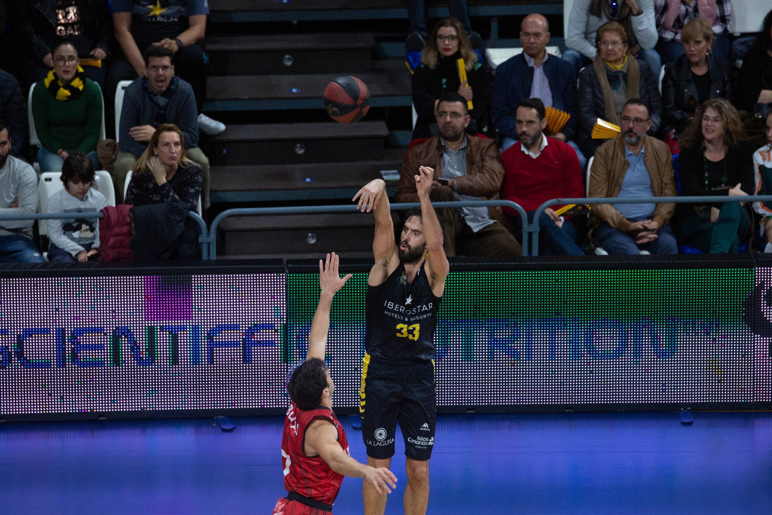 El caso es que el Canarias aceptó el reto y se manejó con fluidez en un arranque a ritmo de vértigo. Los balones interiores a Colton Iverson y el acierto desde el 6,75 (6/12 al receso) voltearon el guión del lado aurinegro (27-23, 10’). El buen hacer de la segunda unidad, con varias acciones de mérito de Bassas o Gillet, permitió además al Iberostar Tenerife ir ganando en confianza conforme avanzaban los minutos; incluso después de que los visitantes amagaran con recuperar la iniciativa, tras la irrupción del mexicano Paco Cruz para propiciar un parcial de 0-7 (33-34).