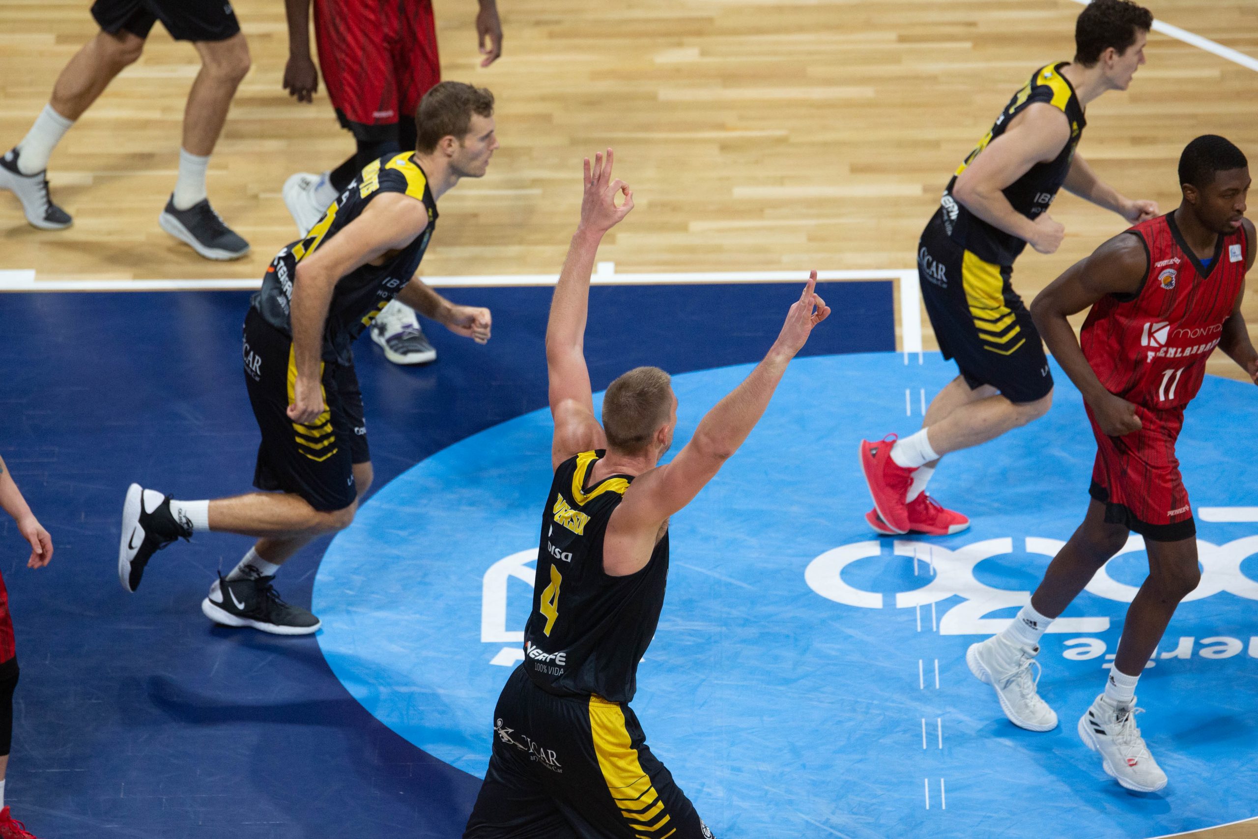 El grupo de Vidorreta ajustó sus piezas y retomó el mando con un buen final de cuarto (40-36, 20’) para dar paso a una segunda mitad casi impecable. Salió con todo el conjunto canarista y al son de Rodrigo San Miguel sacó de la pista a los fuenlabreños sacando a relucir su abanico de opciones ofensivas. El equipo tinerfeño aumentó además su intensidad atrás, hasta el punto de que el conjunto del ‘Che’ García se tiró más de seis minutos sin anotar después de la pausa y solo fue capaz de encestar una canasta en juego a falta de un segundo para el cierre de un tercer cuarto con claro color aurinegro.