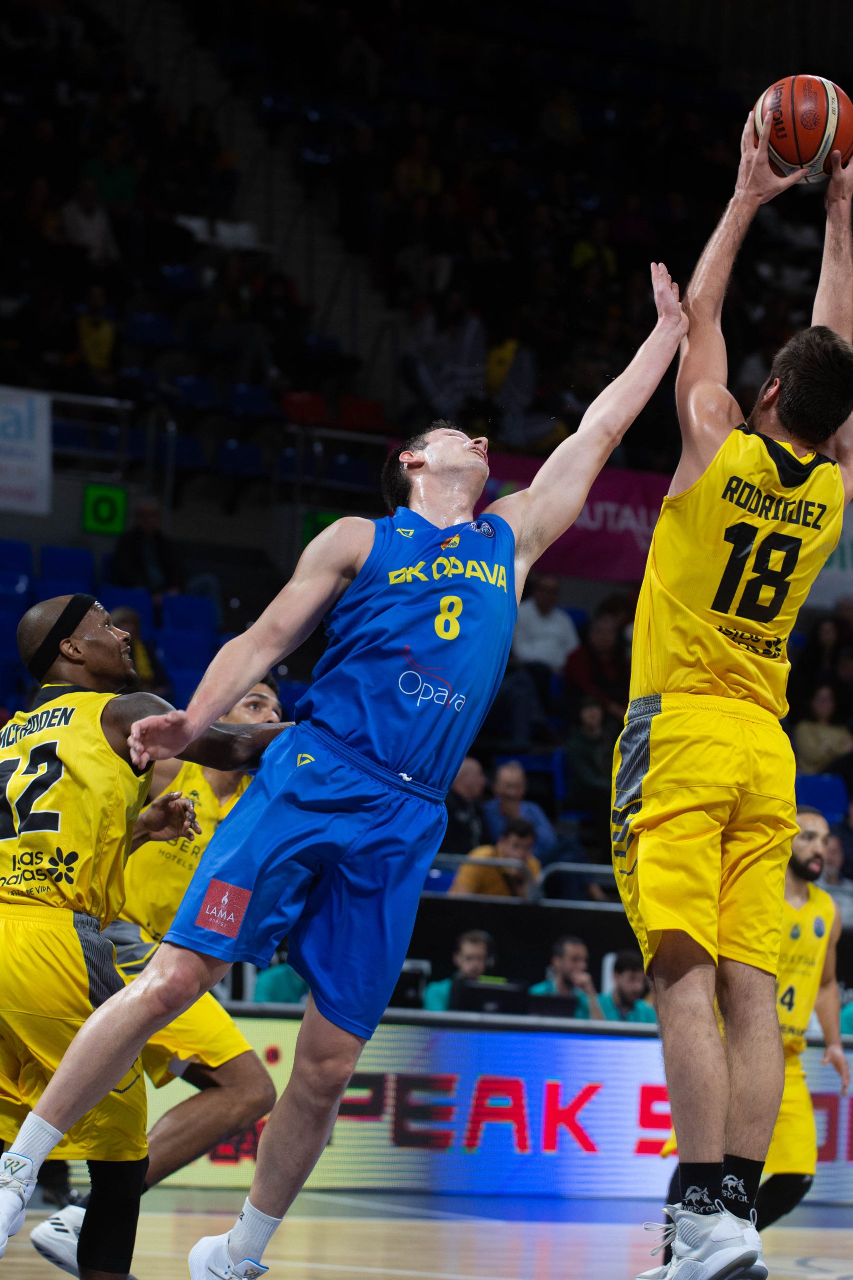 Fue por ahí, en la pintura, donde el Canarias dominó de manera abrumadora la contienda: 65 rebotes, 19 de ellos ofensivos, frente a las 20 capturas de los visitantes. El técnico aurinegro aprovechó para darle minutos a los menos habituales, que cumplieron con creces; incluidos los tres jugadores vinculados, Mads-Bonde Stürup, Samuel Rodríguez y Alberto Cabrera, que compiten con el RC Náutico de Liga EBA y ayudan en el día a día de los entrenamientos del primer equipo aurinegro.