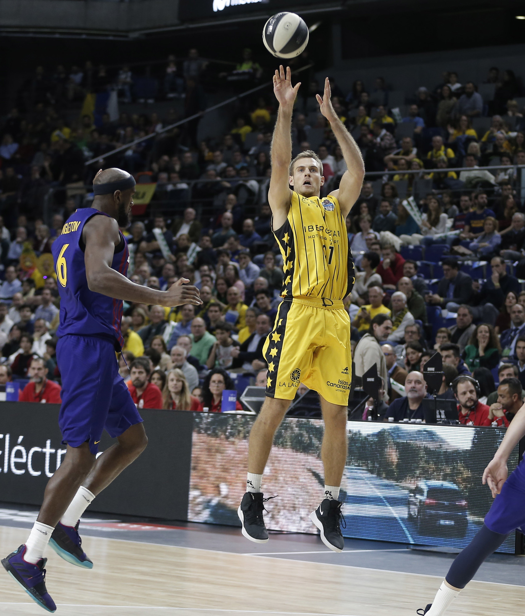 El coraje aurinegro desconectó del partido al Barça y aunque la distancia era casi insalvable, el Canarias siguió intentándolo, sin resuello y con jugadas de mucho mérito por el camino, incluido un alley oop magistral de pizarra culminado por Sebas Saiz. En medio del frenesí, y después de que la afición aurinegra hubiera expresado ya su malestar por varias decisiones arbitrales, un triple de Staiger puso a los insulares a solo cuatro puntos (87-83), con 20,9 segundos por delante.