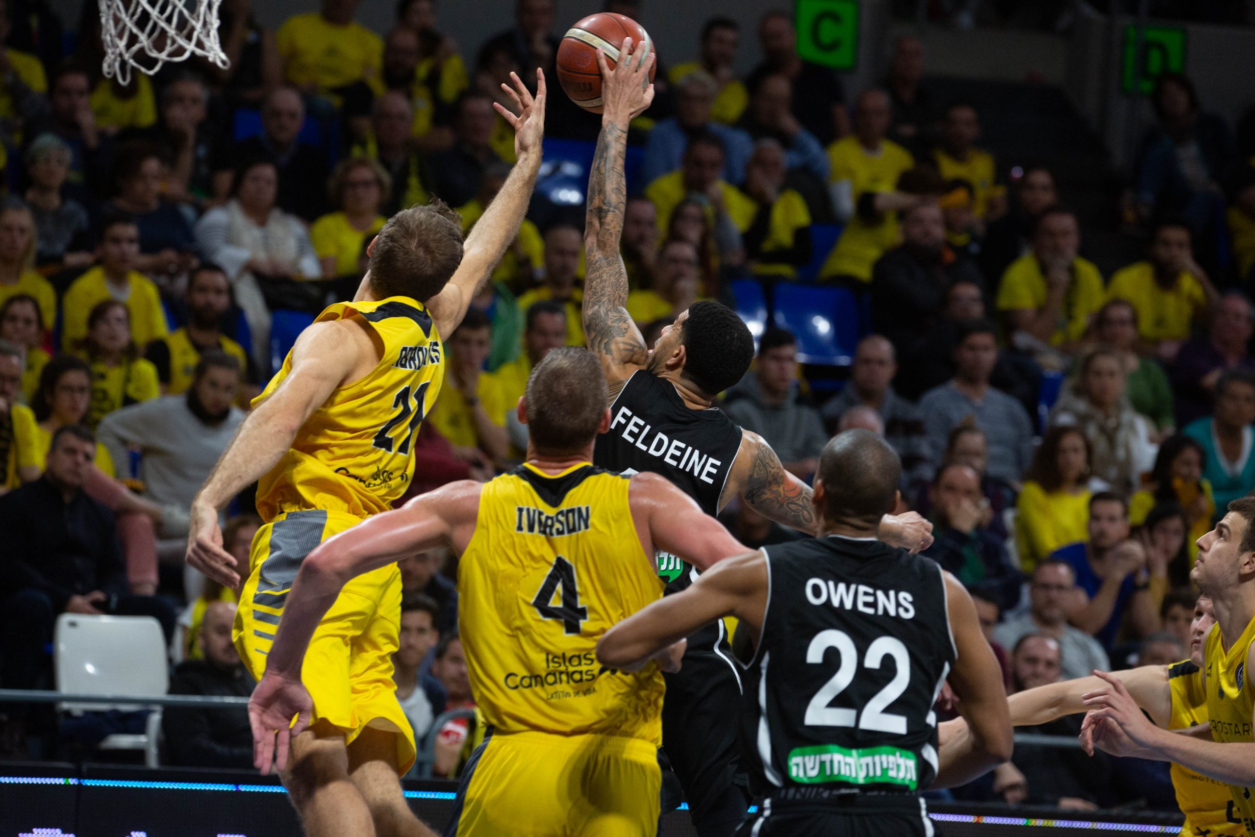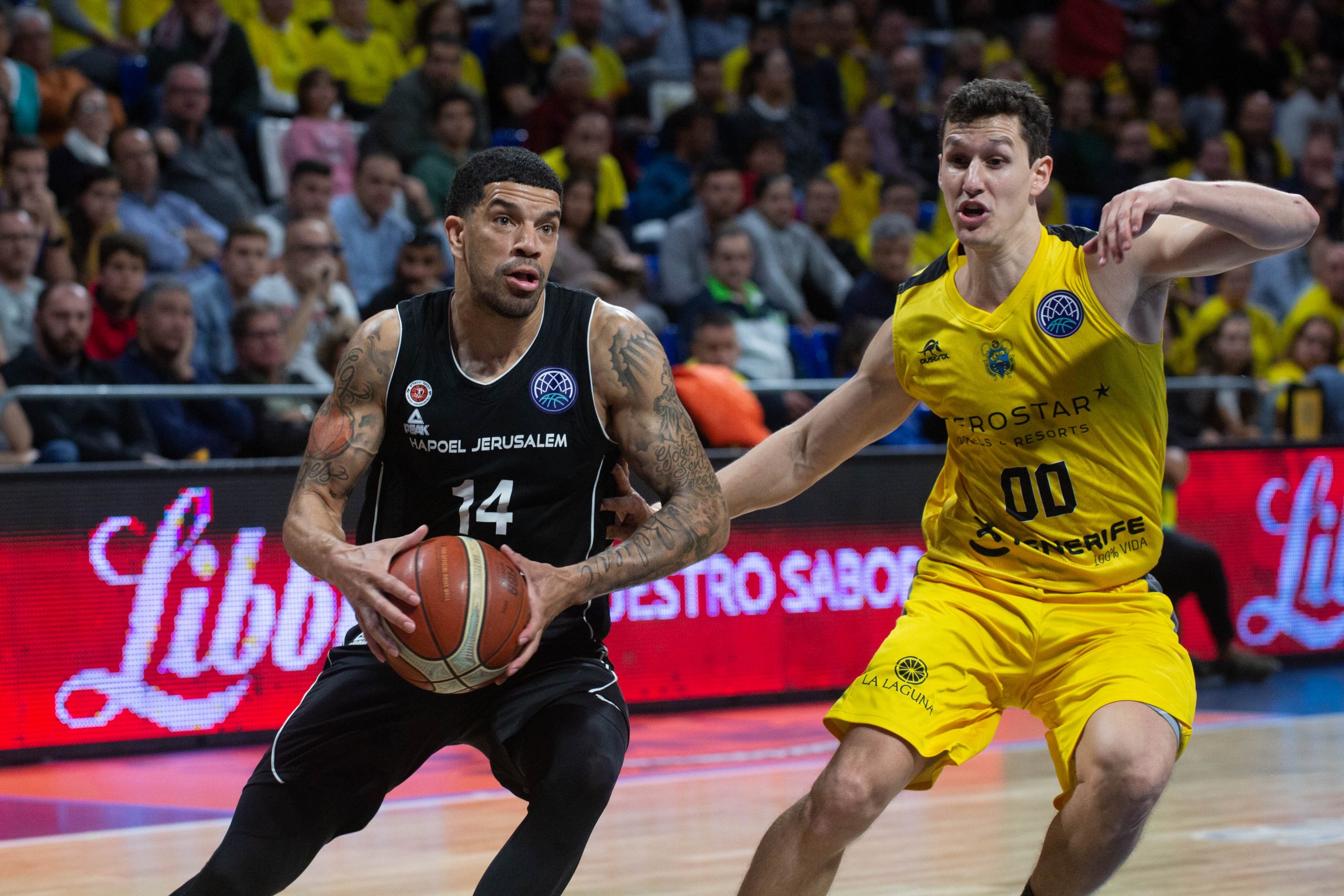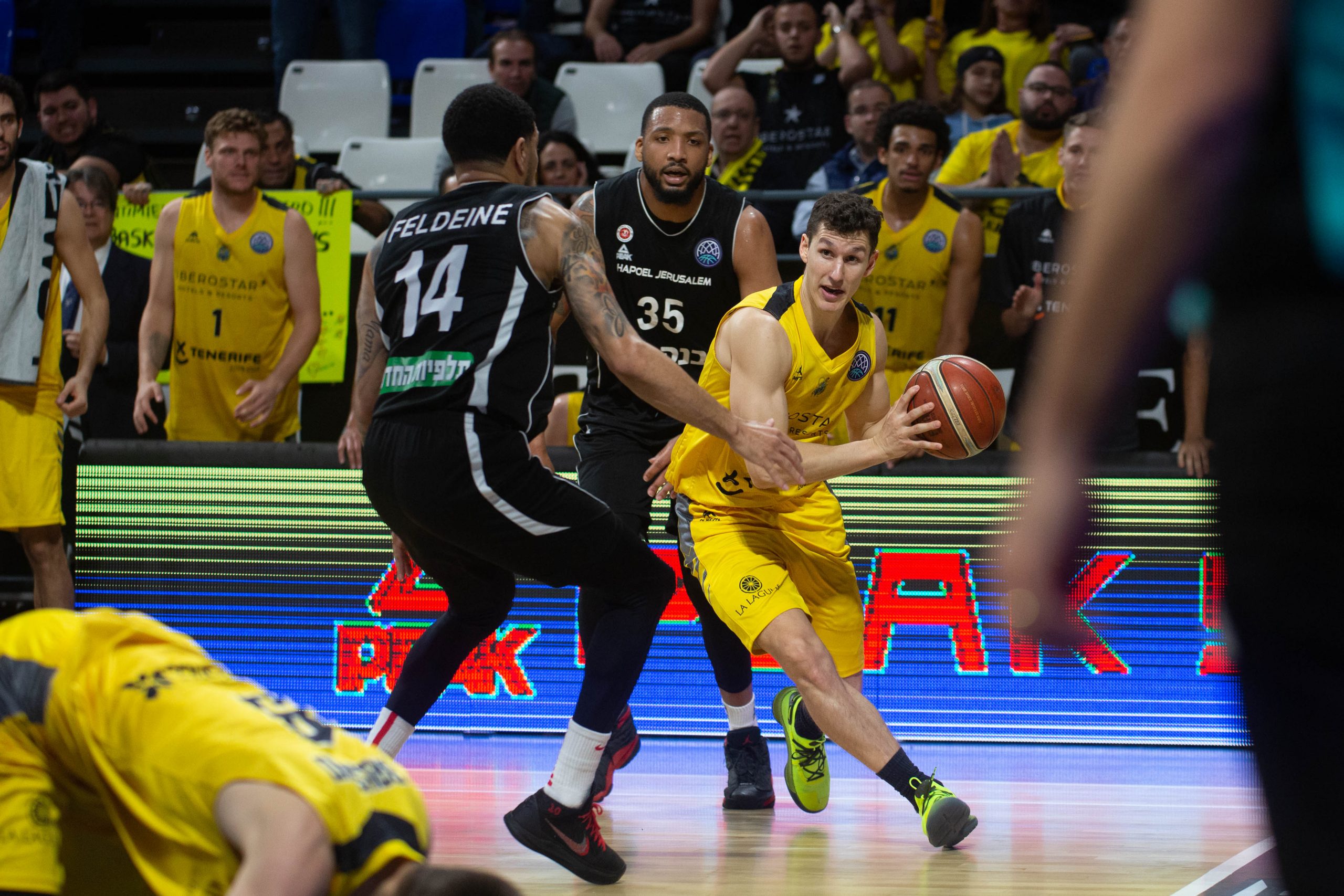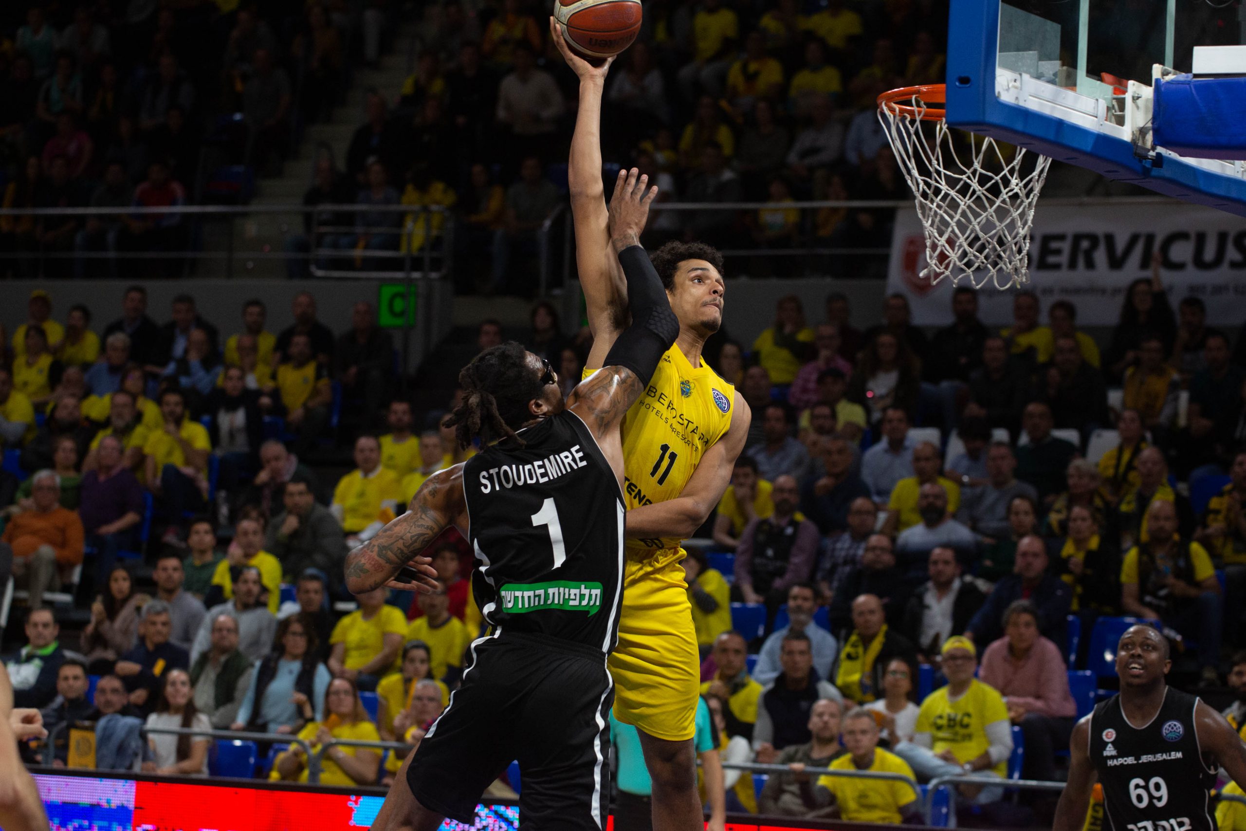 El Canarias hizo daño entonces tanto al contraataque como explotando sus segundas opciones en ataque. Cuatro triples consecutivos de los anfitriones, tres de un Nico Brussino en trance y uno de Davin White, cimentaron un parcial de 15-0 para mandar más que un aviso a navegantes, una candidatura en toda regla a la victoria (24-10, 10’). El Hapoel soportaba entonces el vendaval aurinegro como buenamente podía. Dos acciones seguidas de Stoudemire, primero; y la aparición de Feldeine, después, estrecharon el cerco (30-24, 16’), pero el Iberostar Tenerife no estaba dispuesto a ceder en su empeño.
