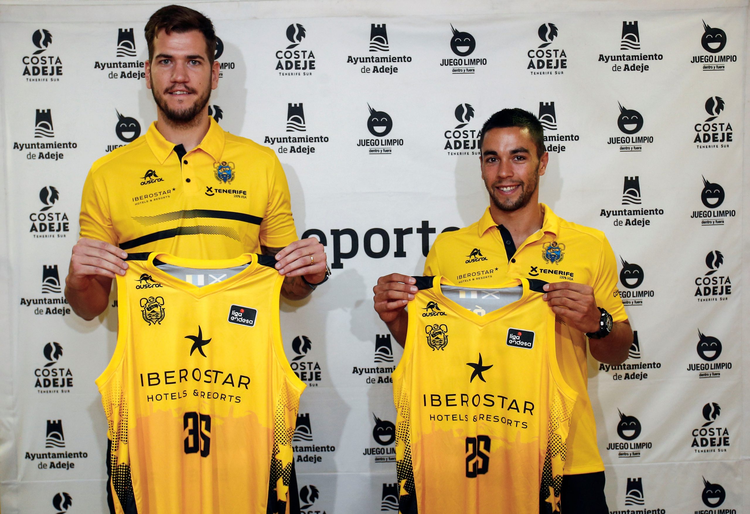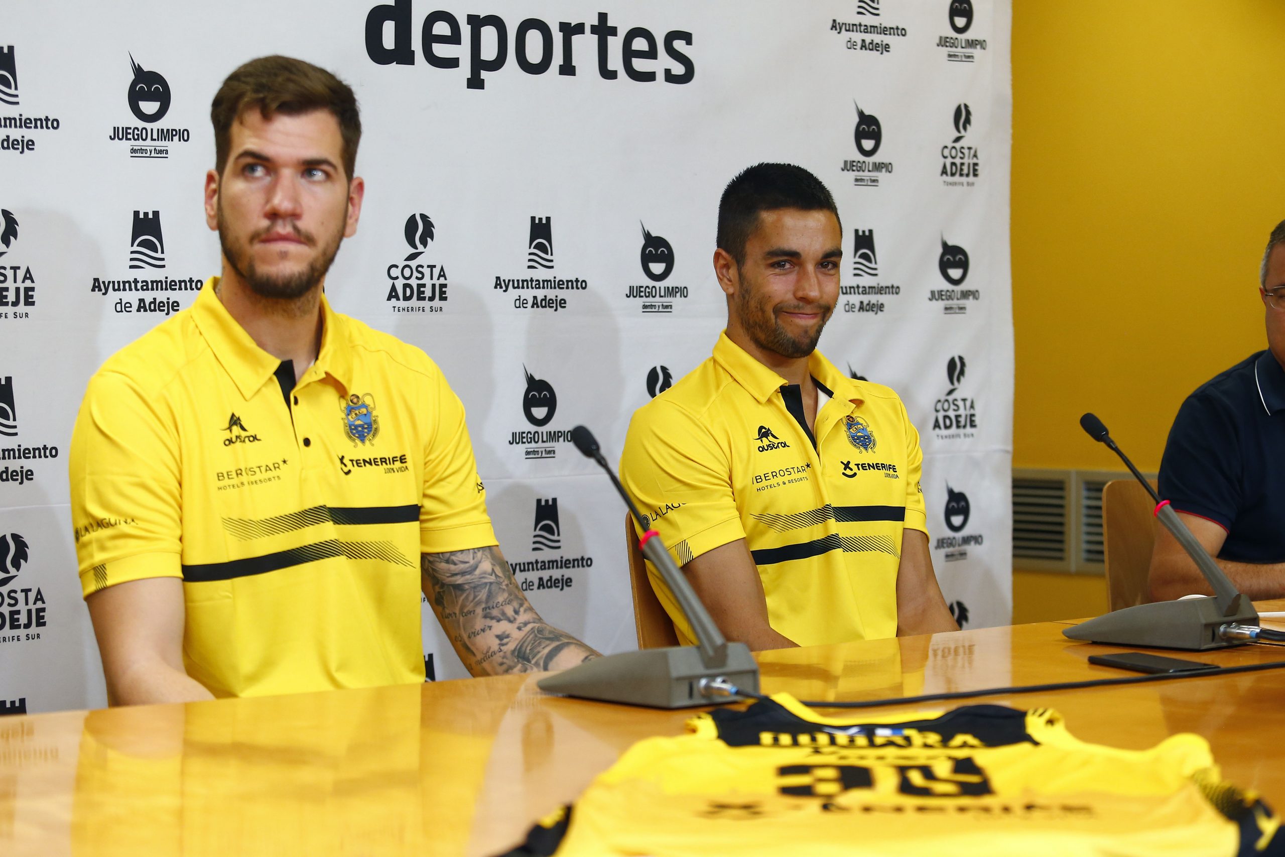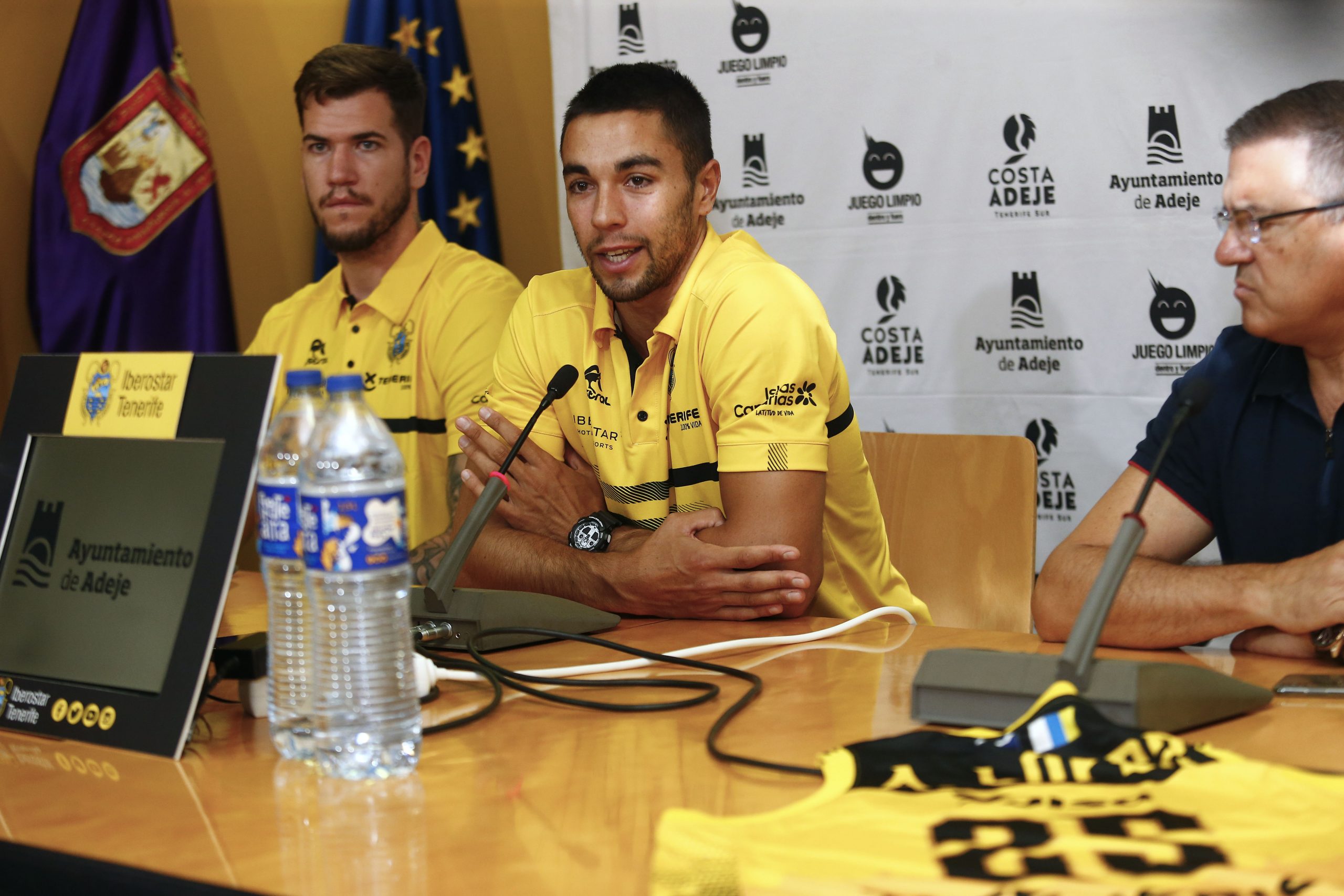 “Ilusionados” y “muy orgullosos” de pertenecer a la familia canarista. Así se mostraron esta mañana Álex López y Fran Guerra, durante su presentación ante los medios, en un acto patrocinado por el Ayuntamiento de Adeje. La cita contó con la presencia de Félix Hernández, presidente canarista, que agradeció el respaldo un año más del consistorio sureño al proyecto aurinegro; y de José Maikel Álvarez, que acudió en representación del área de Deportes del municipio adejero.