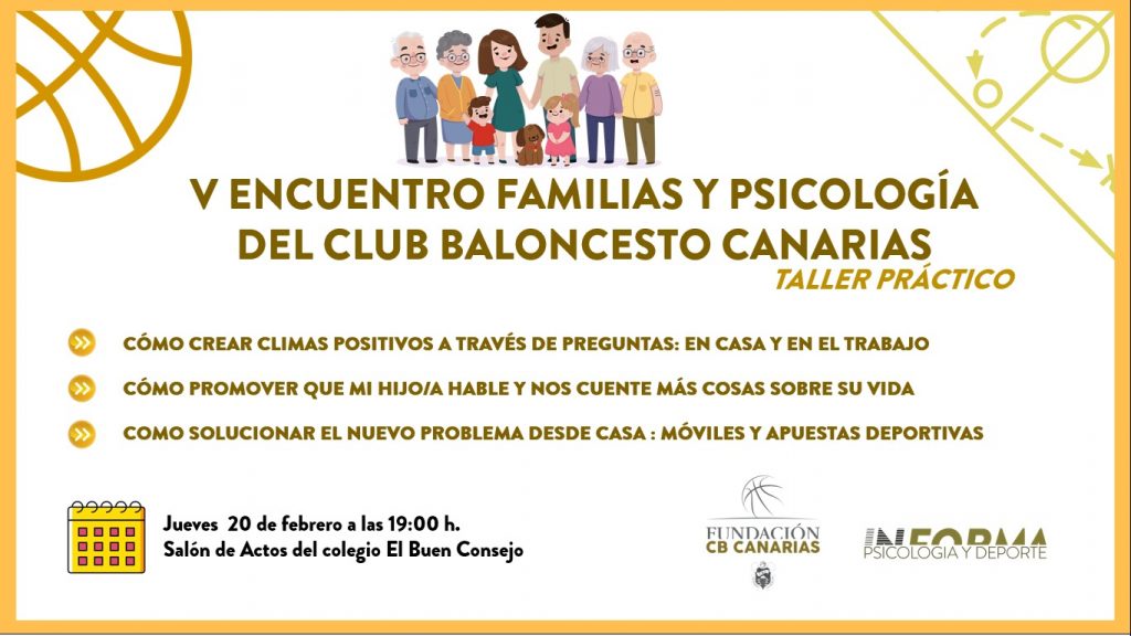 martes, 18 febrero, 2020 - 07:02El Salón de Actos del Colegio Nuestra Señora del Buen Consejo de La Laguna, acogerá este jueves, a partir de las 19:00 horas, el V Encuentro Familias y Psicología del CB Canarias, iniciativa promovida por la Fundación canarista e incluida en el programa de actividades del Gabinete Psicológico del área de Cantera del club aurinegro.