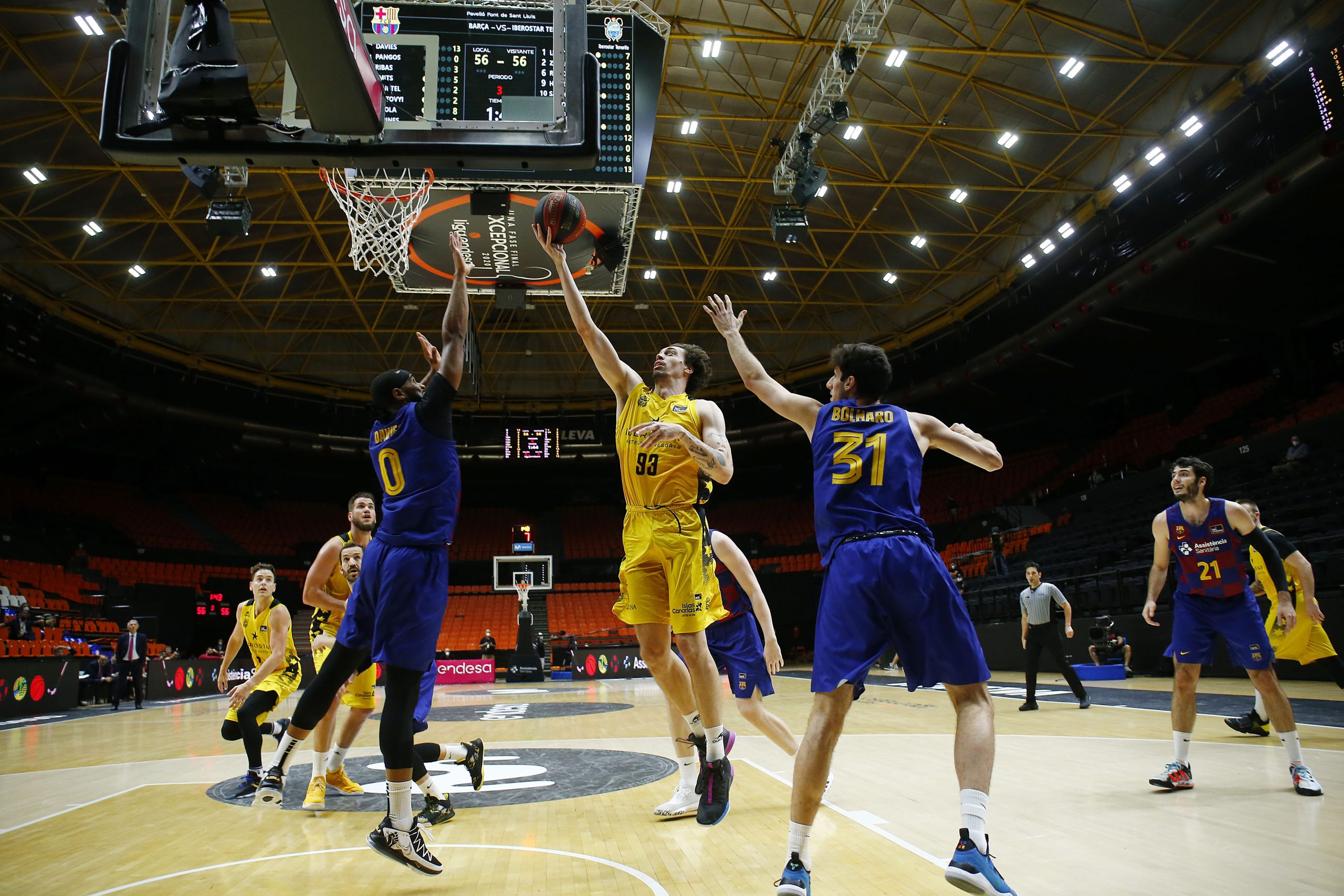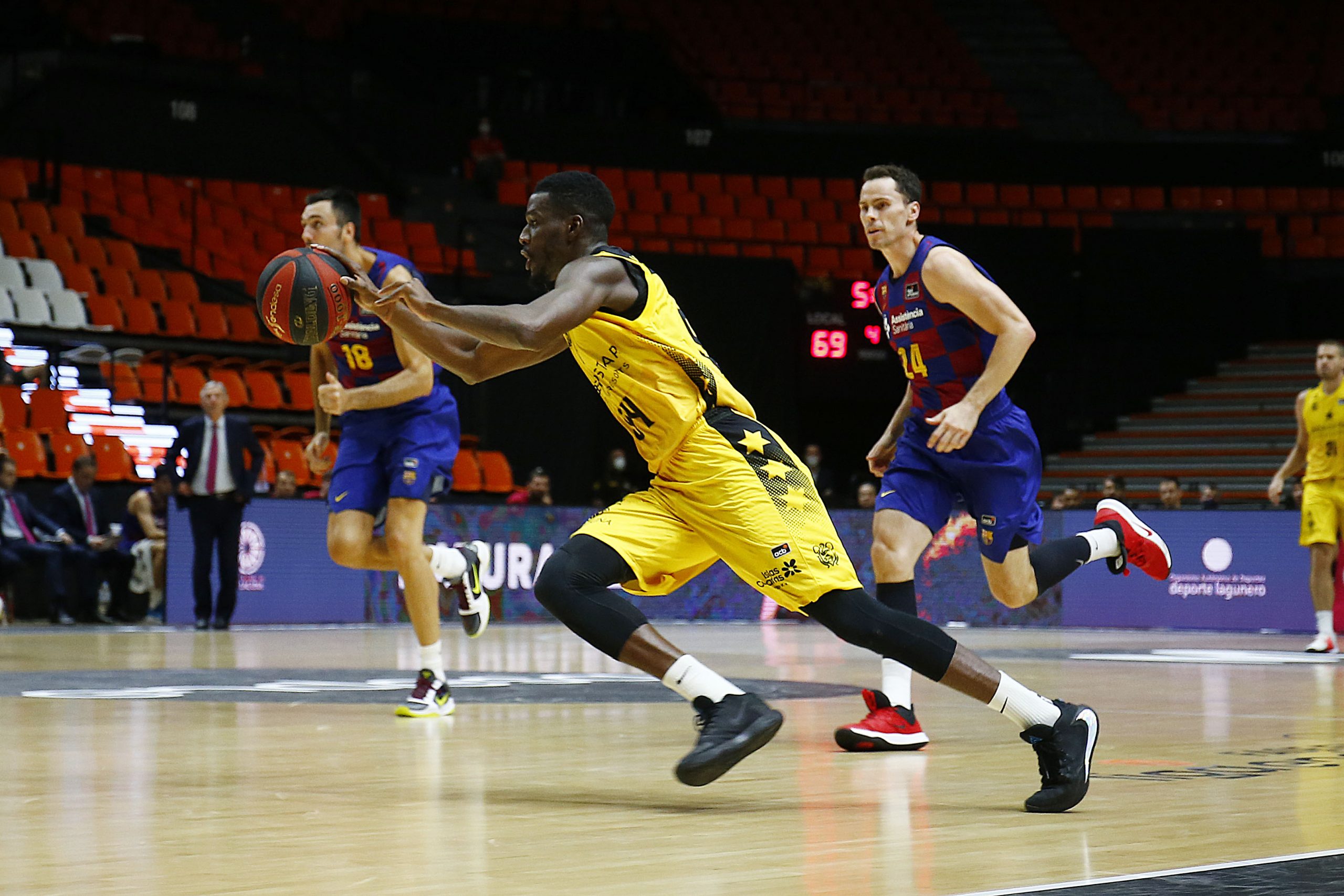 El Iberostar Tenerife martilleó además a su rival con distintas armas. La irrupción de Konate para aumentar la intensidad atrás de los aurinegros y los primeros méritos en el partido de Guerra, dos triples incluidos, fueron estirando la renta lagunera hasta los 15 puntos (32-47).
