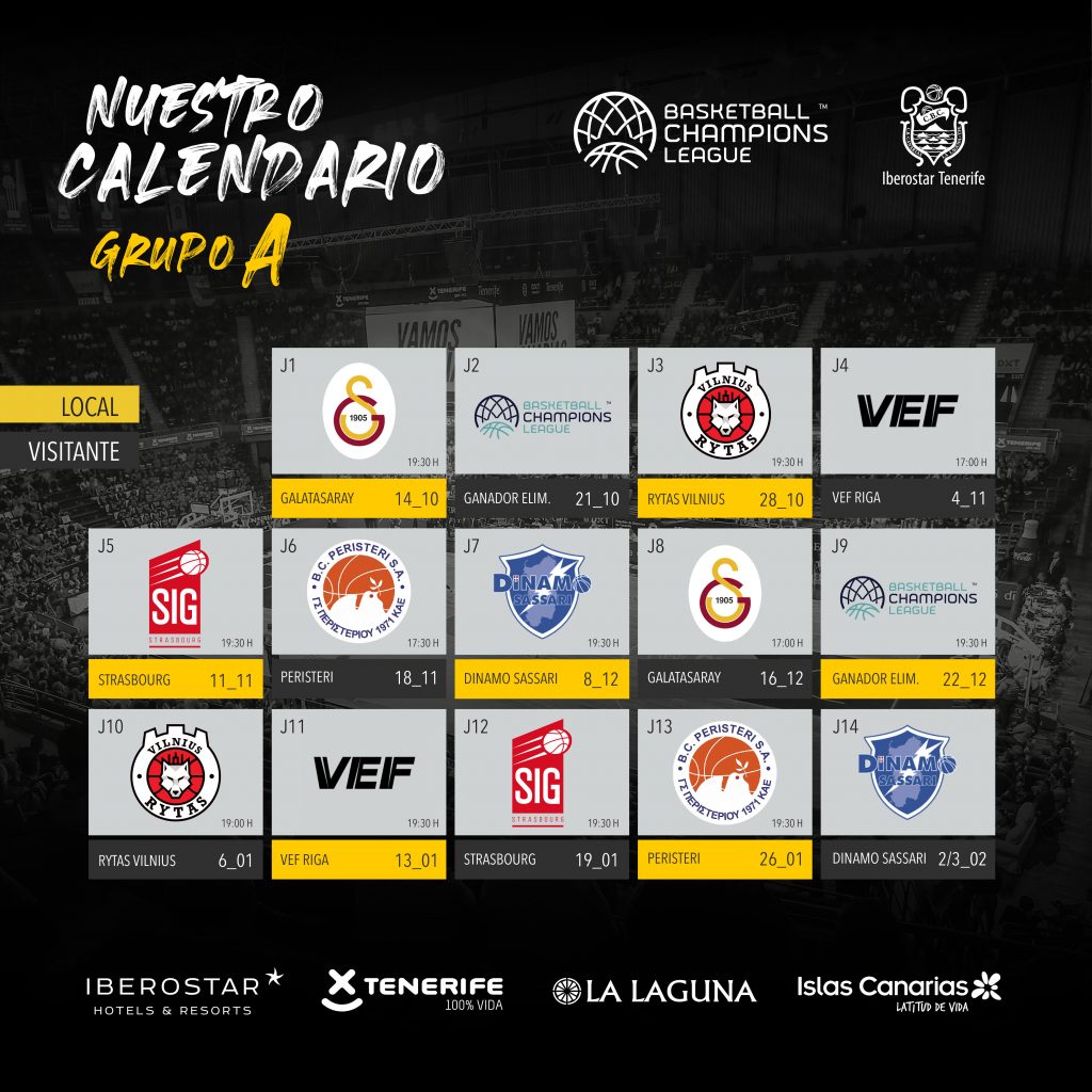 jueves, 23 julio, 2020 - 10:07El Iberostar Tenerife arrancará en casa la fase de grupos de la Basketball Champions League 2020-21, según el calendario publicado en la tarde noche de este jueves por la máxima competición de clubes de FIBA Europa. Los aurinegros debutarán ante el Galatasaray turco el miércoles día 14 de octubre, a las 19:30 hora insular.