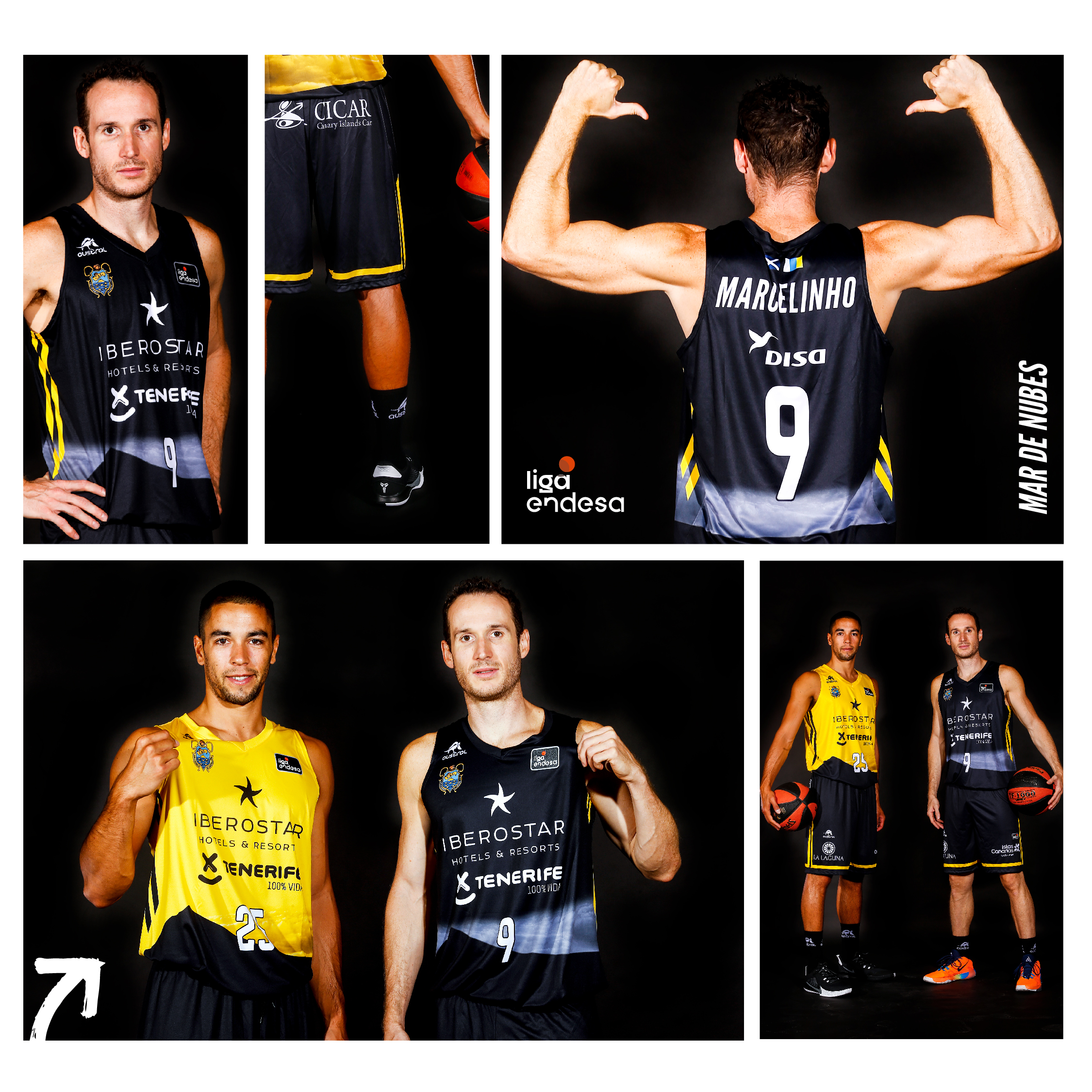 El Padre Teide y la magia del mar de nubes son los protagonistas indiscutibles de la equipación ACB. La silueta del volcán tinerfeño, rodeado por el espectacular efecto natural que originan los vientos Alisios, plasmado en una detallada marca de agua, rodeando la parte inferior frontal y trasera de la camiseta, acaparan la atención en un equipaje mayoritariamente negro con bandas amarillas en los costados en su versión titular.