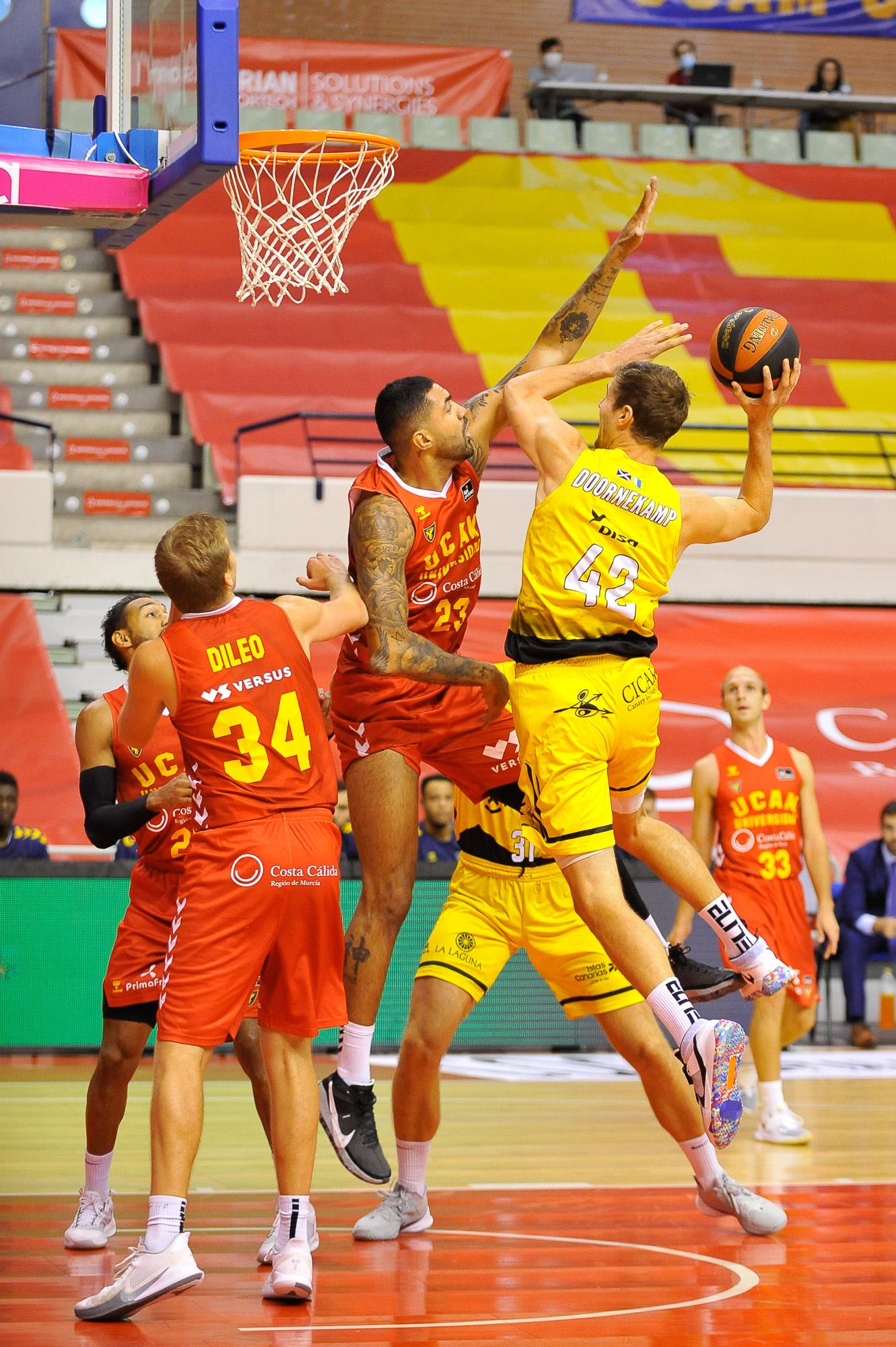 Aún así, el Canarias no estaba dispuesto a ahogarse en su frustración. Un 0-7 al inicio del último cuarto (60-48, tras triple de Doornekamp) supuso el primer aviso a navegantes. Contestó el UCAM amparándose en la calidad de Frankamp (65-51) y en una acción de mérito de Radovic (69-54), pero el conjunto tinerfeño echó el resto en el epílogo.