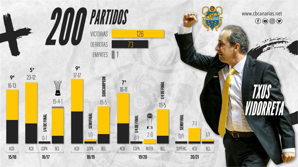 Hasta la fecha, ha firmado un balance de 126 victorias, 73 derrotas y un empate entre todas las competiciones, esto es, Liga Endesa (tanto fase regular como playoff y Final a Doce), Copa del Rey, Supercopa Endesa, Basketball Champions League y Copa Intercontinental. Esta noche afrontará su partido 201 de canarista, en Manresa.