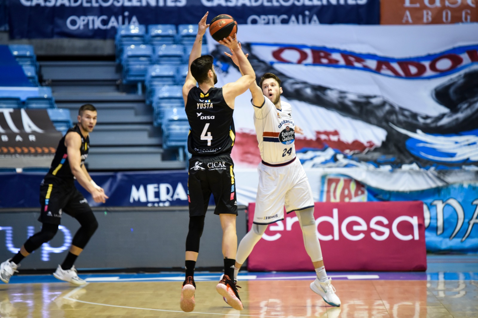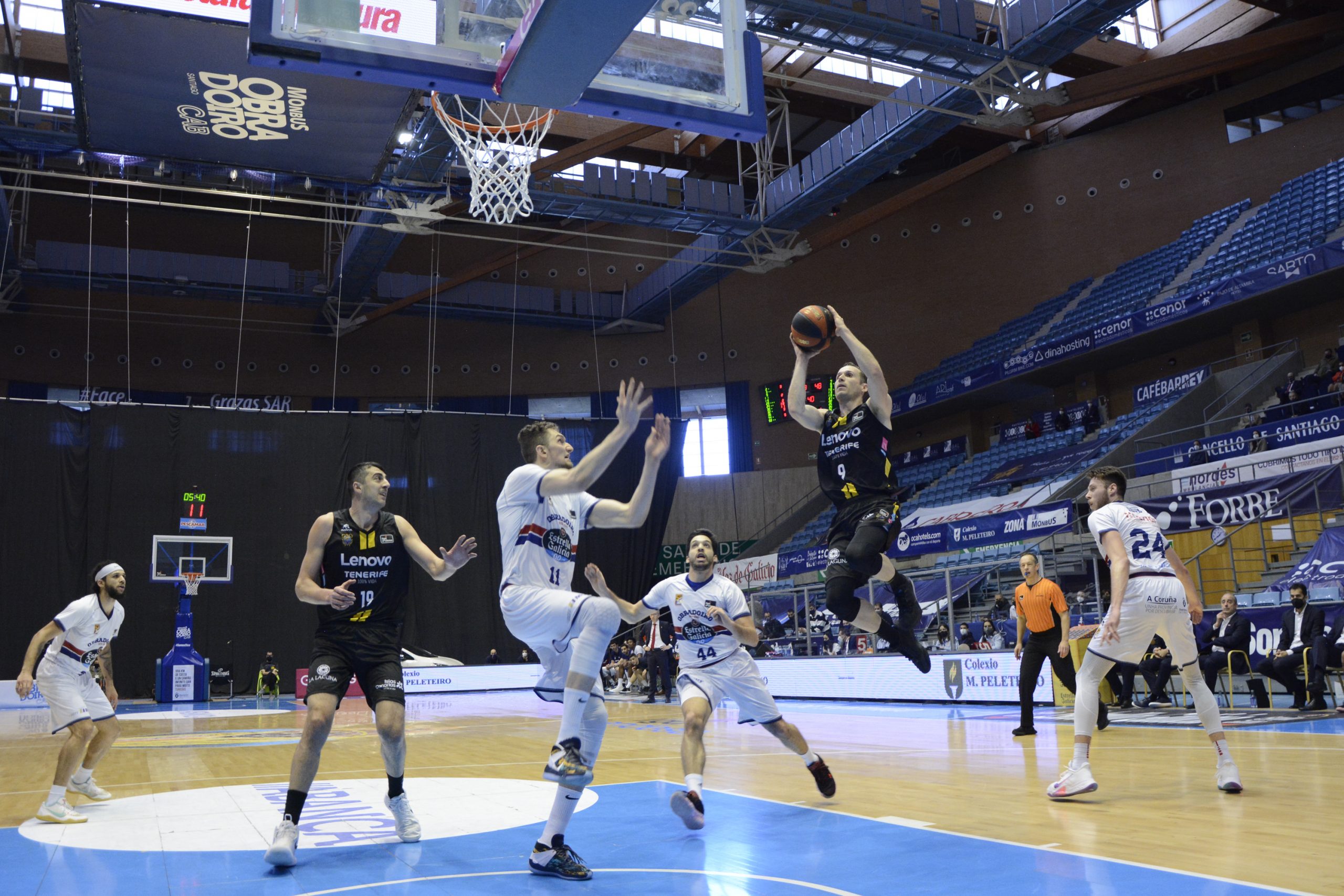 Comenzó bien el Lenovo Tenerife, que aprovechó el poderío interior de Gio Shermadini para firmar una notable puesta en escena, que pasó de ser muy buena a fugaz (0-7) ante la irrupción de la pareja formada por Mike Daum y Kassius Robertson. Con los dos estadounidenses tremendamente acertados (anotaron 22 de los primeros 26 puntos de su equipo, el conjunto gallego hizo un parcial de 12-2 y cogió las riendas del choque (24-22, min. 10).