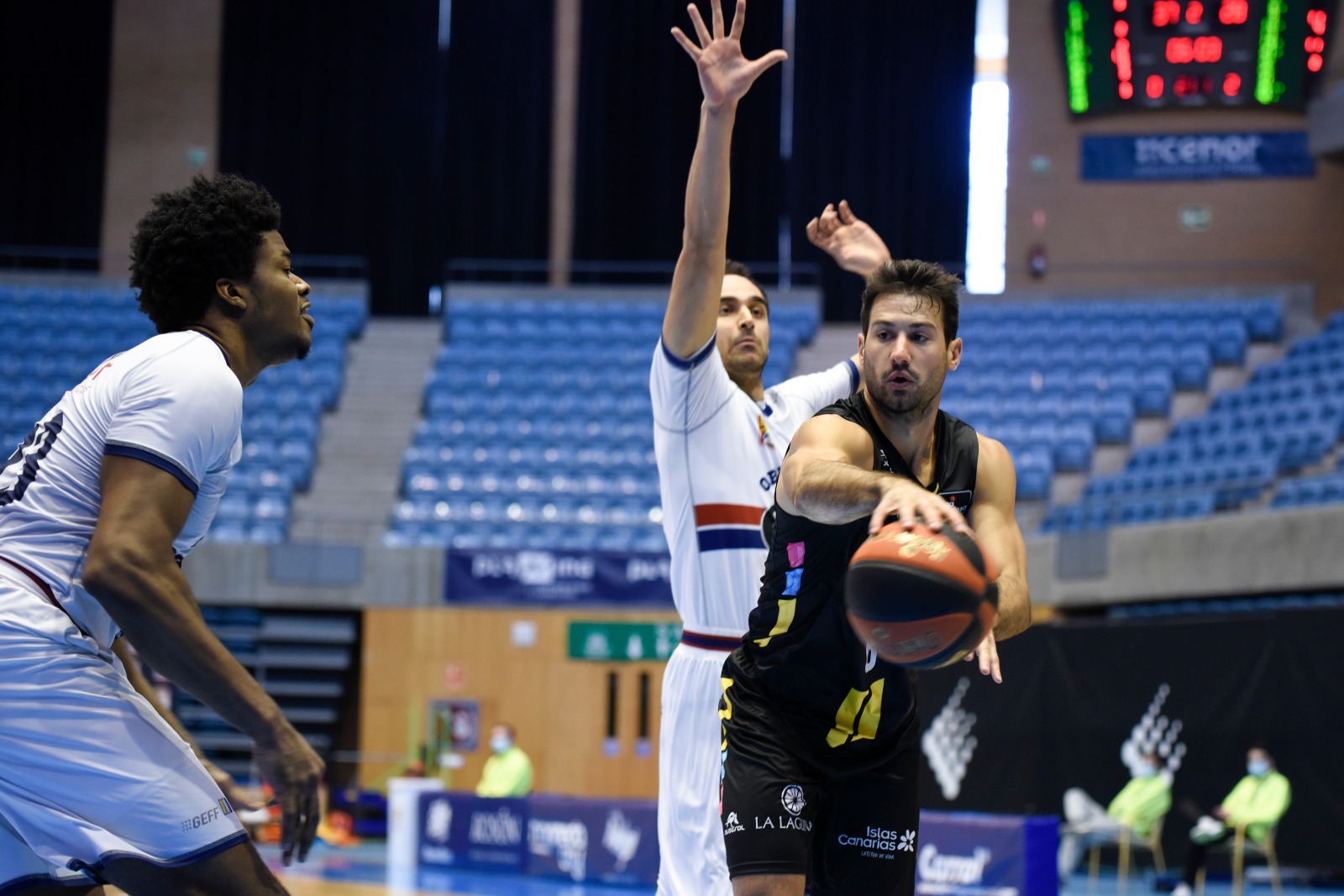 El cuadro aurinegro mantuvo el tipo con las segundas opciones (ocho rebotes ofensivos al descanso) y la aparición de Marcelinho Huertas, que tiró de galones para explotar las situaciones de pick and roll, bien buscando a Gio o anotando directamente. Sin embargo, los laguneros no estaban del todo cómodos, porque sus discretos porcentajes lastraban su ritmo. Espesura que aprovechó el Monbus para estirar su renta hasta los nueve puntos (37-28).