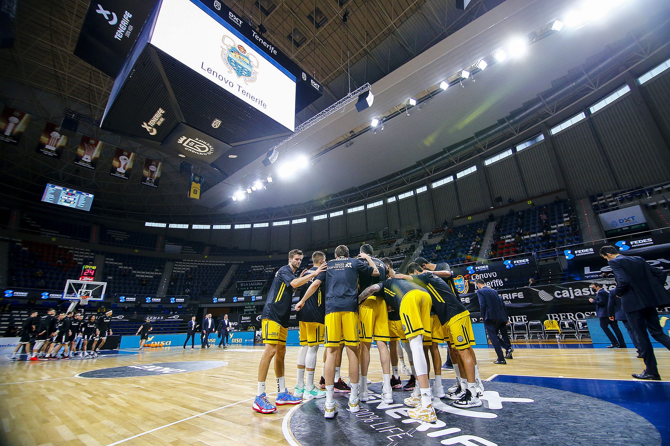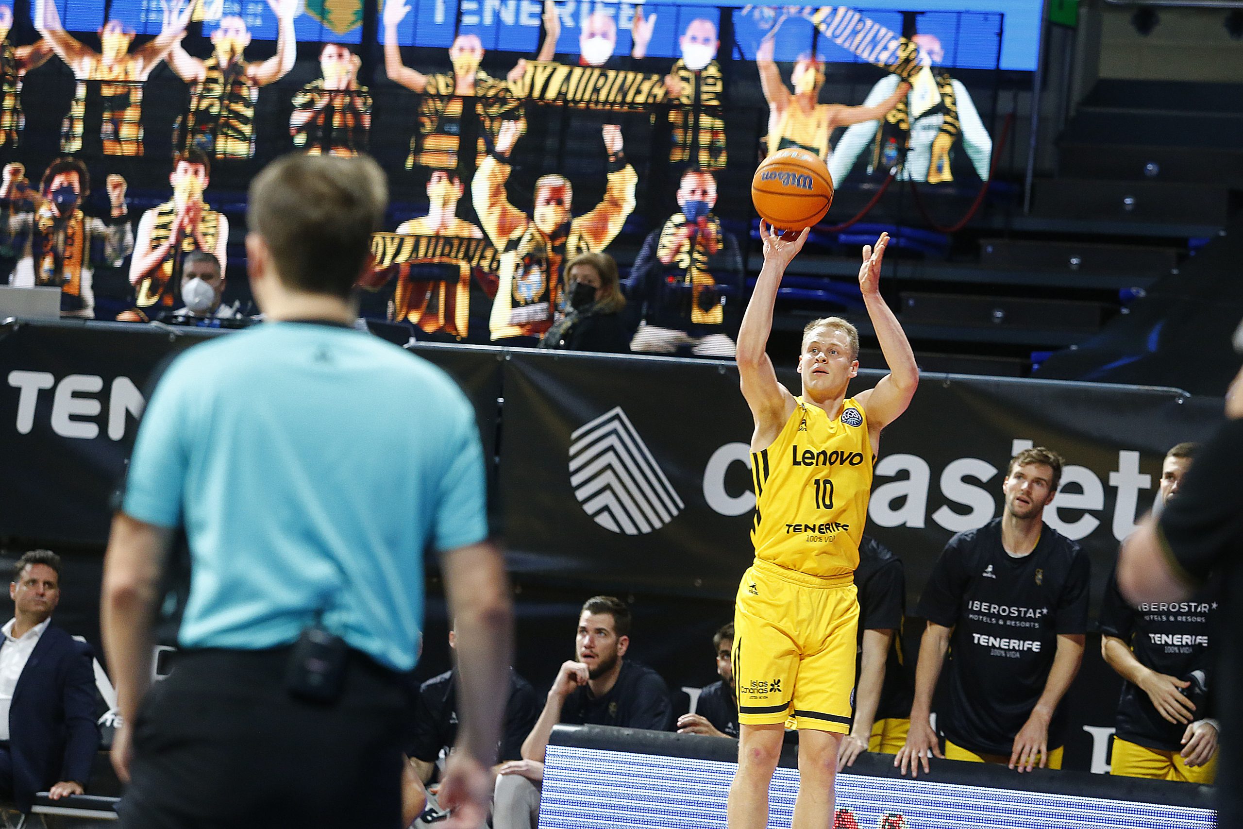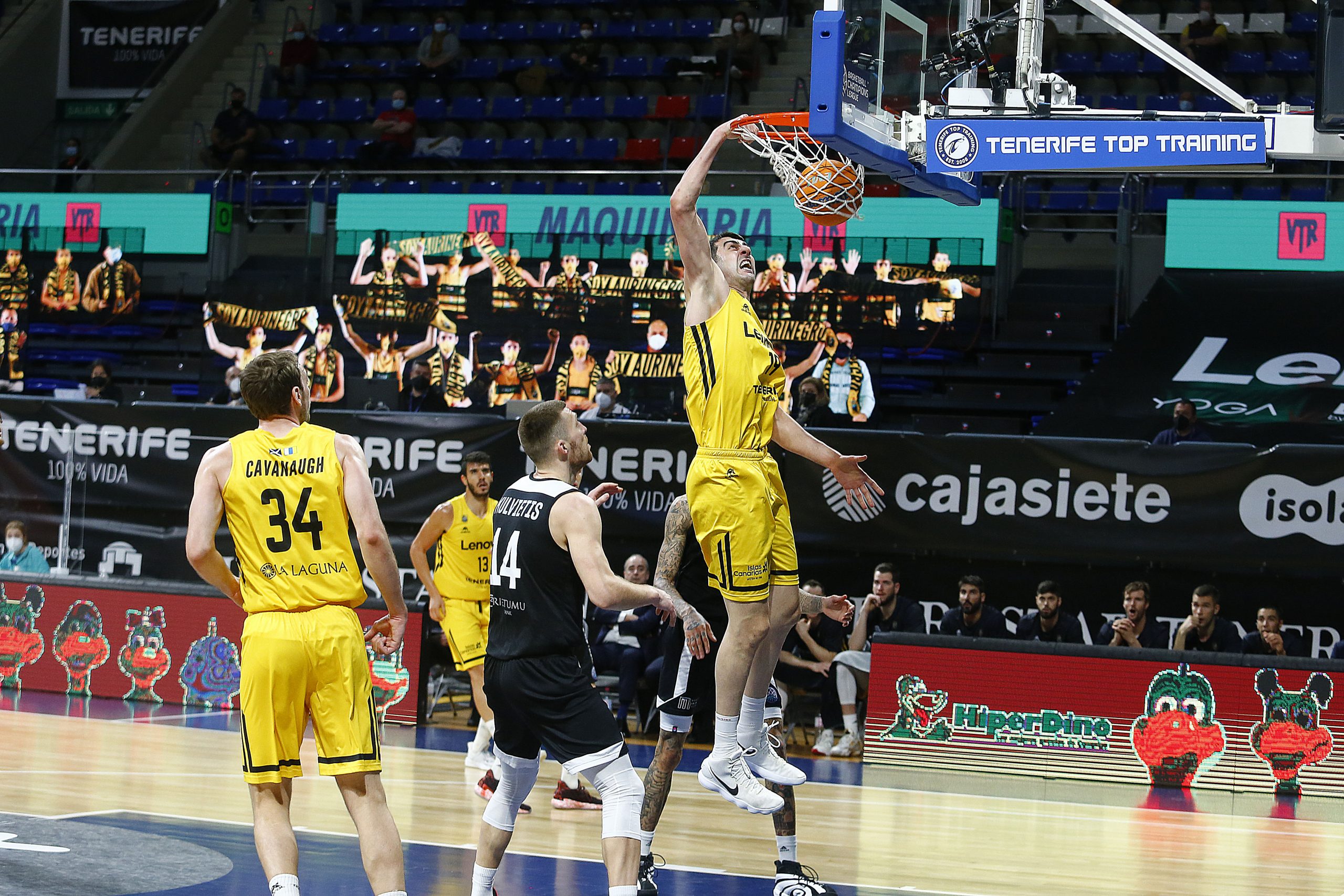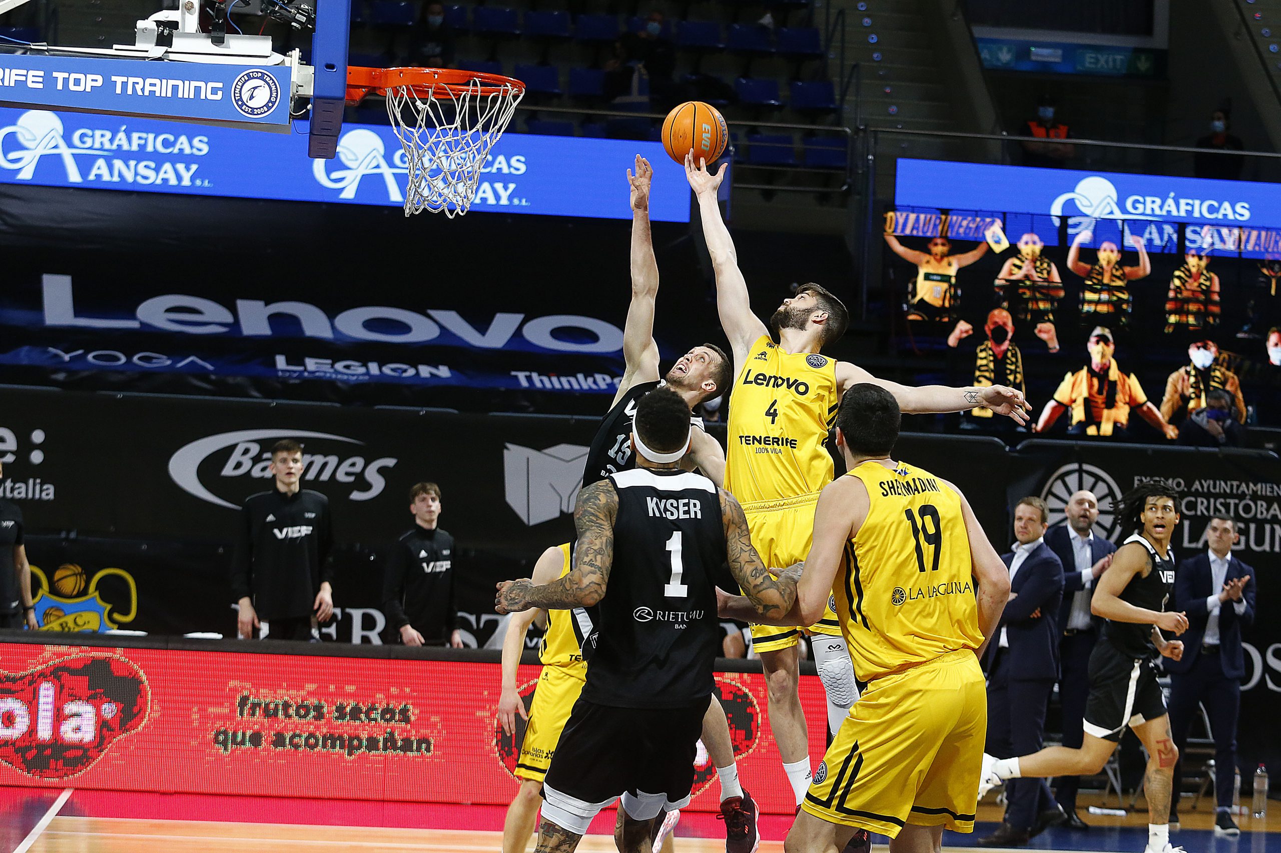 miércoles, 17 marzo, 2021 - 11:03Feliz reencuentro. El Lenovo Tenerife se impuso este miércoles al VEF Riga (77-64) en el regreso del público al Santiago Martín cinco meses después, en versión reducida y bajo un estricto protocolo anti Covid-19. Pese al aforo limitado, supo a gloria el aplauso y el apoyo de la afición aurinegra, que arropó a los suyos para que sumaran su segundo triunfo en el Sweet 16 de la #BasketballCL, tras tres jornadas disputadas.