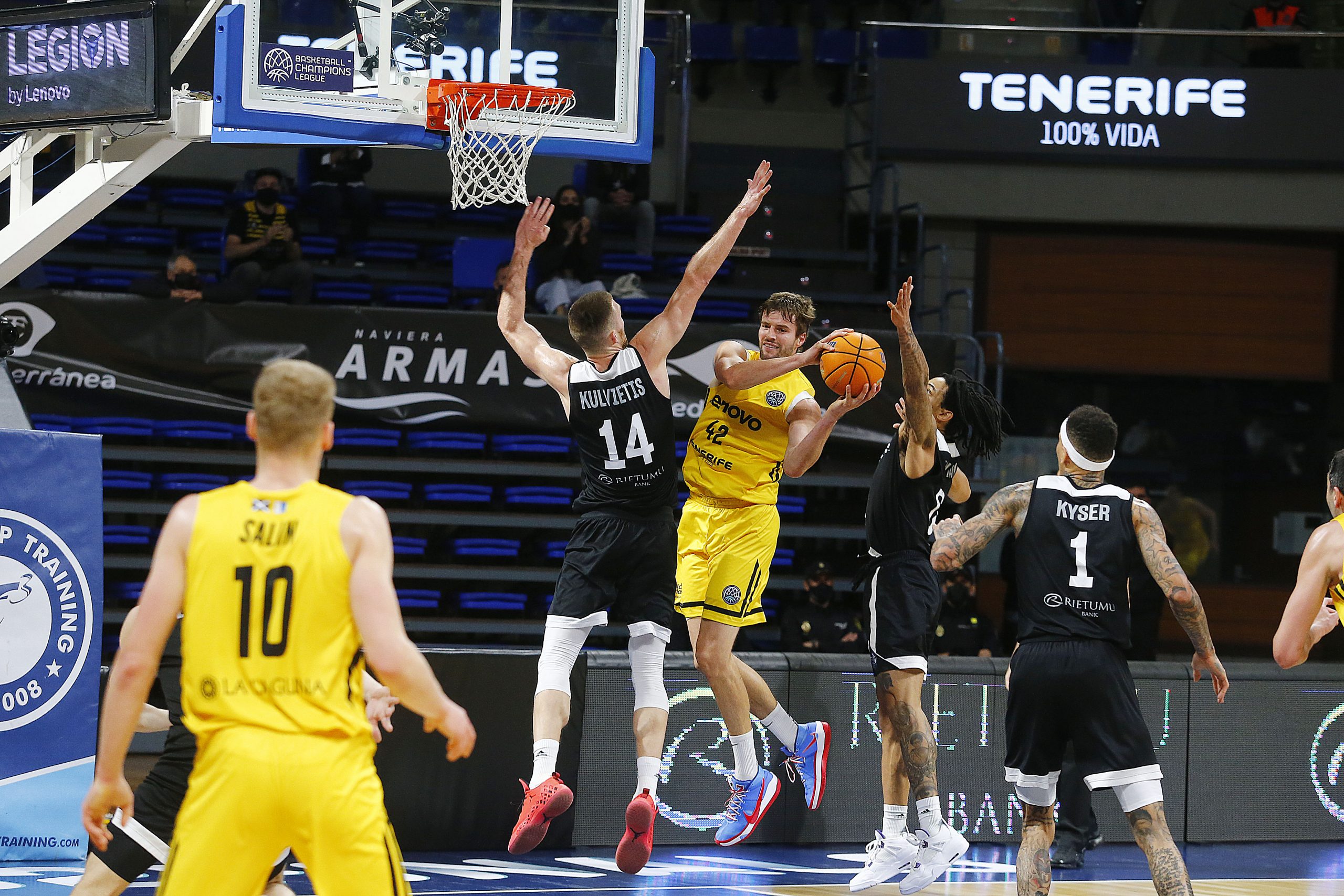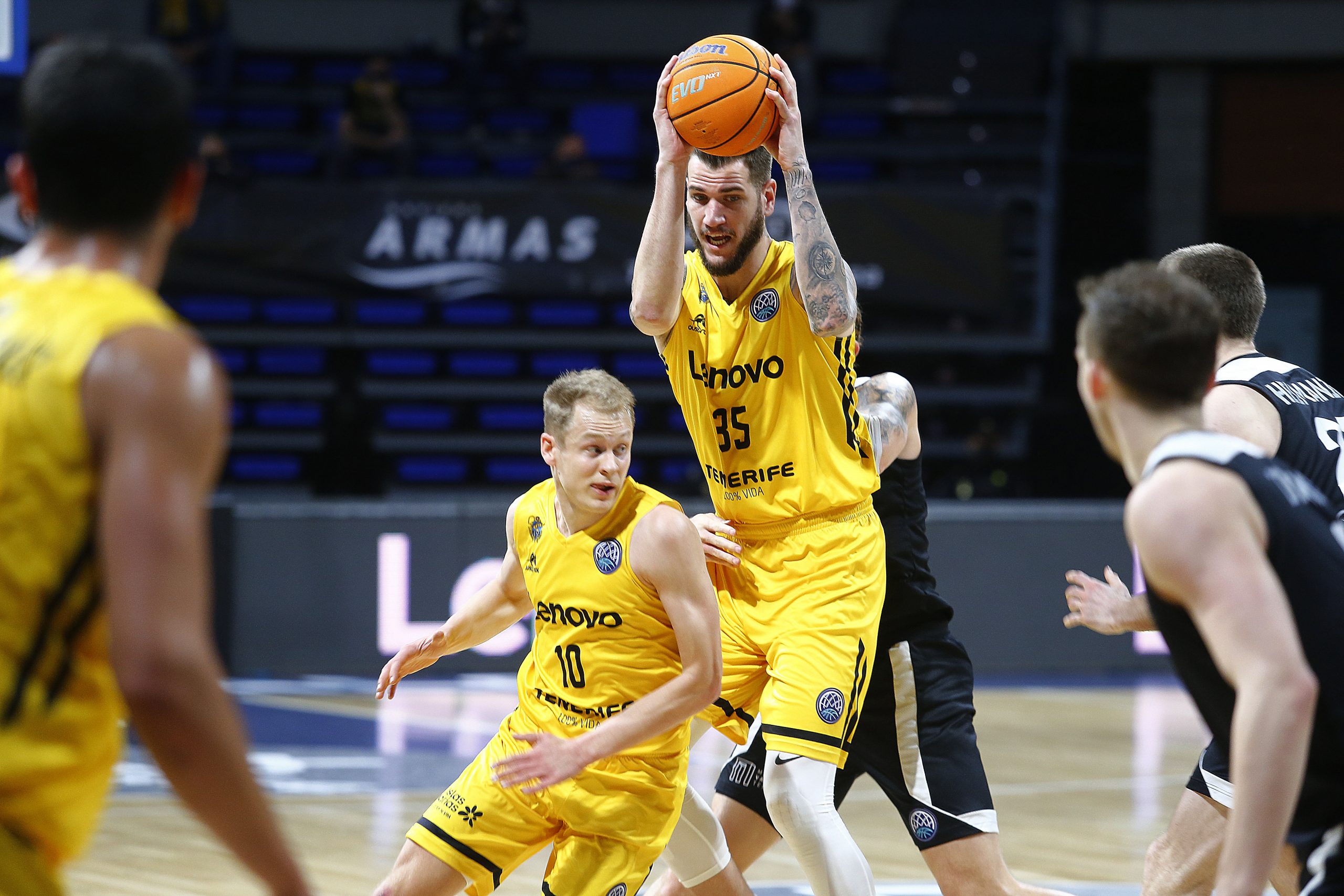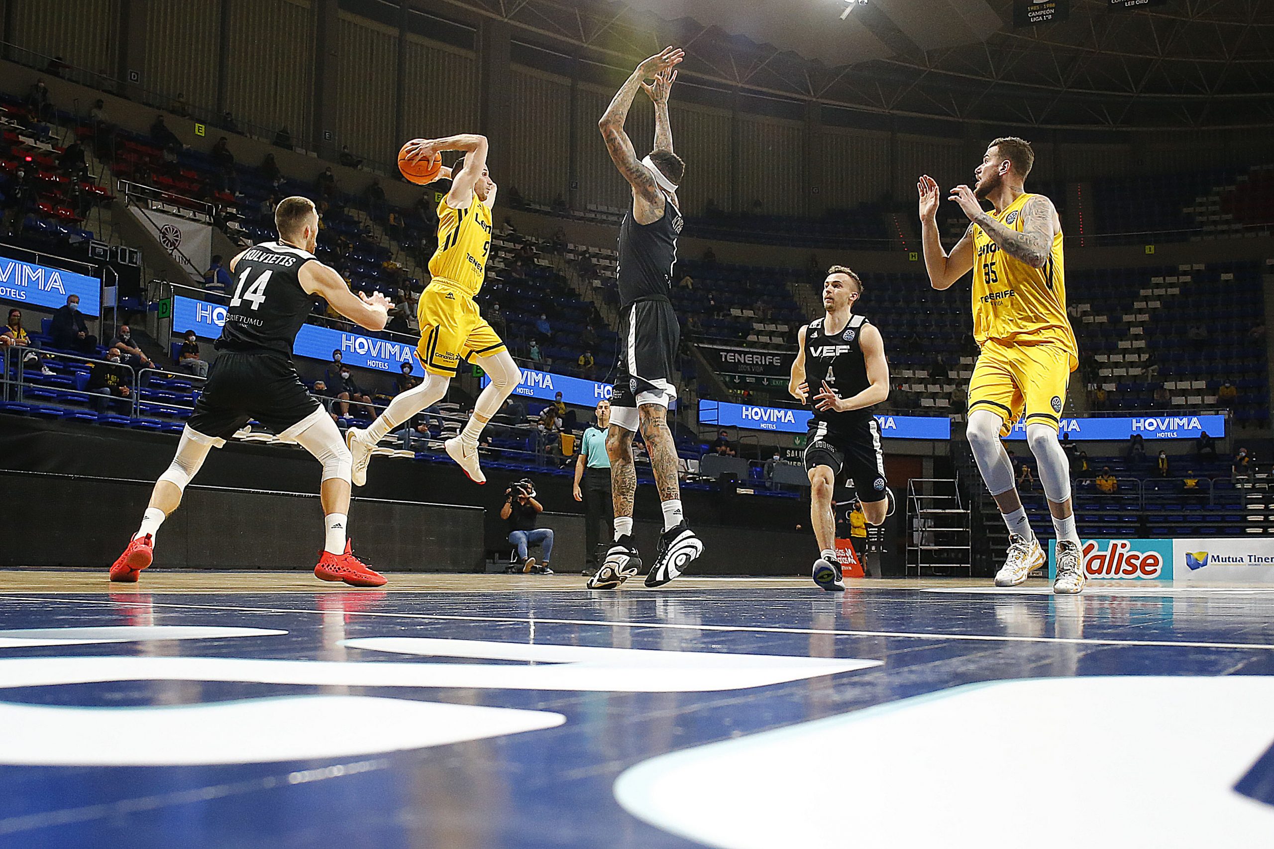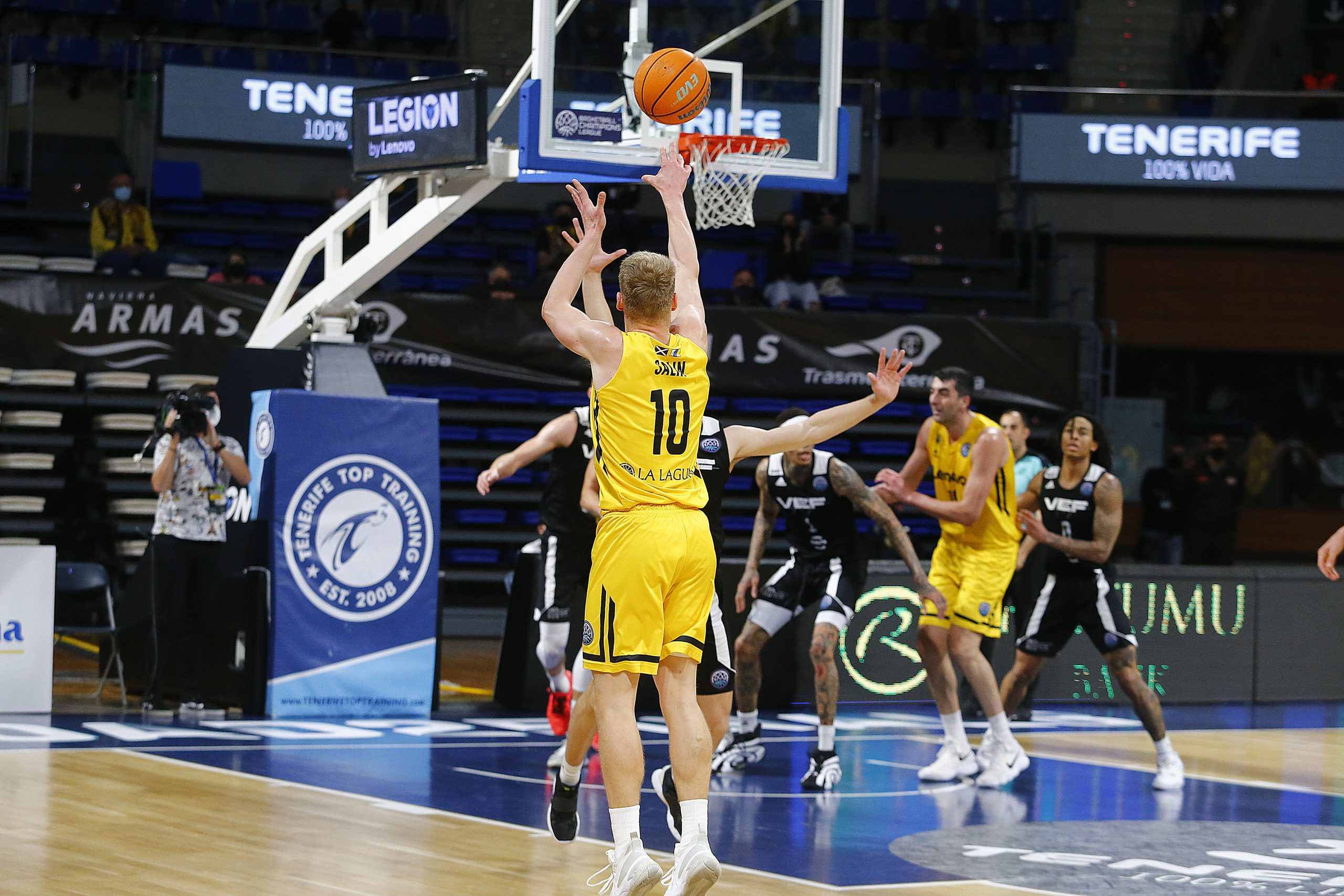 miércoles, 17 marzo, 2021 - 11:03Feliz reencuentro. El Lenovo Tenerife se impuso este miércoles al VEF Riga (77-64) en el regreso del público al Santiago Martín cinco meses después, en versión reducida y bajo un estricto protocolo anti Covid-19. Pese al aforo limitado, supo a gloria el aplauso y el apoyo de la afición aurinegra, que arropó a los suyos para que sumaran su segundo triunfo en el Sweet 16 de la #BasketballCL, tras tres jornadas disputadas.