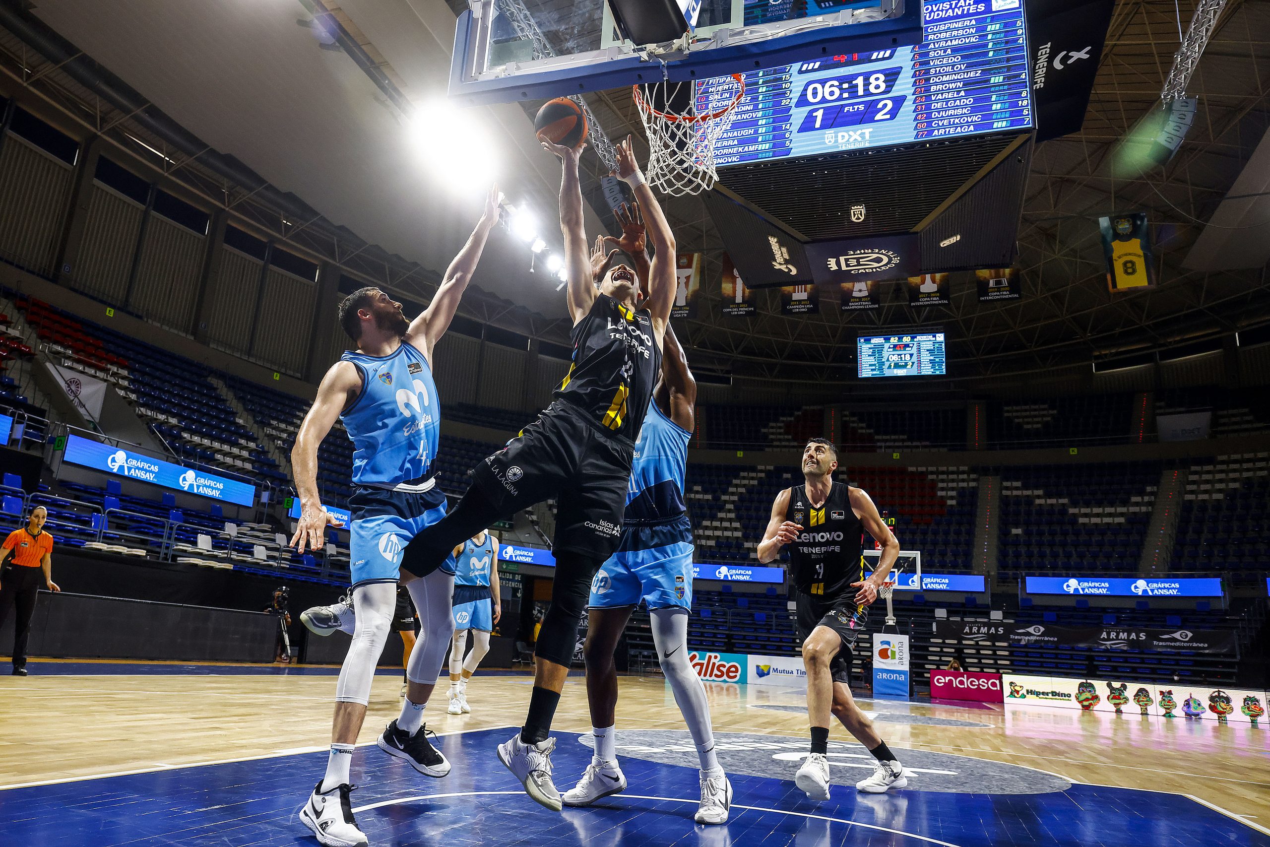 El cuadro canarista impuso su ley desde la puesta en escena, circulando el balón con mucho criterio y martilleando desde el 6,75 (15-7, tras dos triples de Salin y uno de Doornekamp). El Estu lo intentó amparándose en las segundas opciones en ataque y en el trío formado por Roberson, Djurisic y Delgado; pero lo cierto es que no bastaba para contrarrestar la variedad de recursos del Lenovo Tenerife.