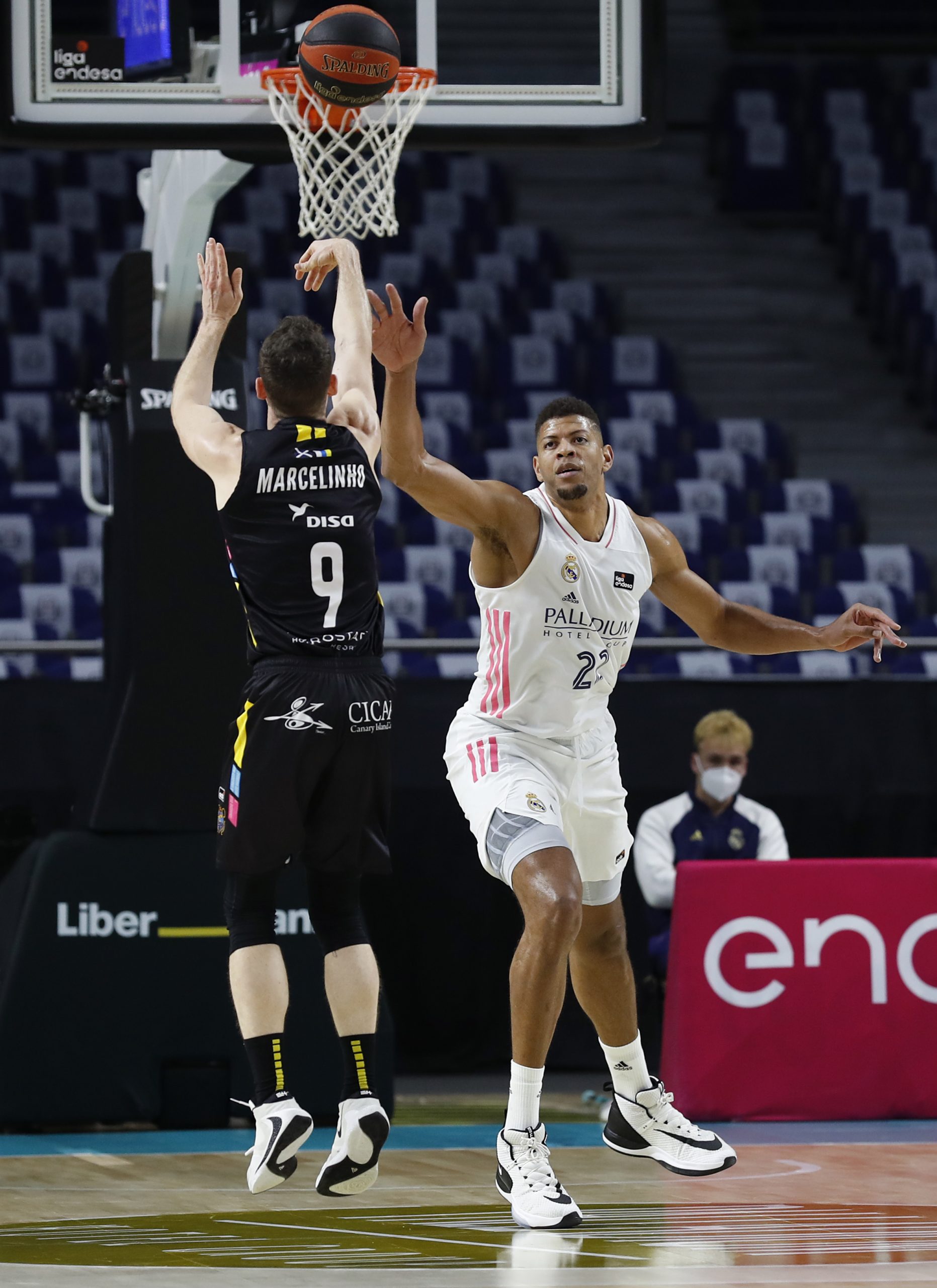 Con los aurinegros cerrando bien el rebote (19 capturas al descanso por 14 de su rival), el partido crecía entonces igualado. El Real Madrid se amparaba en los fogonazos de Alocén desde el 6,75, pero el Canarias le iba cogiendo la medida al encuentro, con Fitipaldo repartiendo con criterio (cinco asistencias al intermedio) y el casillero de las pérdidas bien controlado (tres en veinte minutos).