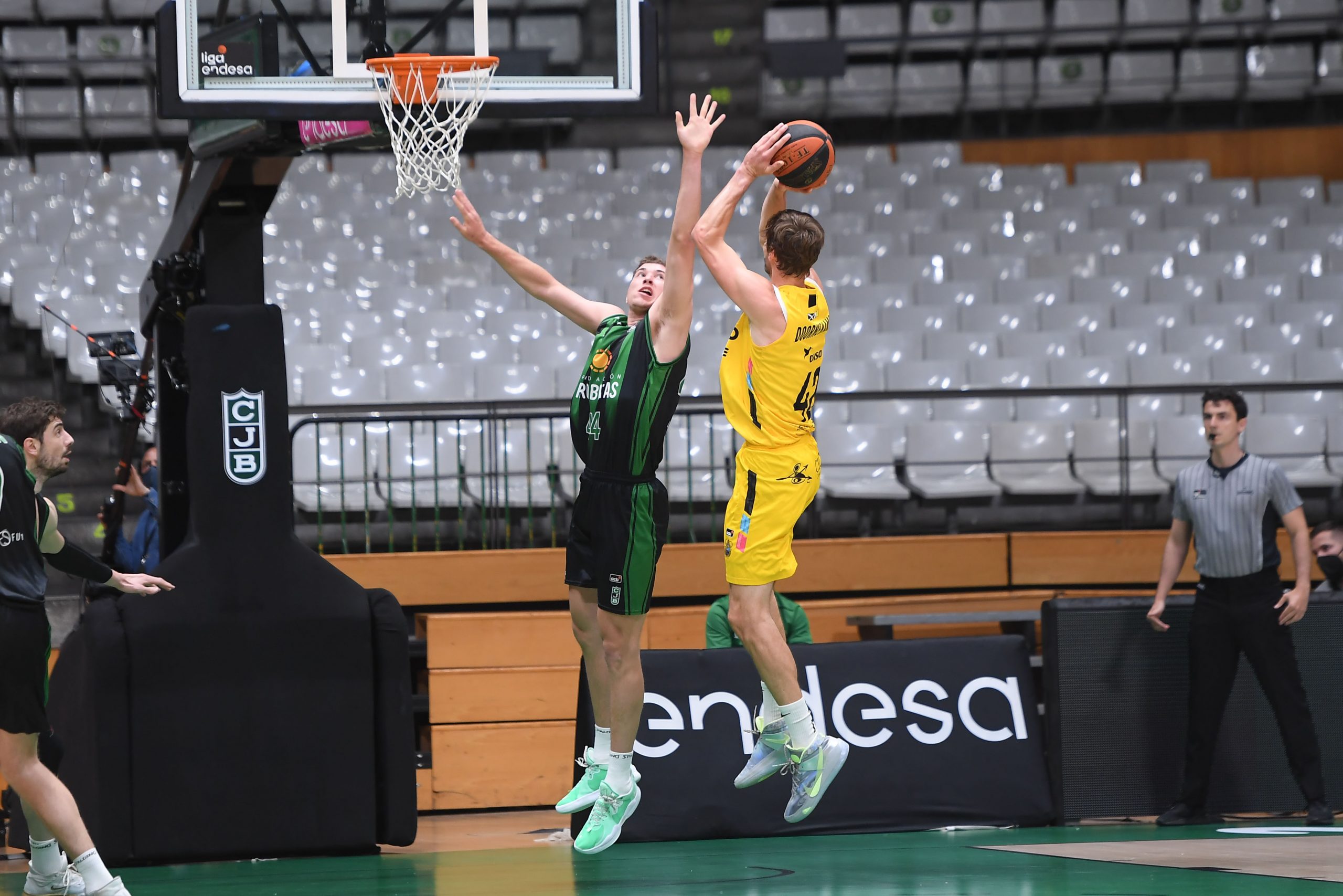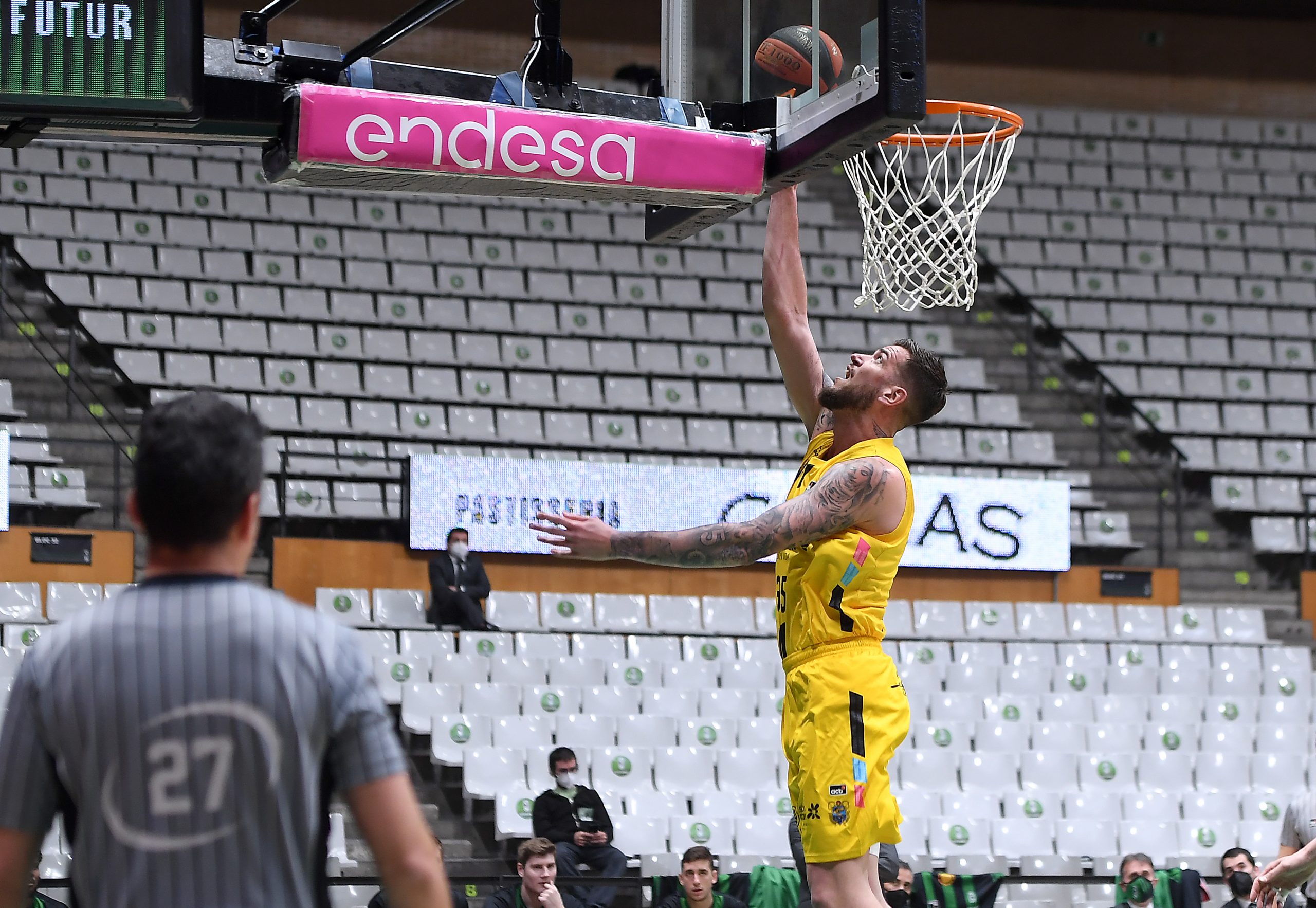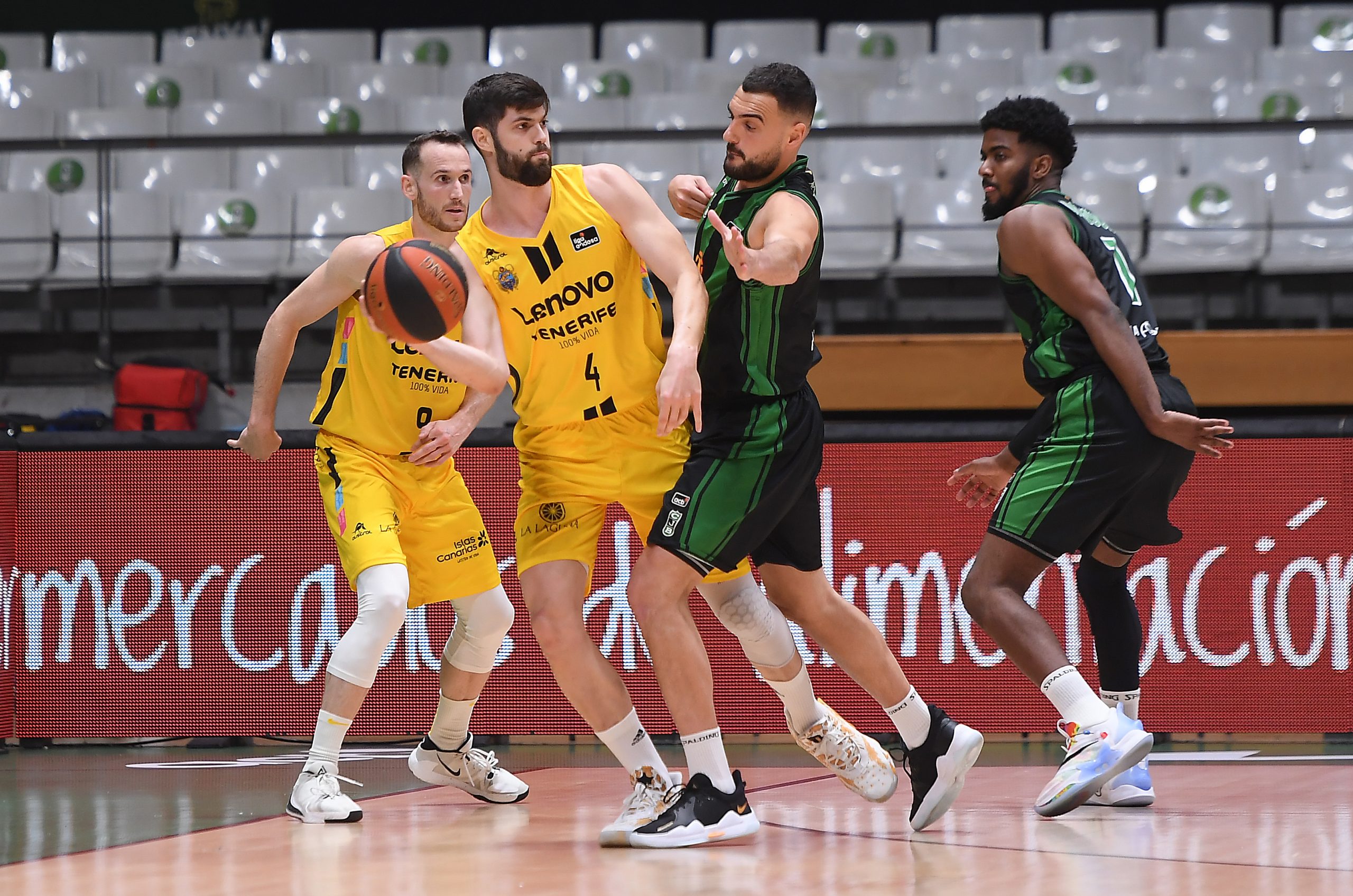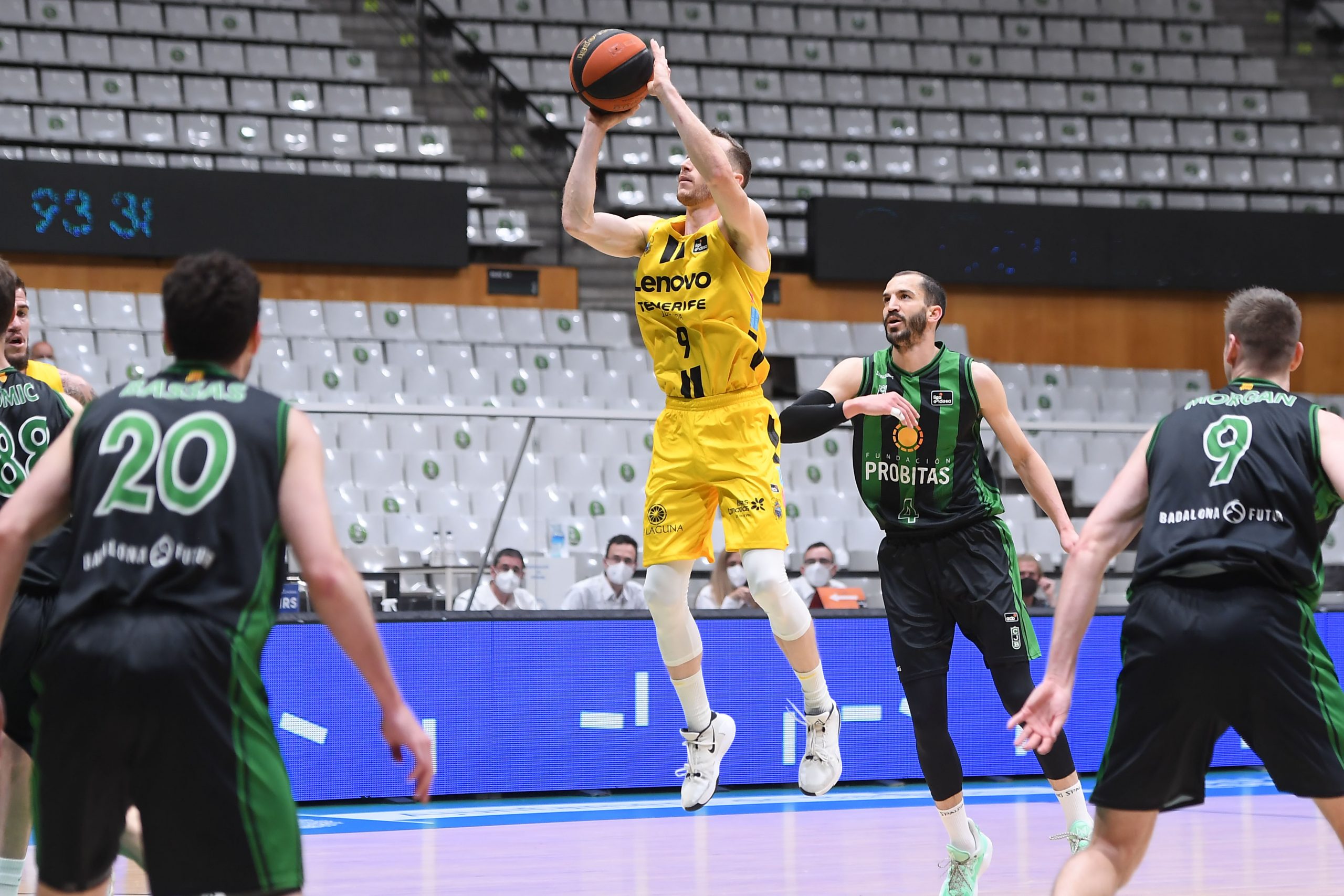 Más sólido y fluido que en el primer acto, el Lenovo Tenerife siguió estrechando el cerco (66-64) y logró, incluso, ponerse por delante camino del epílogo (74-76, min. 35). Dos triples de Aaron Doornekamp, uno de ellos tras un tapón espectacular a Bassas, alimentaban las opciones aurinegras (78-79 y 81-82), pero fue entonces cuando el Joventut, metido de lleno en la puja por entrar en las series finales, jugó mejor sus bazas.