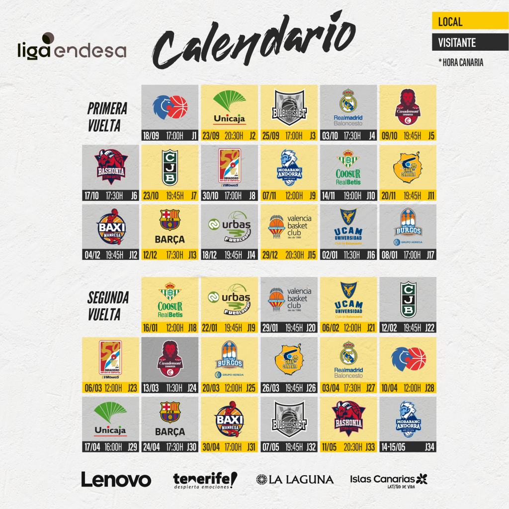 A continuación, los tinerfeños visitarán al Real Madrid (domingo 3 de octubre, 17;30); mientras que el primer cruce contra el Barça, actual campeón, se jugará en la 13ª entrega, el domingo 12 de diciembre, en la Isla, a las 17:30 hora insular. La visita del conjunto blanco al recinto de Los Majuelos será el domingo 3 de abril (17:30); mientras que el choque de los canaristas en el Palau está previsto para el domingo 24 de abril (17:30).