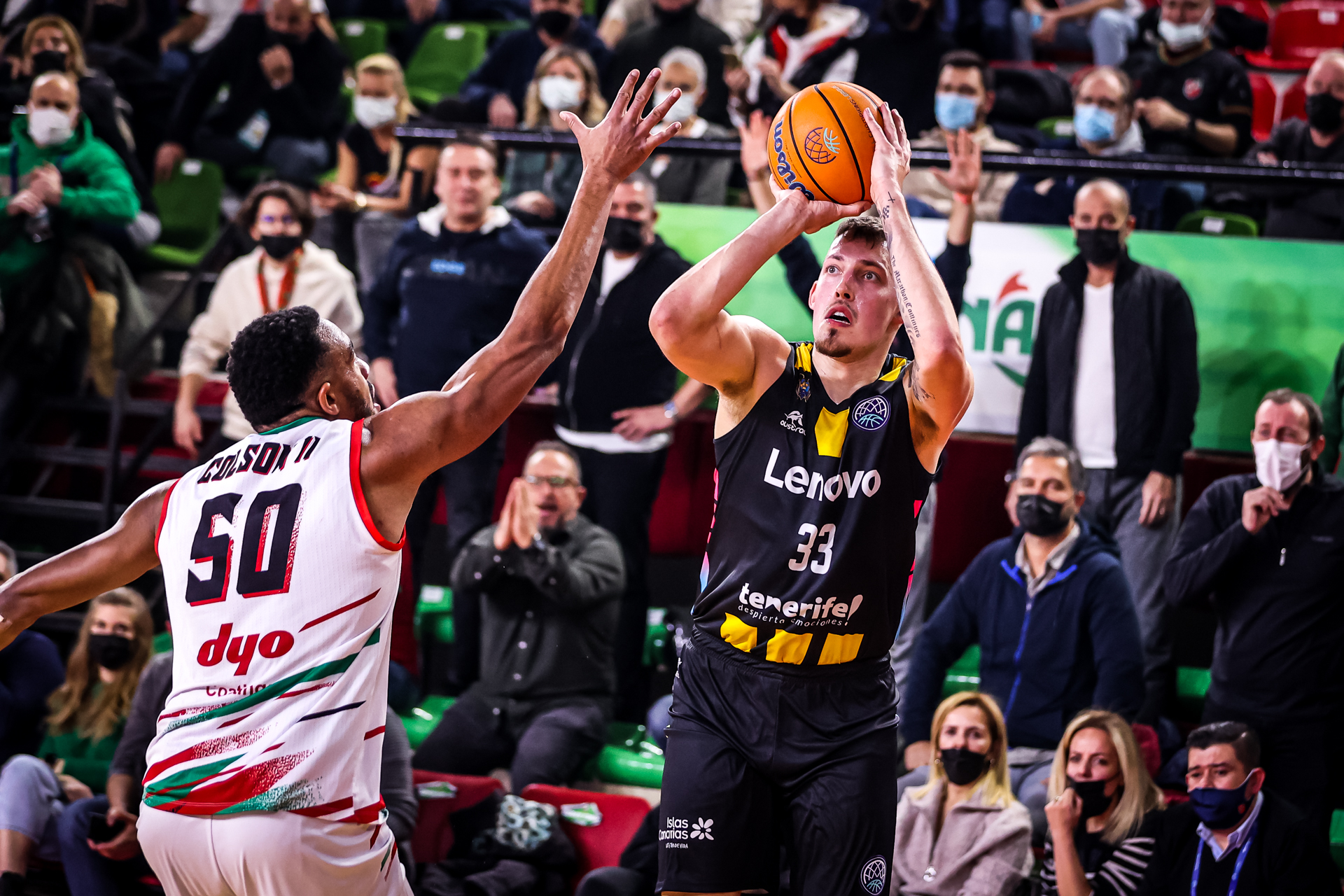 Con la llegada de los primeros triples, el Lenovo fue a más. Dos consecutivos de Sasu Salin estrechaban el cerco y un 2+1 posterior de Gio refrendaba la buena respuesta de los insulares (23-23). El conjunto lagunero movió el balón con mucho criterio y logró darle la vuelta al guión para irse al descanso cinco arriba (39-44).