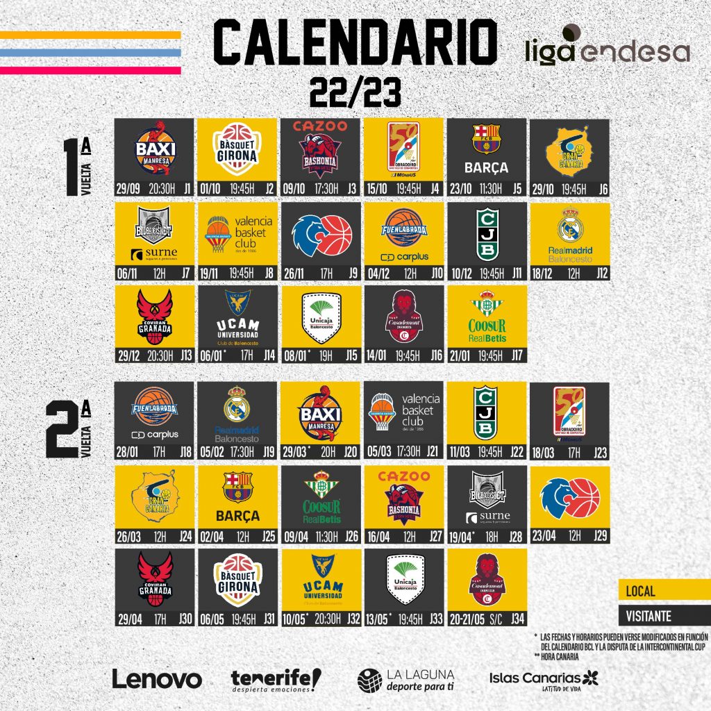 martes, 9 agosto, 2022 - 10:08El Lenovo Tenerife abrirá su Liga Endesa 2022-23 el jueves 29 de septiembre ante el BAXI Manresa (Nou Congost, 20:30 hora insular), según el calendario publicado hoy por la ACB. El grupo de Txus Vidorreta debutará en casa solo dos días después, el sábado 1 de octubre, ante el Básquet Girona (Santiago Martín, 19:45 hora canaria); para luego visitar al Cazoo Baskonia, en la tercera fecha, el domingo 9 de octubre (Buesa Arena, 17:30 hora insular).