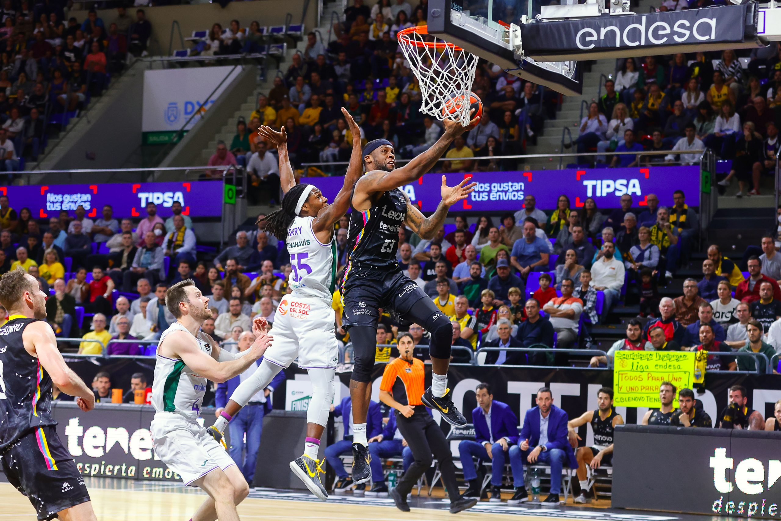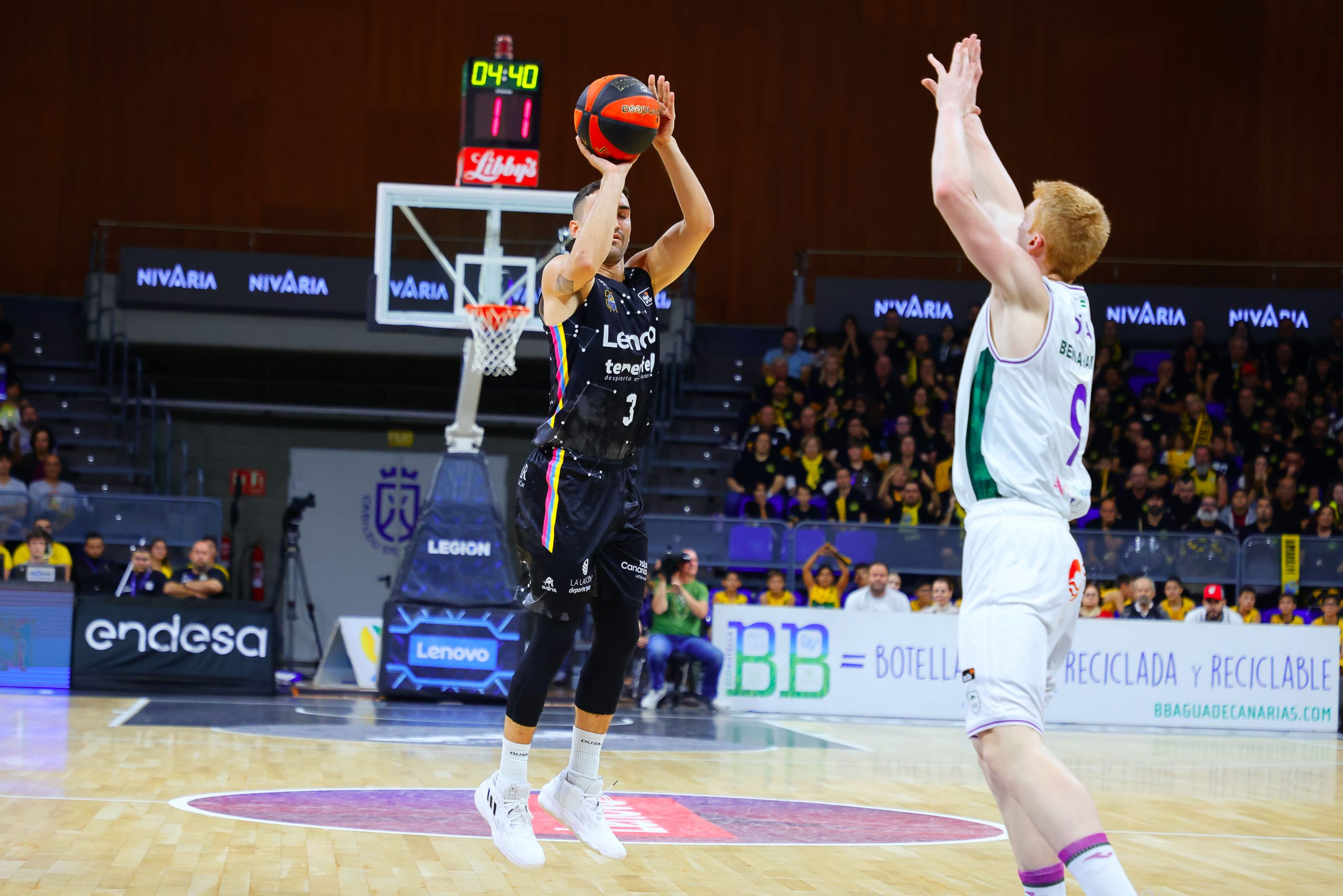 Fue tras el paso por vestuarios cuando el Canarias cambió el guión de manera radical. Los locales apretaron atrás y salieron con todo para firmar un parcial de 8-0 (49-46), que más allá de devolverle el mando del partido fue un aviso importante a navegantes. Las sensaciones crecían ya en clave canarista. Con el Santiago Martín volcado, los triples de Sasu Salin y un inmenso trabajo atrás, dispararon al Lenovo Tenerife (61-53).