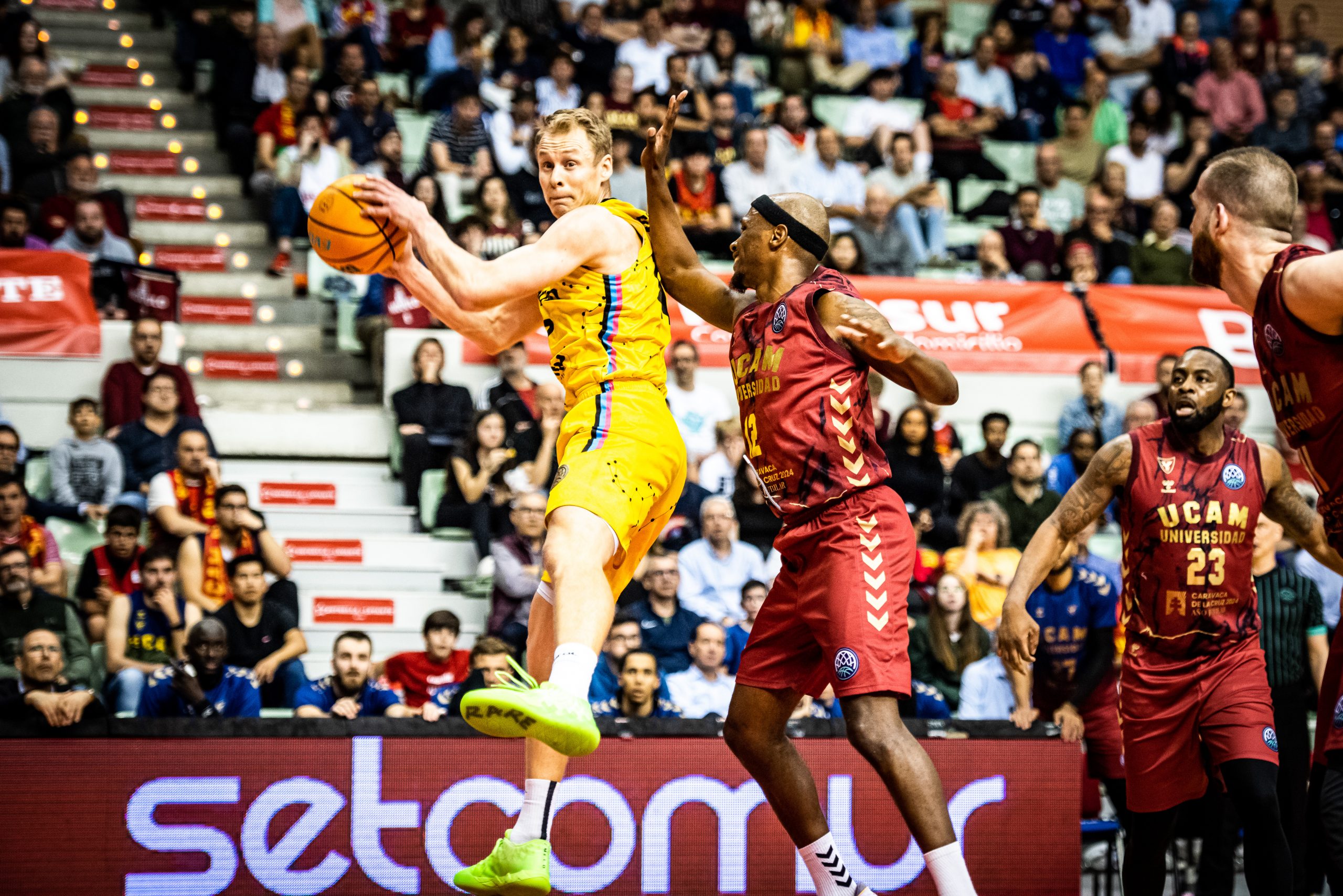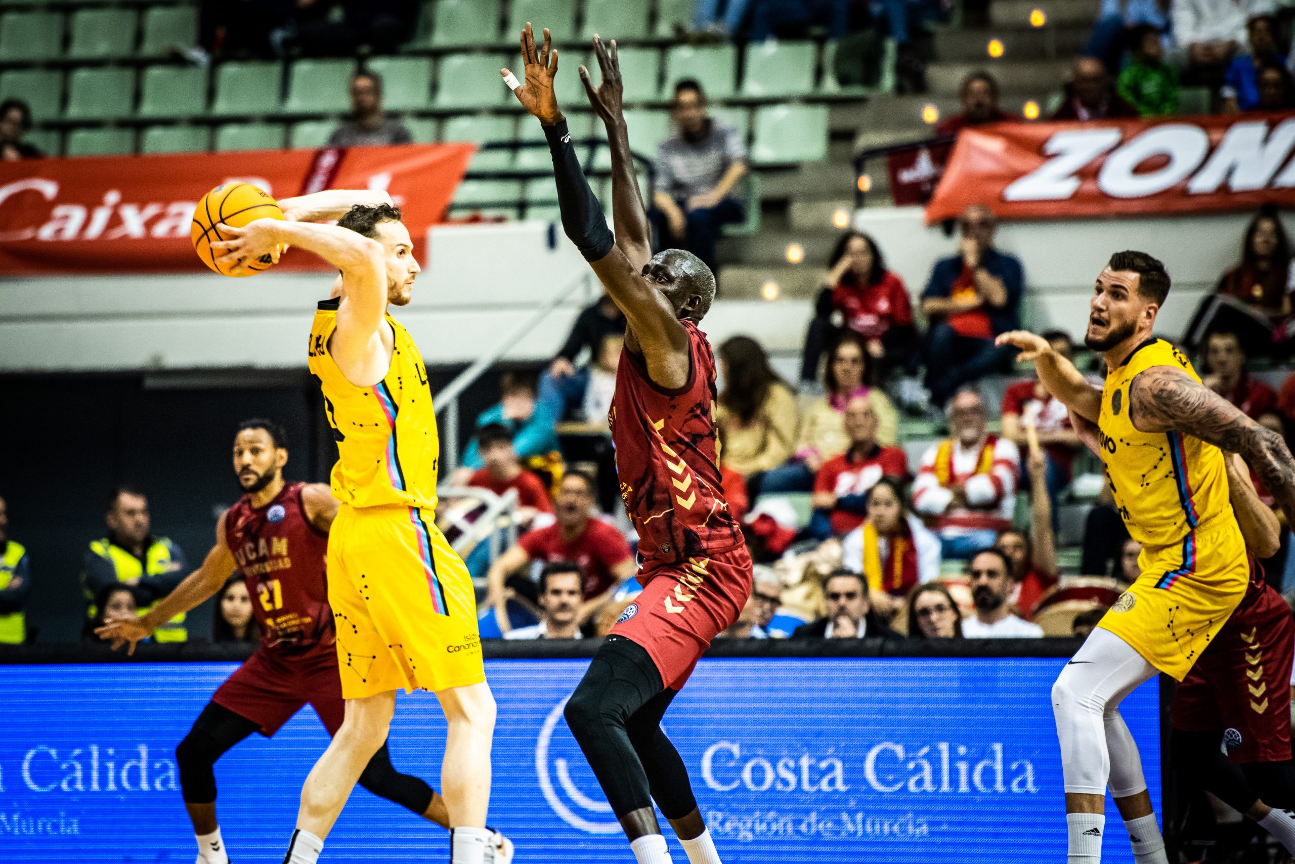 Arrancó más enchufada la escuadra murciana, que exprimió incluso un par de triples abiertos de sus interiores Pustovyi y Diop para empezar a abrir brecha en el electrónico (17-11). La irrupción de Trice y Jelinek lanzó aún más a los locales (23-12), mucho más atinados de cara al aro (firmaron un 4/4 en tiros de dos y un 5/8 en triples en los primeros ocho minutos).