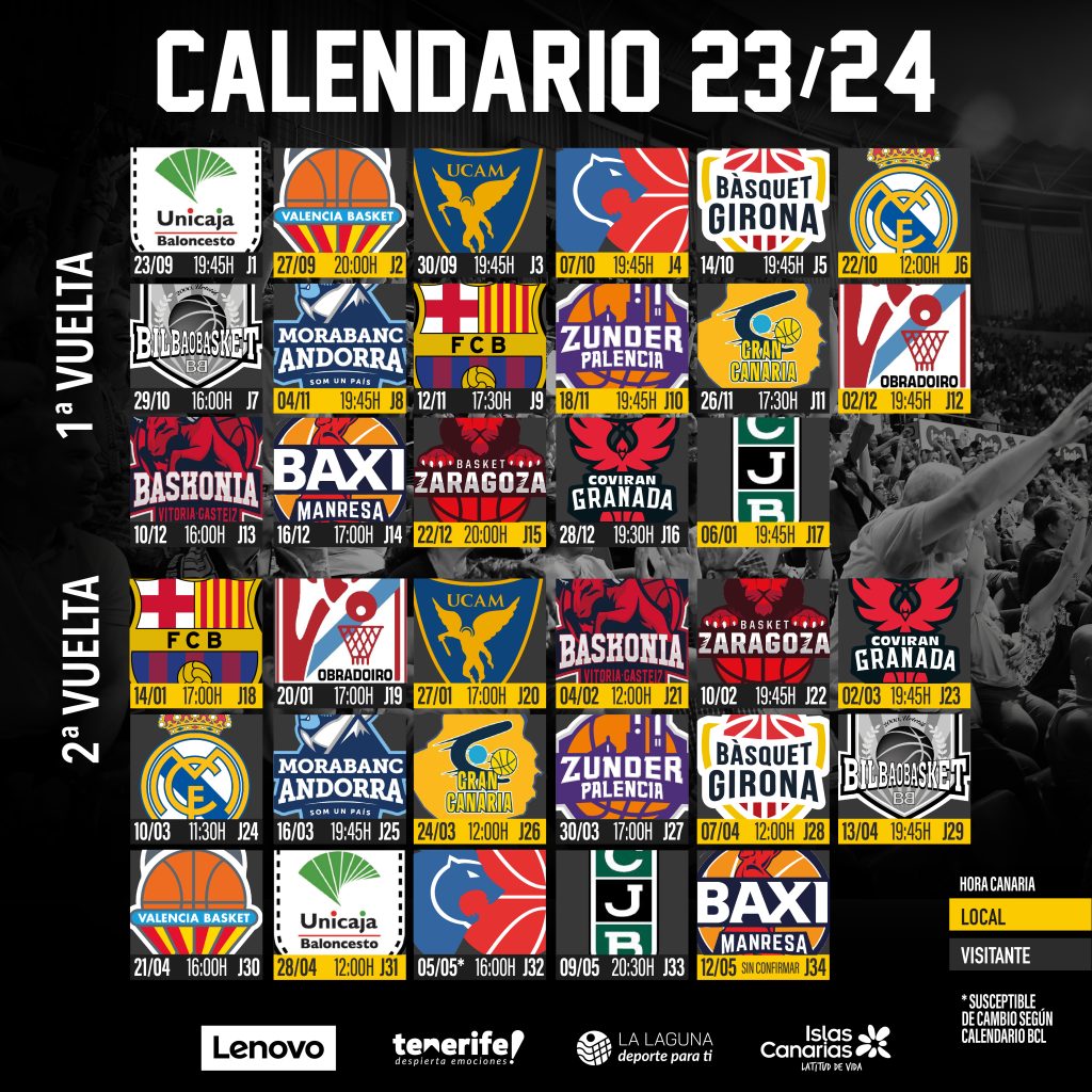 El Lenovo Tenerife comenzará la Liga Endesa 23/24 el sábado día 23 de septiembre, a domicilio y ante el Unicaja Málaga (Martín Carpena, 19:45 hora insular), según el calendario publicado este jueves por la ACB.