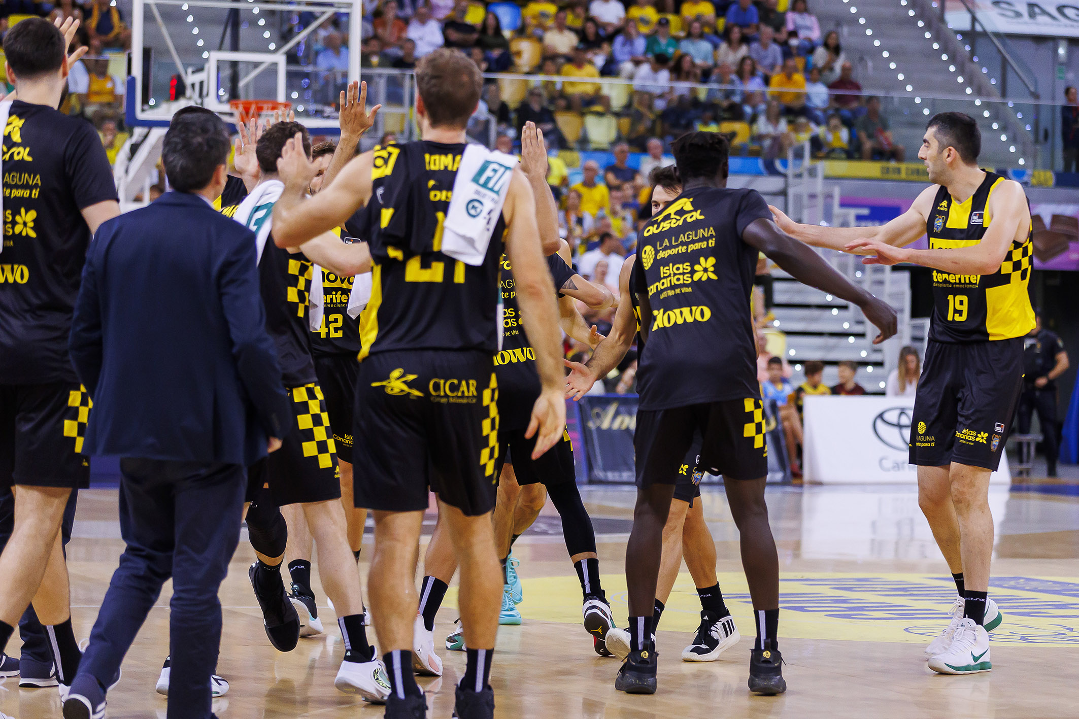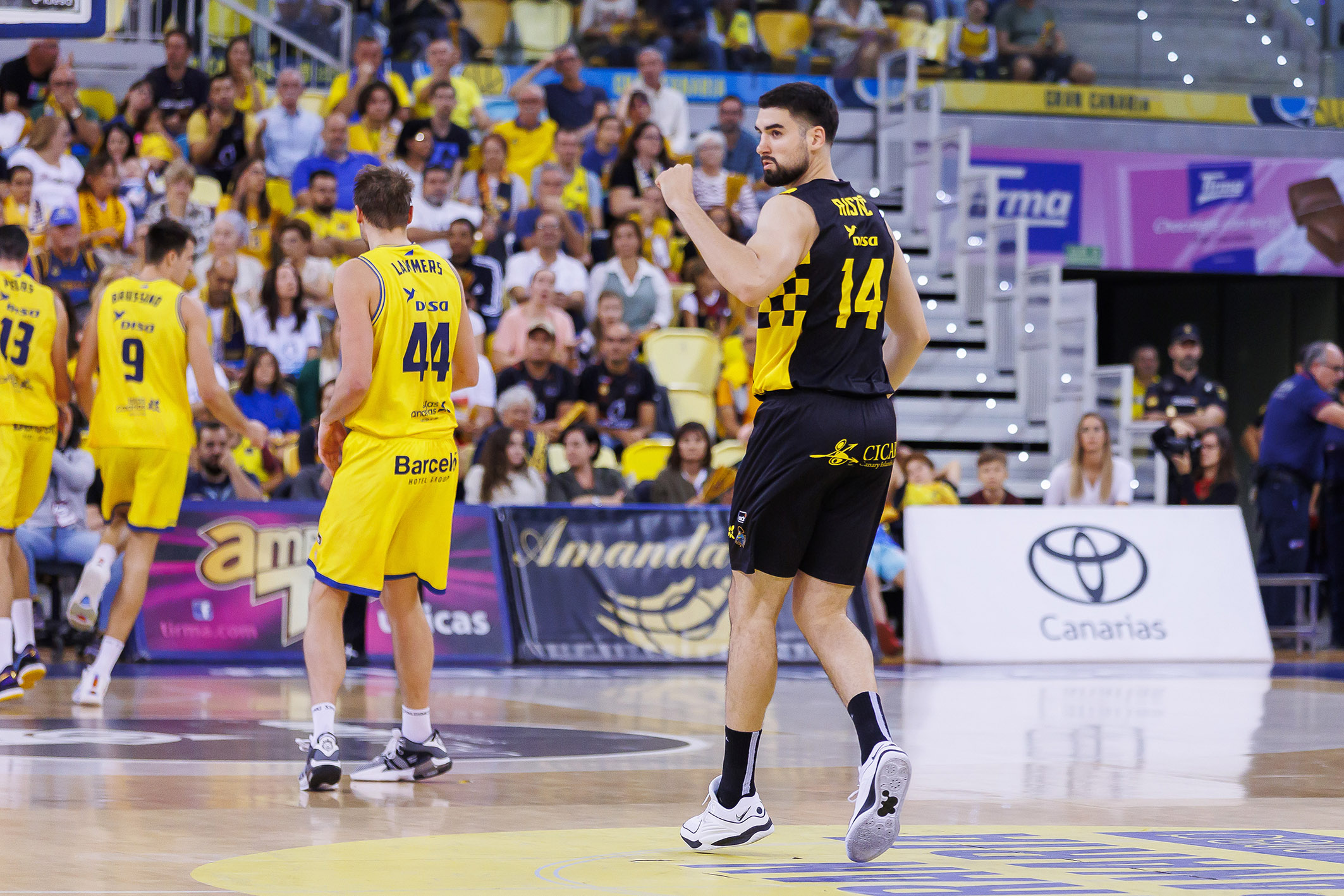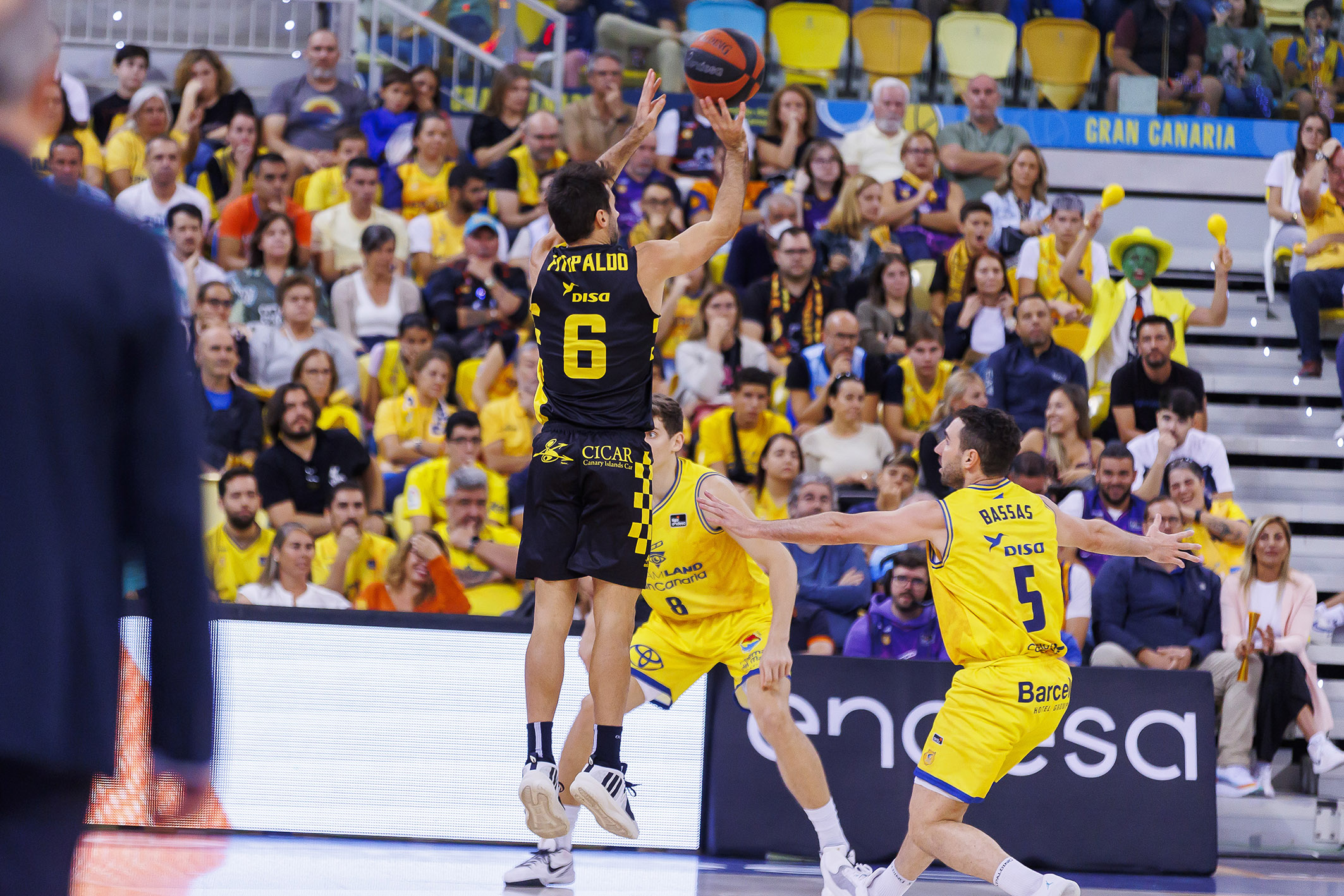 El conjunto tinerfeño sujetaba bien a los principales referentes anotadores del Granca y llevaba además el reto a su territorio, al son de Marcelinho Huertas (cinco asistencias al descanso) y de un Gio infalible en las continuaciones (16 puntos sin fallo al intermedio).