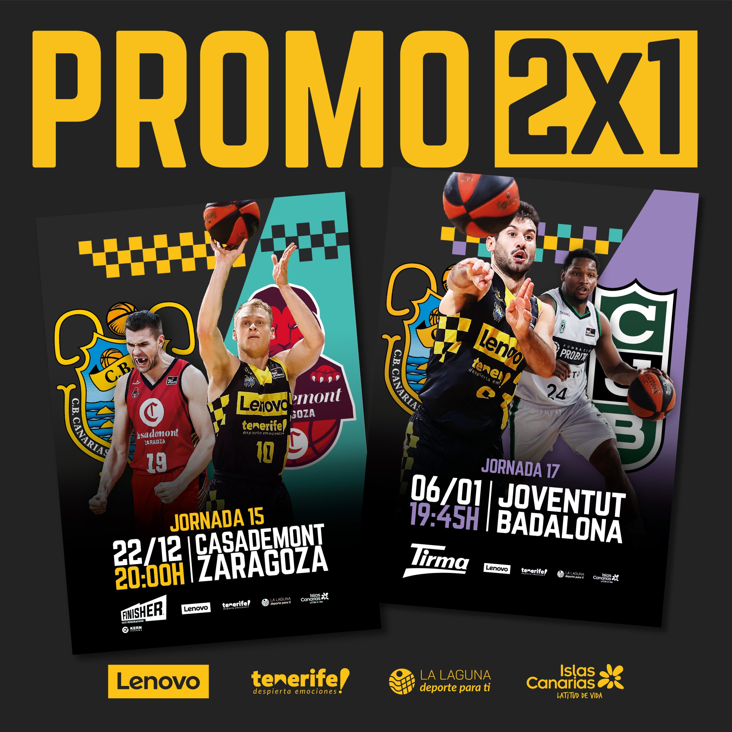 La promoción en cuestión incluirá el choque de este viernes 22 de diciembre ante el Casademont Zaragoza (20:00 hora canaria) y el del sábado 6 de enero, ante el Joventut de Badalona (19:45 hora canaria). Habrá además precios especiales para los abonados que quieran aprovechar también la iniciativa.