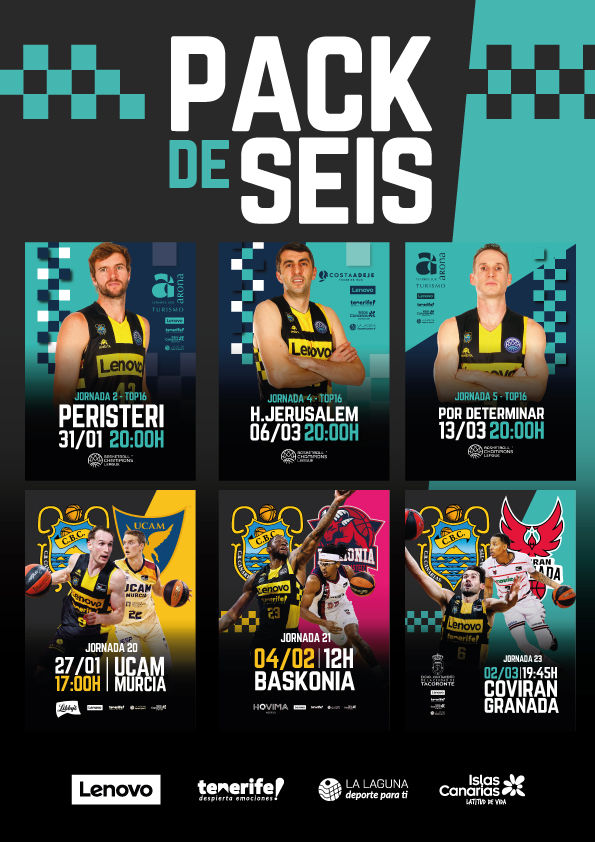 La promoción, válida hasta fin de existencias, inlcuirá los encuentros de Liga Endesa ante el UCAM Murcia (sábado 27 de enero, 17:00 hora insular), Baskonia (domingo 4 de febrero, 12:00) y Covirán Granada (sábado 2 de marzo, 19:45 ); así como los tres correspondientes al Top 16, ante el Peristeri  (miércoles 31 de enero, 20:00), el Hapoel Jerusalem (miércoles 6 de marzo, 20:00) y el ganador del Pinar-Karsiyaka-Río Breogán (miércoles 13 de marzo, 20:00).