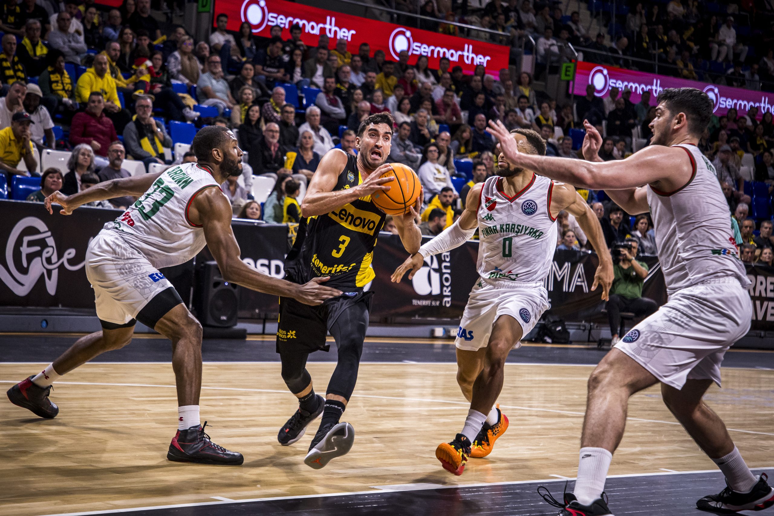 El Pinar Karsiyaka atacaba con confianza y tiraba de talento para irse al segundo cuarto con ventaja (21-24, min. 11), tras aprovechar un par de 2+1. Irrumpió entonces la figura de Tim Abromaitis, que con tres triples sin fallo y un mate al contraataque amagaba con abrir brecha para los locales.