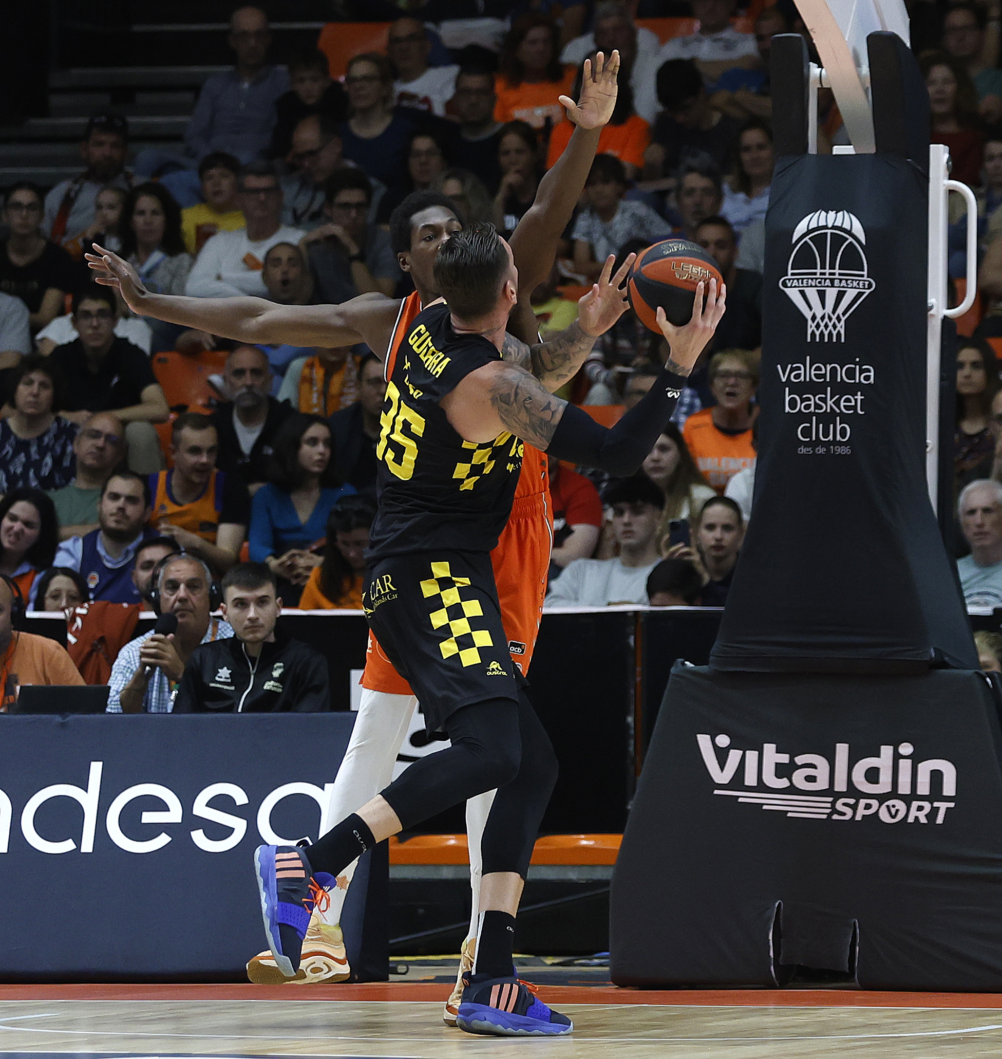 Arrancó el pulso con una declaración de intenciones del Valencia, que sacó de entrada un quinteto muy físico y con muchos centímetros (Jones, Ojeleye, Anderson, Pradilla y Davies), lo que se tradujo en varios balones al poste bajo y en segundas opciones en ataque (hasta cinco rebotes ofensivos de los locales al cierre del primer cuarto).