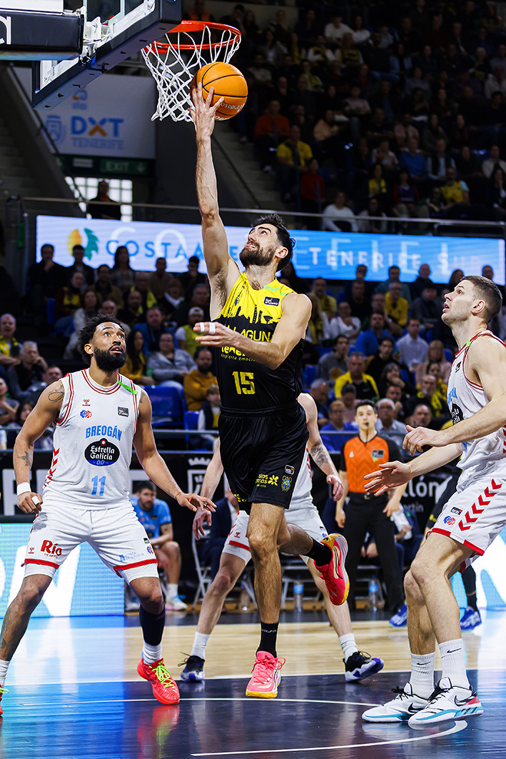 Varias acciones de mérito de Fran Guerra, primero; otro fogonazo made in David Krämer, después; y una transición sublime del tercer al último cuarto de Gio Shermadini en la pintura encarrilaron ya del todo el triunfo y desataron la fiesta entre la afición aurinegra. Los laguneros ampliaron su renta hasta los 23 puntos (83-60) y a partir de ahí, pese a los esfuerzos del Breogán por volver a meterse en partido, la victoria insular ya no peligró.
