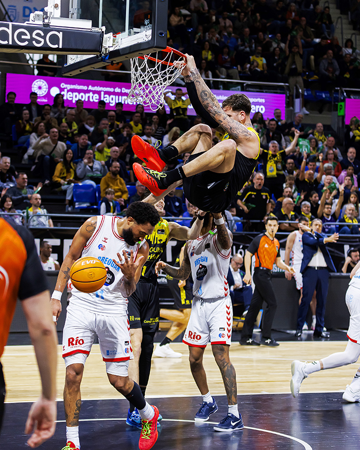 Las continuaciones para Fran Guerra y Gio Shermadini (40 de valoración entre los dos), así como el criterio aurinegro para circular la pelota y exprimir el extra pass cimentaron un parcial de 10-0 camino del descanso, interrumpido solo por un triple de Quintela antes de la pausa (49-41). Tras el paso por vestuarios y a pesar del 0-4 inicial de los visitantes, La Laguna Tenerife no dejó que la confianza y determinación de su adversario creciera más de la cuenta.