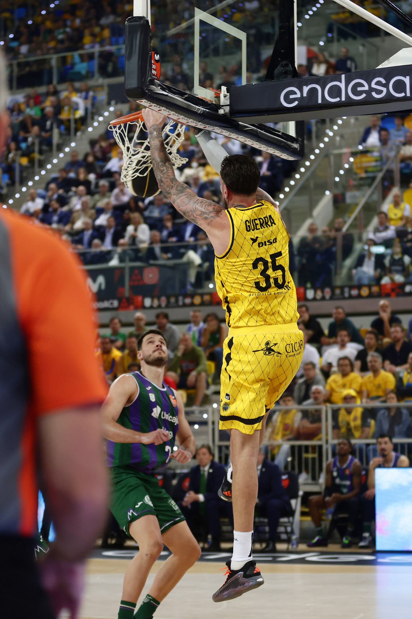 La escuadra aurinegra mejoró prestaciones en el rebote (16-17 al descanso) y el georgiano lideró una reacción que devolvía el partido al alambre. En ese contexto, el Canarias amagó incluso con coger una ventaja significativa (23-28, tras un triple de Joan Sastre), si bien los errores desde el tiro libre (7/13 al intermedio) impedían que su mejoría fuera aún más contundente. Fran Guerra asumió el relevo de Gio y los de Txus Vidorreta lograron irse al intermedio uno arriba (38-39).