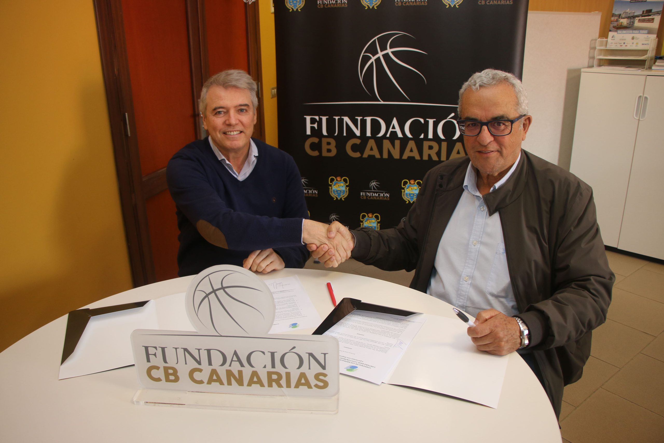 El presidente de la Fundación CB Canarias, Santiago Cacho, y el presidente de Apedeca (Asociación de ayuda a personas dependientes en Canarias), Iván Márquez, han firmado un acuerdo por el que ambas entidades colaborarán en el impulso de la inclusión desde el baloncesto.