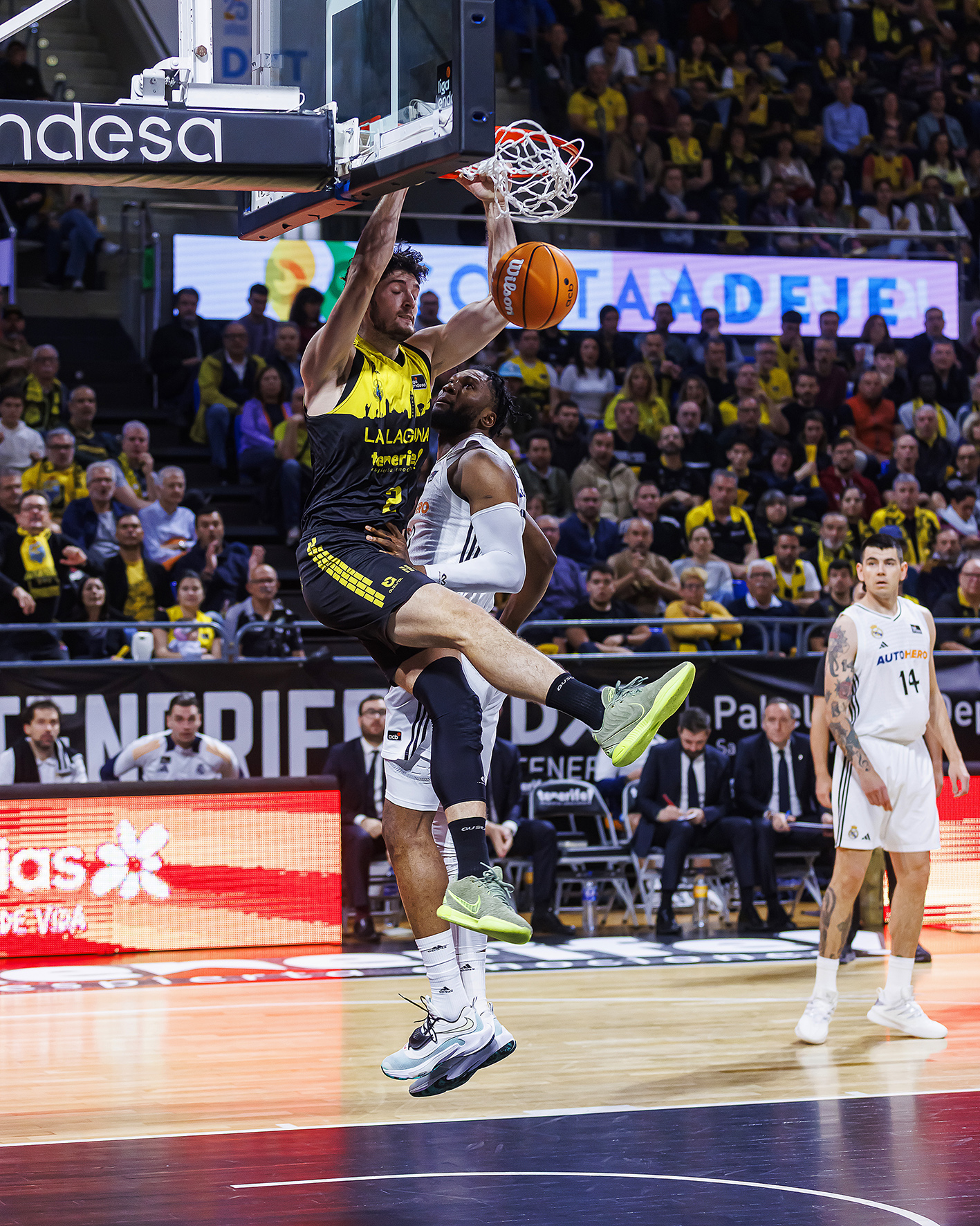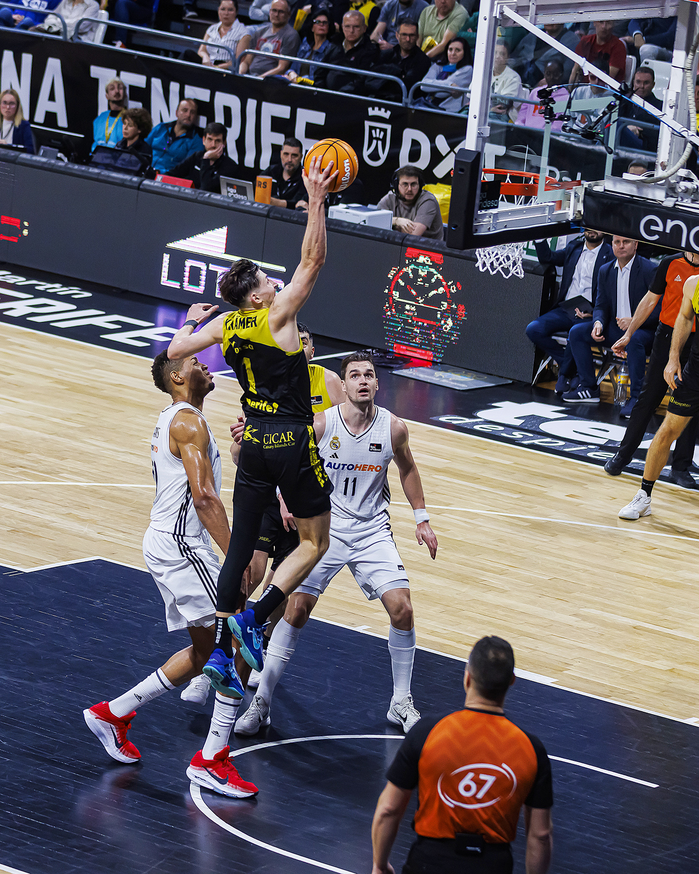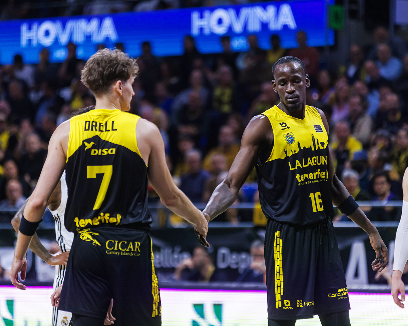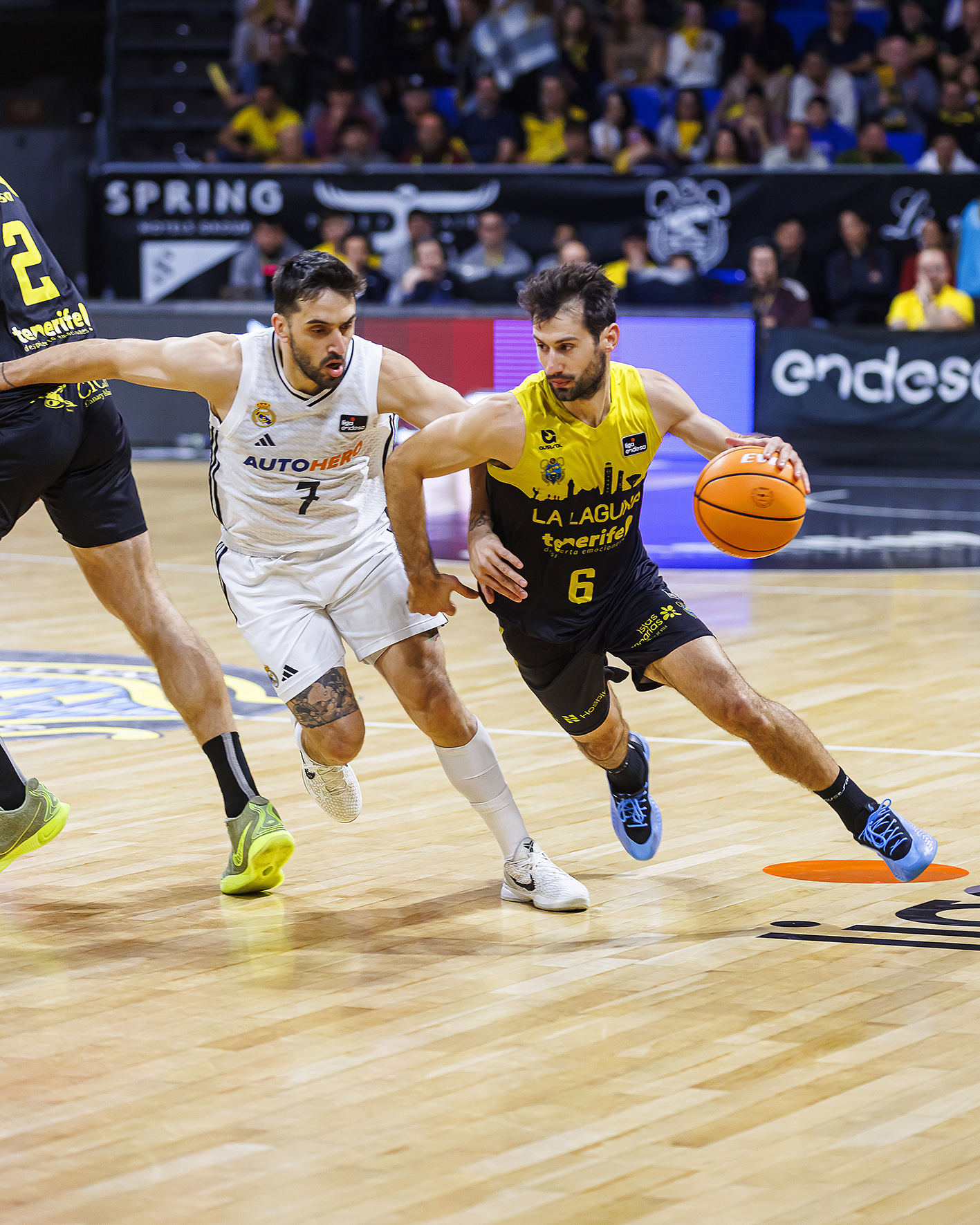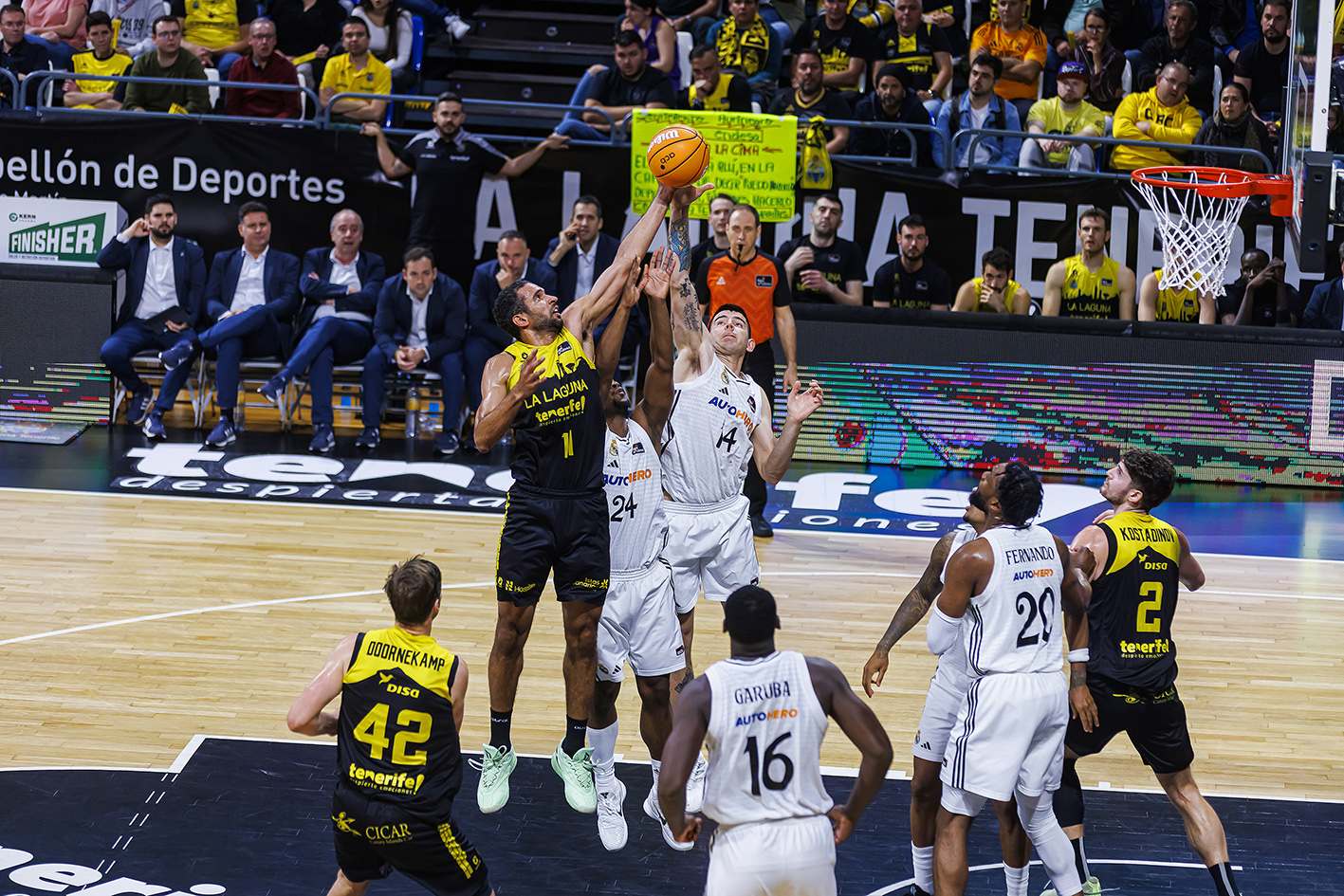 El Real Madrid imponía su físico y castigaba las pérdidas locales (3-11). Lo intentó La Laguna Tenerife con la irrupción en pista de Marcelinho Huertas y Gio Shermadini (13-15), pero un parcial de 0-9 en la transición del primer al segundo cuarto lanzaba a los visitantes en el electrónico (15-30).