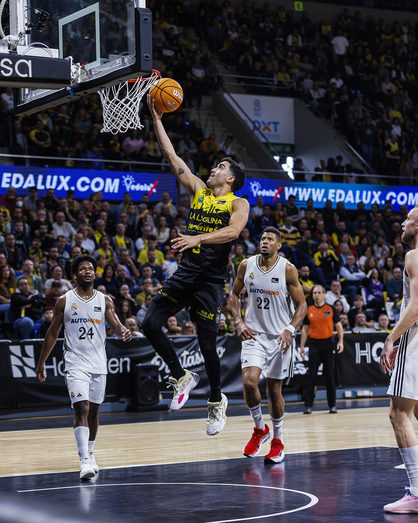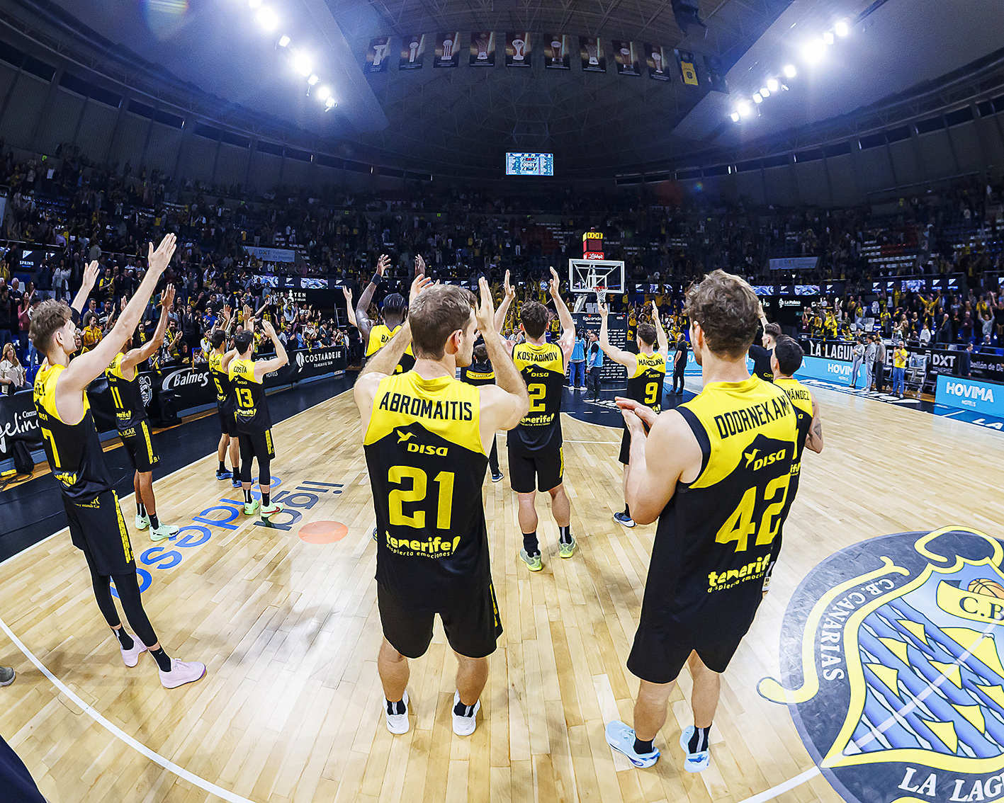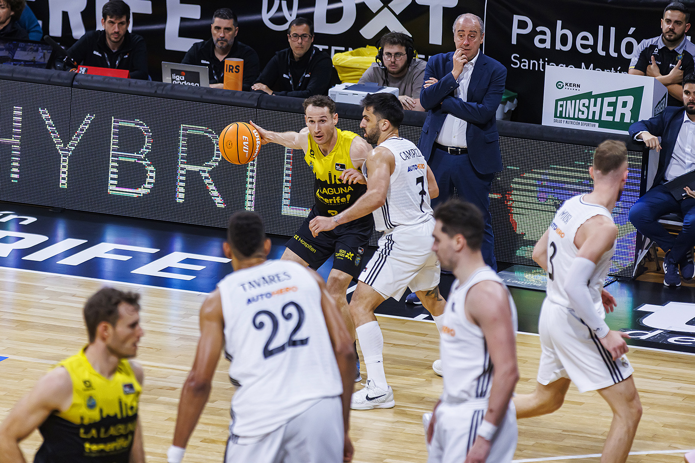 Tavares, primero; y Feliz y Mayes, después, hicieron mucho daño a los anfitriones (25-42), que pese a todo, no se rindieron. Cinco puntos consecutivos de Henri Drell y cuatro tiros libres de Gio minimizaron daños camino del descanso (34-45). Tras el paso por vestuarios, La Laguna Tenerife hizo lo indecible por apretar la contienda, pero se tropezó siempre con la respuesta del adversario o con decisiones del trío arbitral que provocaron el enfado del respetable.