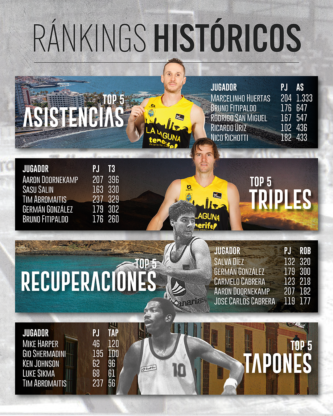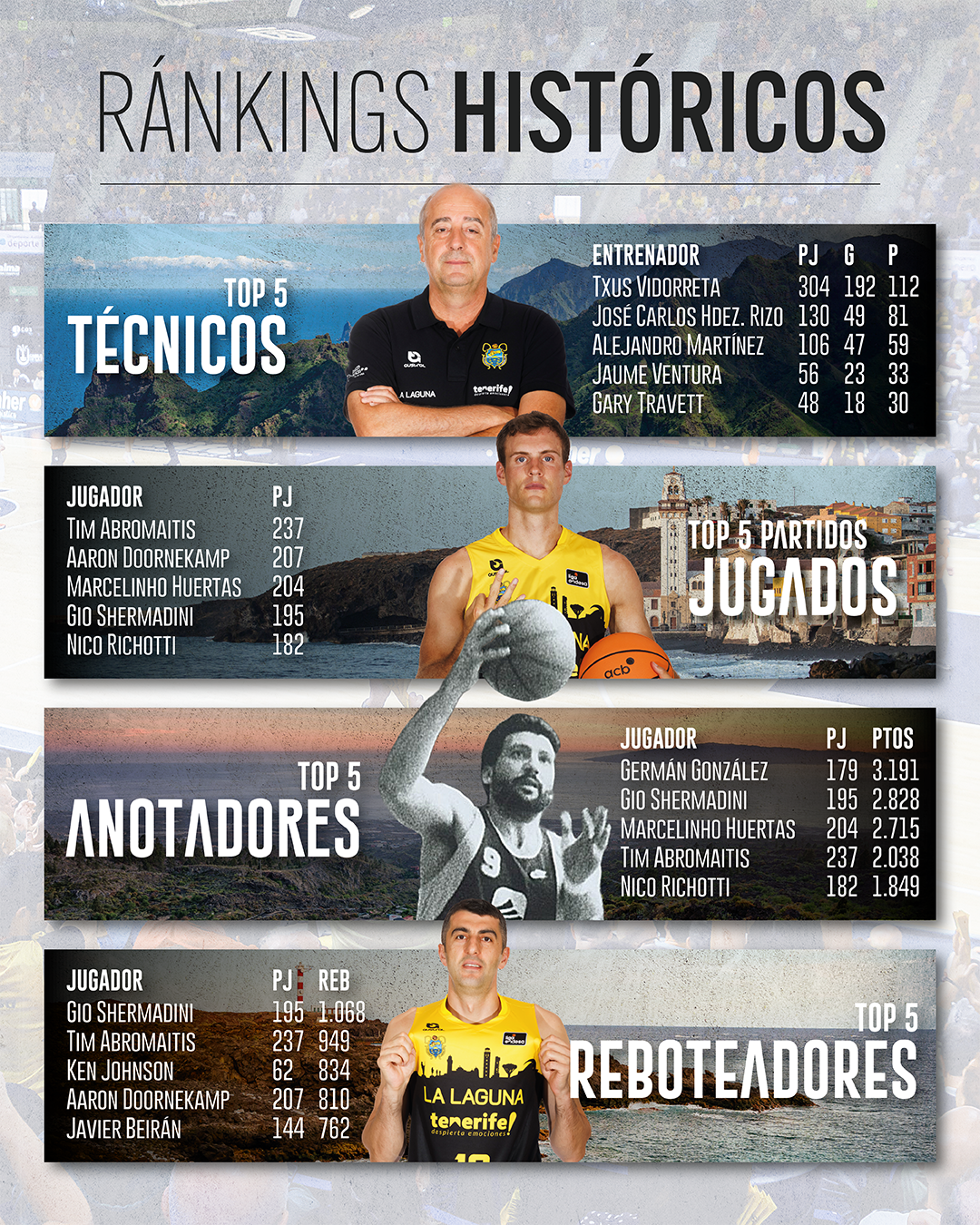 Más datos.- En lo que a jugadores se refiere, Tim Abromaitis es el que más partidos ha jugado en la élite con el proyecto canarista, con un total de 237; Gio Shermadini, el líder histórico en valoración (3.869) y en rebotes (1.068); Germán González, el máximo anotador de siempre (3.191 puntos) y el que más minutos acumuló en la ACB (6.087); Marcelinho Huertas, el rey de las asistencias (1.333); Aaron Doornekamp, el que más triples ha convertido (396); Mike Harper, el que más tapones sumó (120); y Salva Díez, el líder en recuperaciones (320).