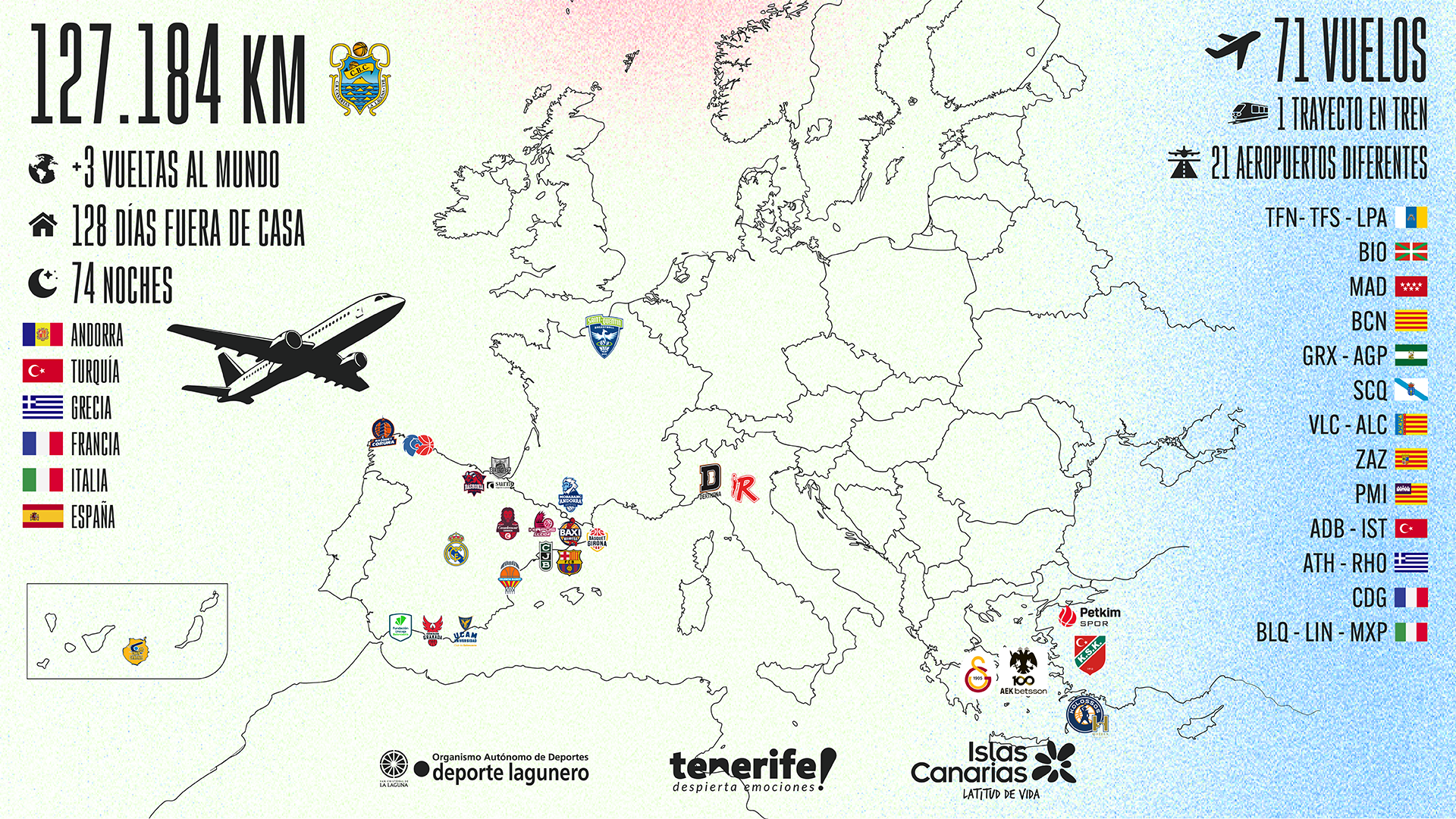 martes, 24 junio, 2025 - 01:06El mejor vehículo promocional para La Laguna, Tenerife y Canarias. El equipo aurinegro volvió una campaña más a ser el soporte publicitario más idóneo para la Isla, el Archipiélago así como para su familia de empresas patrocinadoras, con motivo de su 21ª comparecencia en la élite del baloncesto español y su novena presencia seguida en la Basketball Champions League (BCL). El conjunto insular recorrió un total de 127.184 kilómetros durante la temporada recién finalizada.