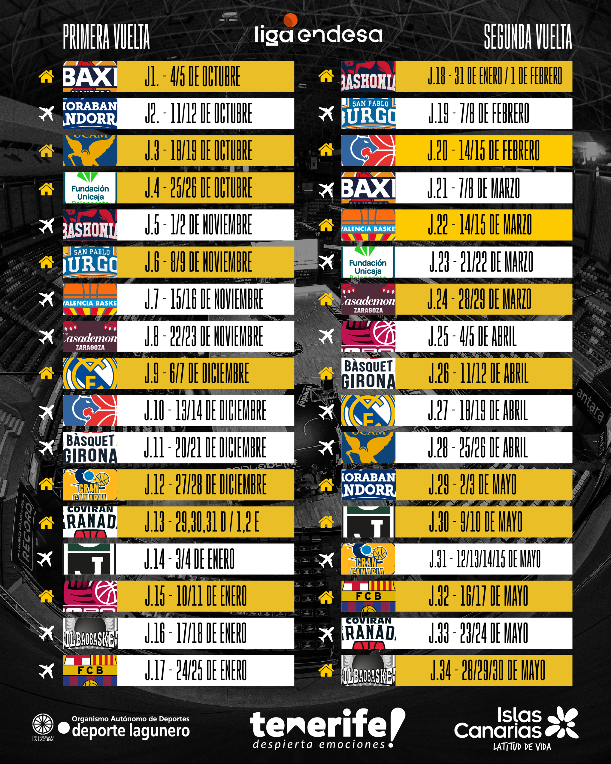 El primer duelo liguero de rivalidad regional ante el Dreamland Gran Canaria está programado para el fin de semana del 27 y 28 de diciembre, en la jornada 12 y en el Santiago Martín. Los dos representantes del Archipiélago volverán a enfrentarse, en la segunda vuelta, concretamente en la jornada 31, a disputarse los días 12, 13, 14 y 15 de mayo.