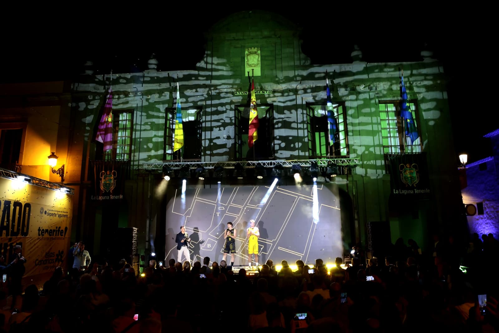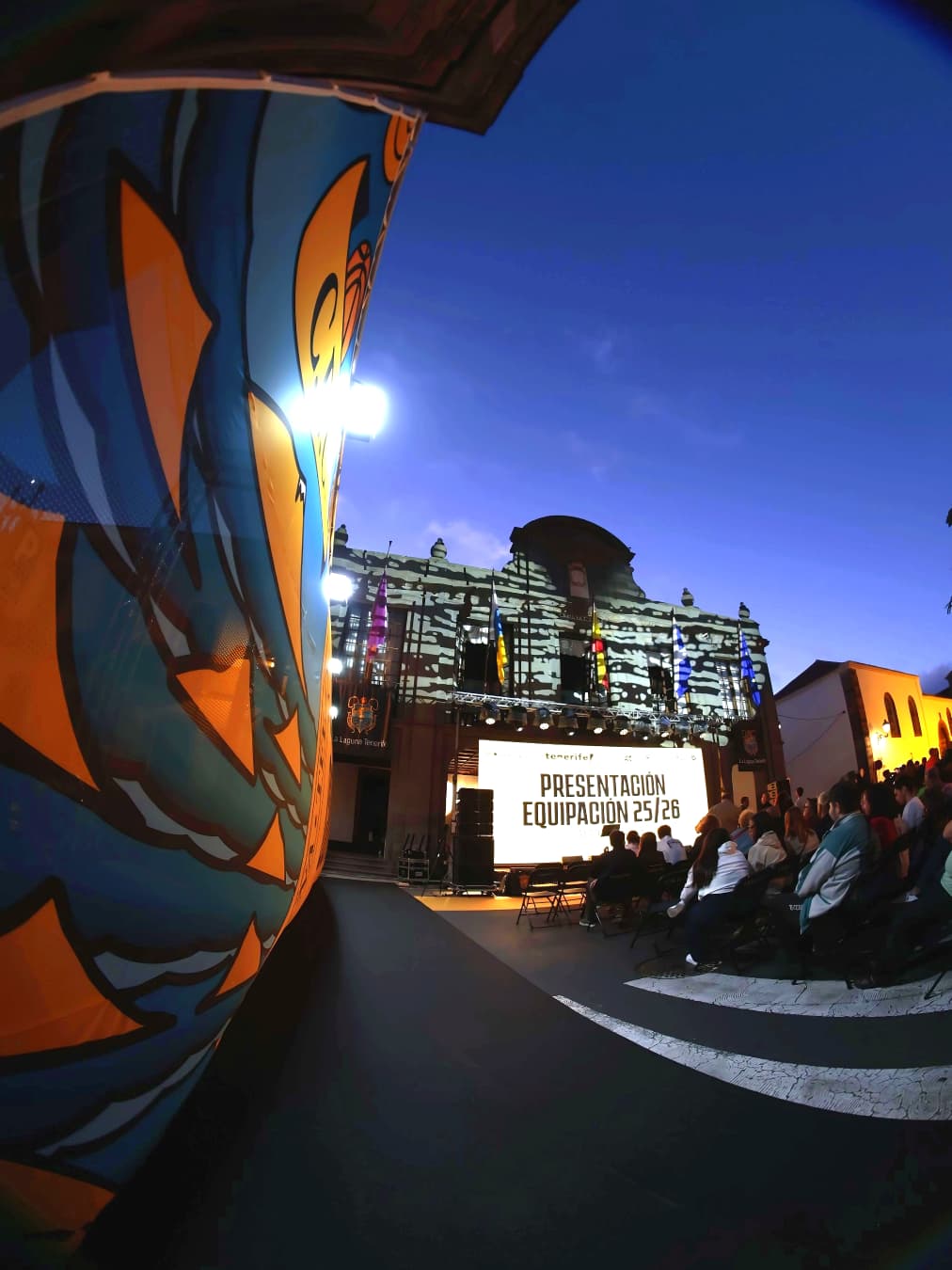 El acto, celebrado en la misma fachada del Ayuntamiento de La Laguna, en un escenario acondicionado para la ocasión frente a la Plaza del Adelantado, sirvió para desvelar la nueva vestimenta del equipo aurinegro, inspirada esta vez en el histórico plano de Leonardo Torriani, el más antiguo que se conserva de la Ciudad.