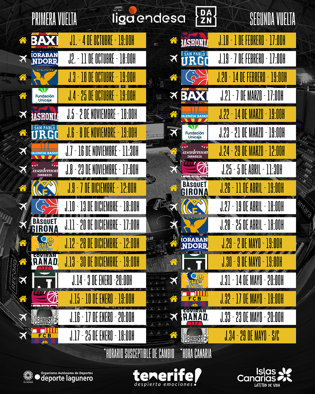 El actual campeón de liga, el Real Madrid, visitará el Santiago Martín el domingo 7 de diciembre a las 12:00 hora insular, mientras que Unicaja Málaga lo hará el 25 de octubre a las 19:00 horas. El Barça, por su parte, visitará el feudo aurinegro el domingo 17 de mayo a las 18:00 hora insular.