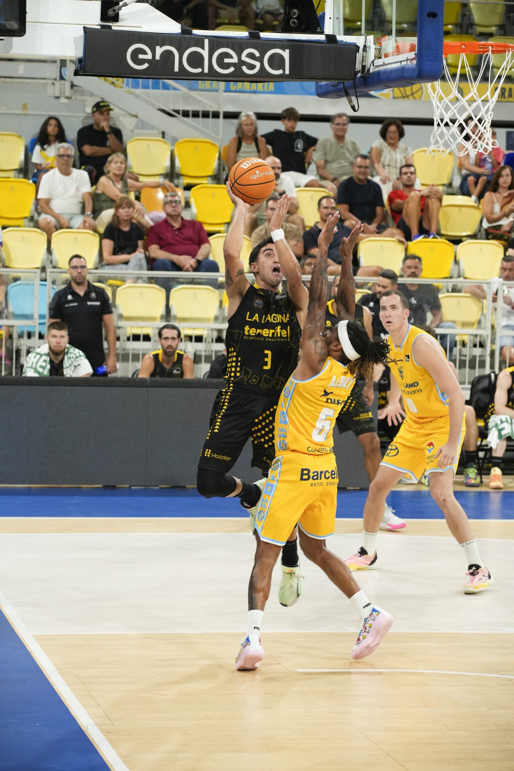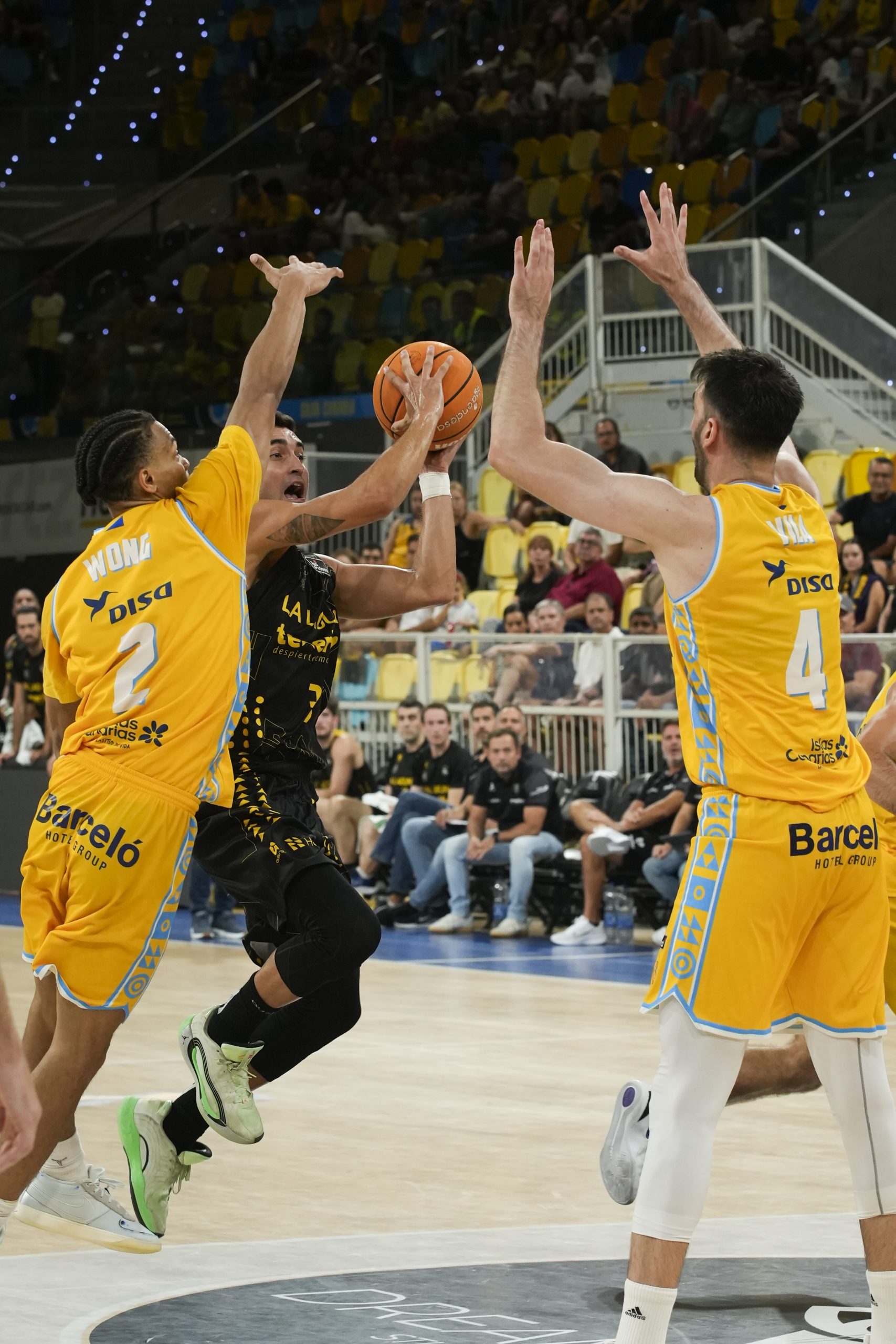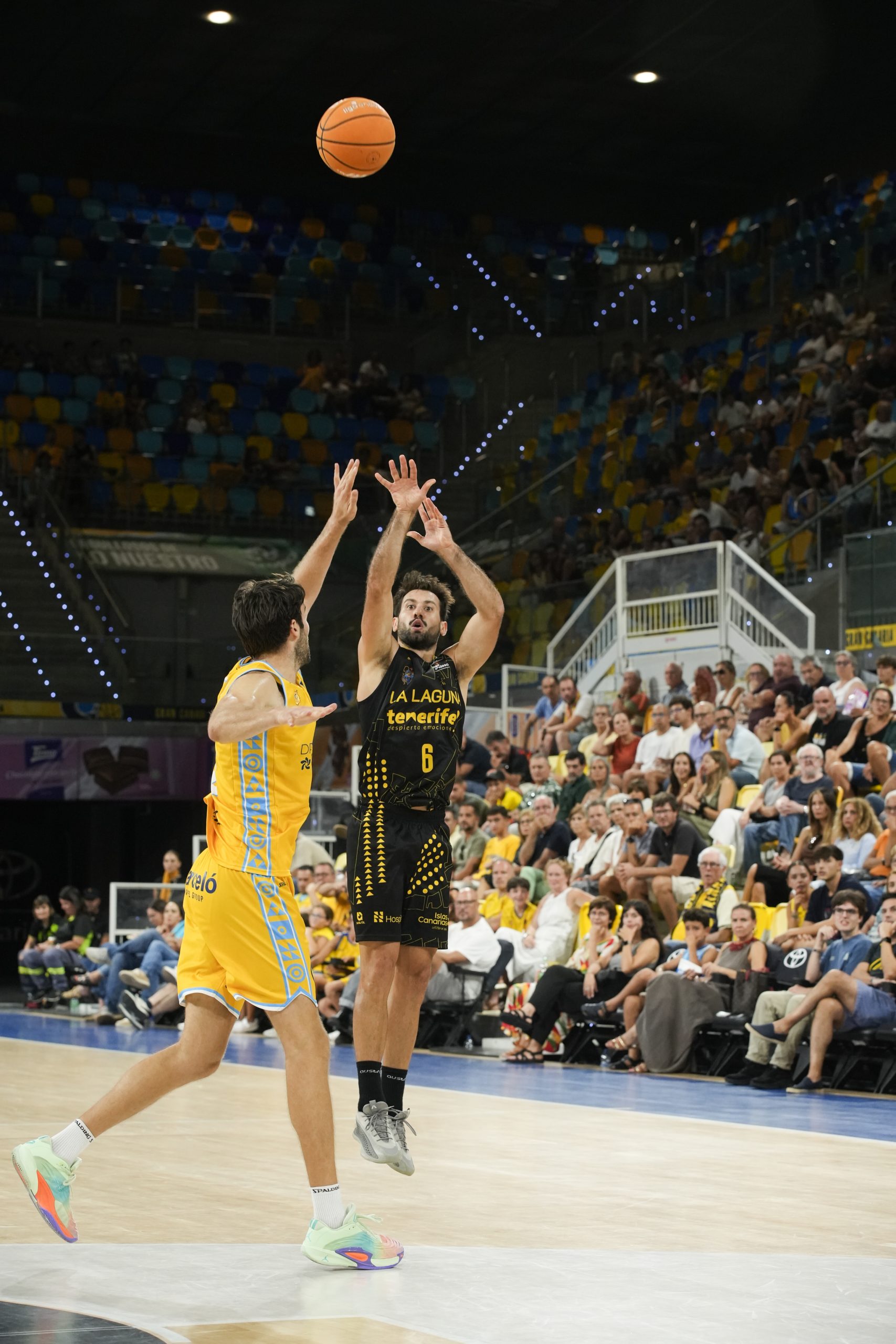 El pulso nació ya en clave aurinegra, con los tinerfeños marcando territorio en los dos lados de la pista. Marcelinho Huertas impuso el ritmo que más convenía a los suyos y el criterio en la circulación de balón se tradujo en tres triples convertidos casi de manera consecutiva, dos de Wesley y uno de Thomas Scrubb (0-9).