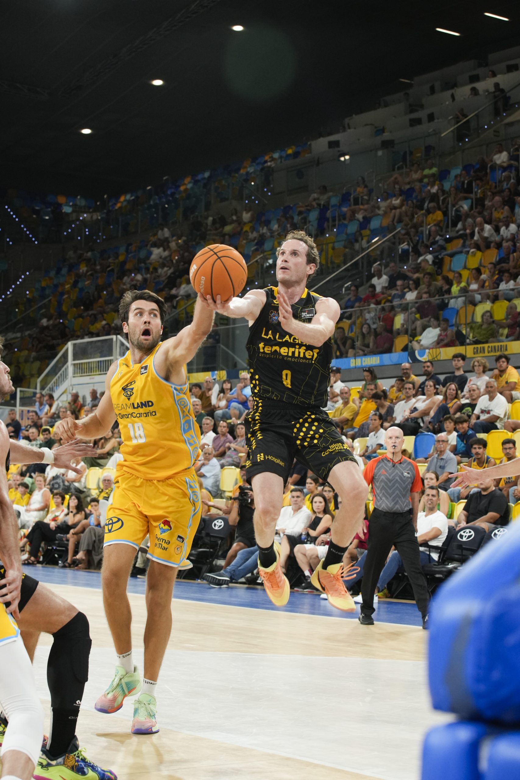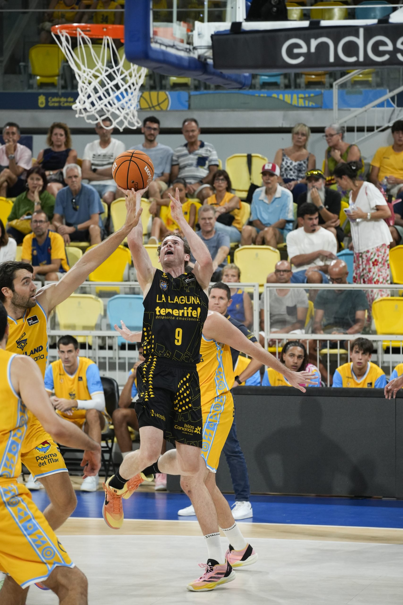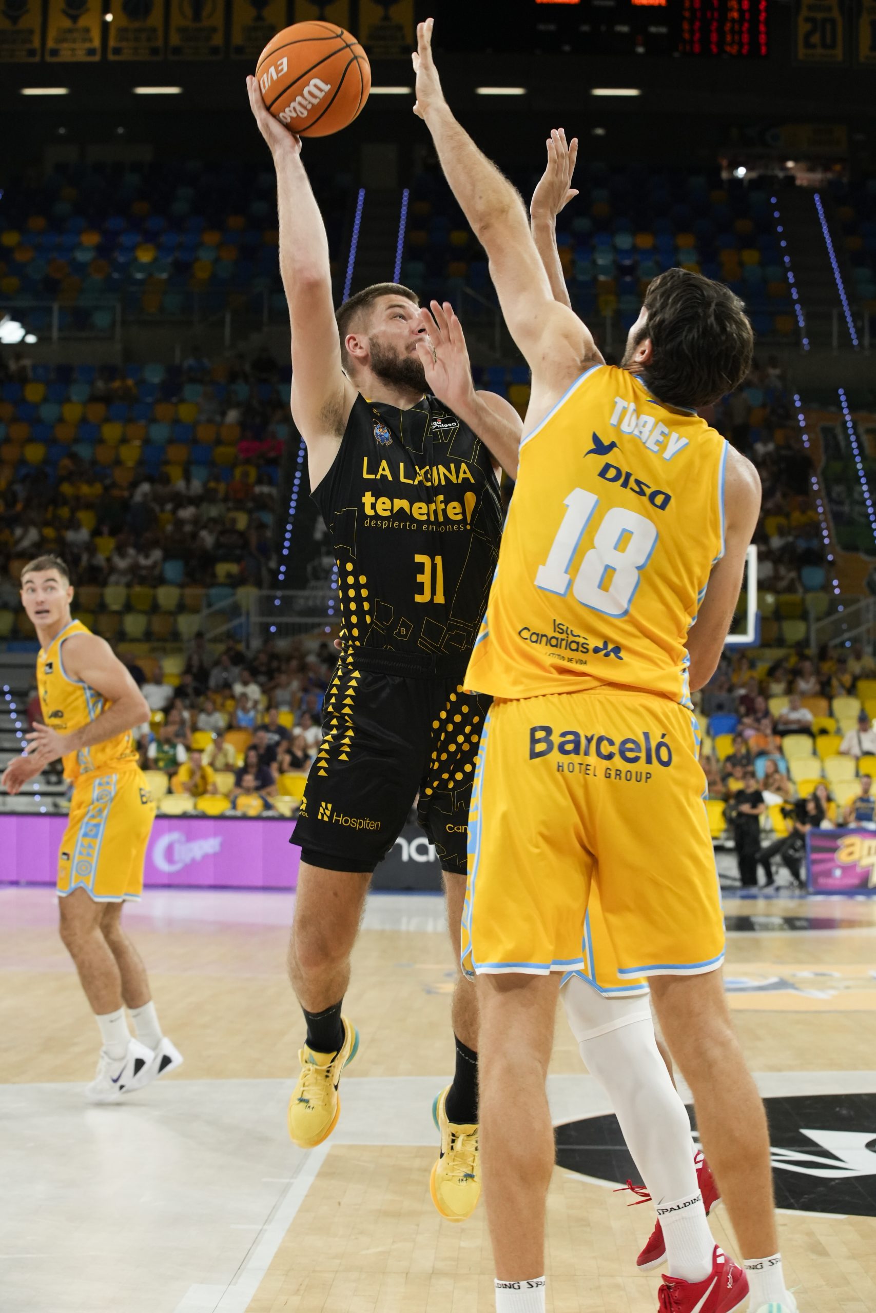 El pulso nació ya en clave aurinegra, con los tinerfeños marcando territorio en los dos lados de la pista. Marcelinho Huertas impuso el ritmo que más convenía a los suyos y el criterio en la circulación de balón se tradujo en tres triples convertidos casi de manera consecutiva, dos de Wesley y uno de Thomas Scrubb (0-9).