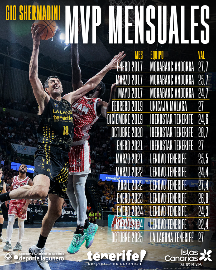 lunes, 27 octubre, 2025 - 12:10El pívot de La Laguna Tenerife, Gio Shermadini, se ha erigido en el Jugador Más Valioso (MVP) del mes de octubre en la Liga Endesa, tras promediar 27 de valoración en los cuatro partidos disputados, muy por delante del siguiente jugador en el ranking, Luka Bozic (22,5).