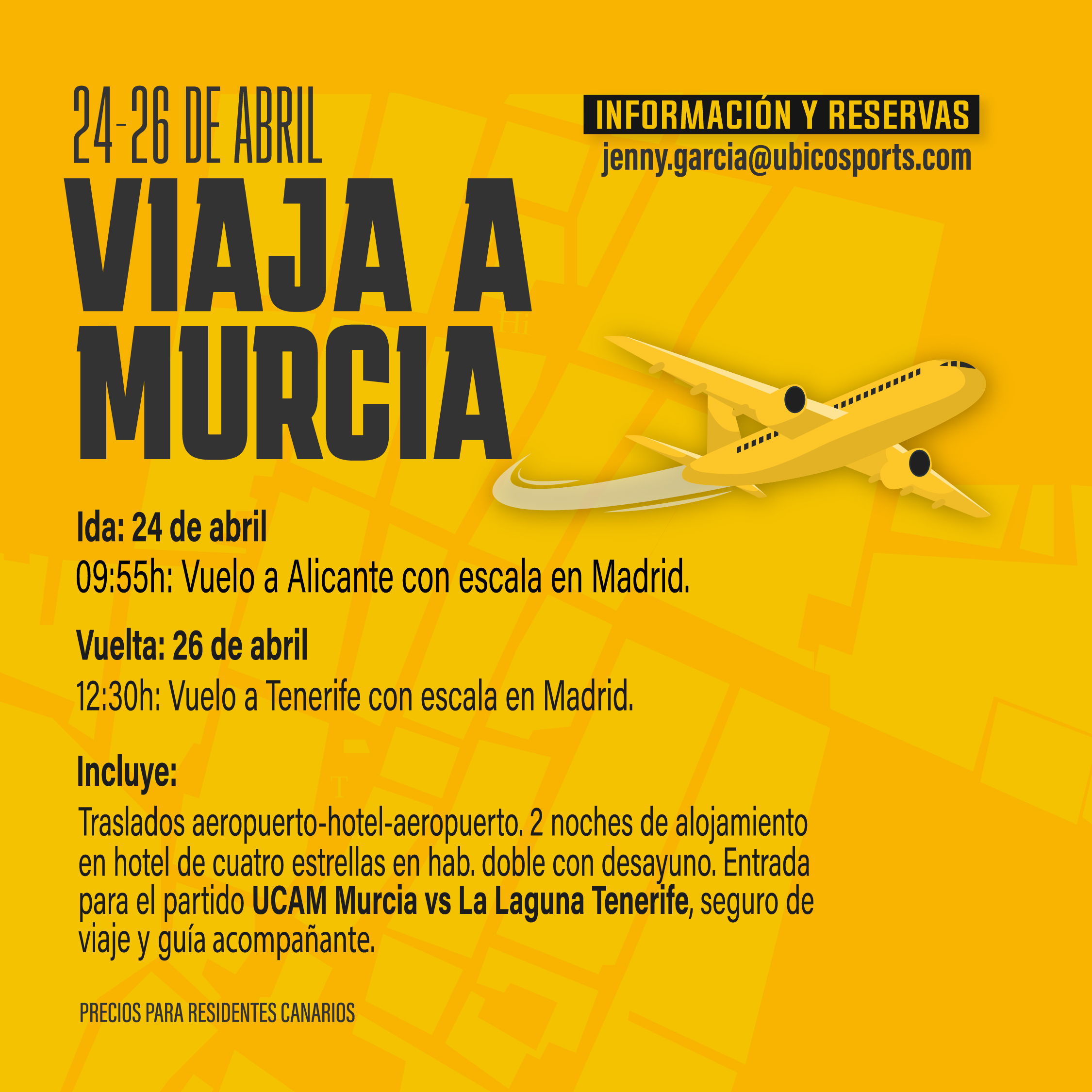 lunes, 3 noviembre, 2025 - 02:11Azulmarino, agencia de viajes online, ha lanzado este lunes un pack para apoyar a La Laguna Tenerife en su encuentro de Liga Endesa ante UCAM Murcia en el Palacio de Deportes de Murcia, correspondiente a la 28ª jornada. El viaje está programado para el fin de semana del 24, 25 y 26 de abril de 2026, para el cual, los abonados aurinegros tendrán preferencia. El partido en cuestión se disputará el sábado 25, a las 18:00 hora insular.