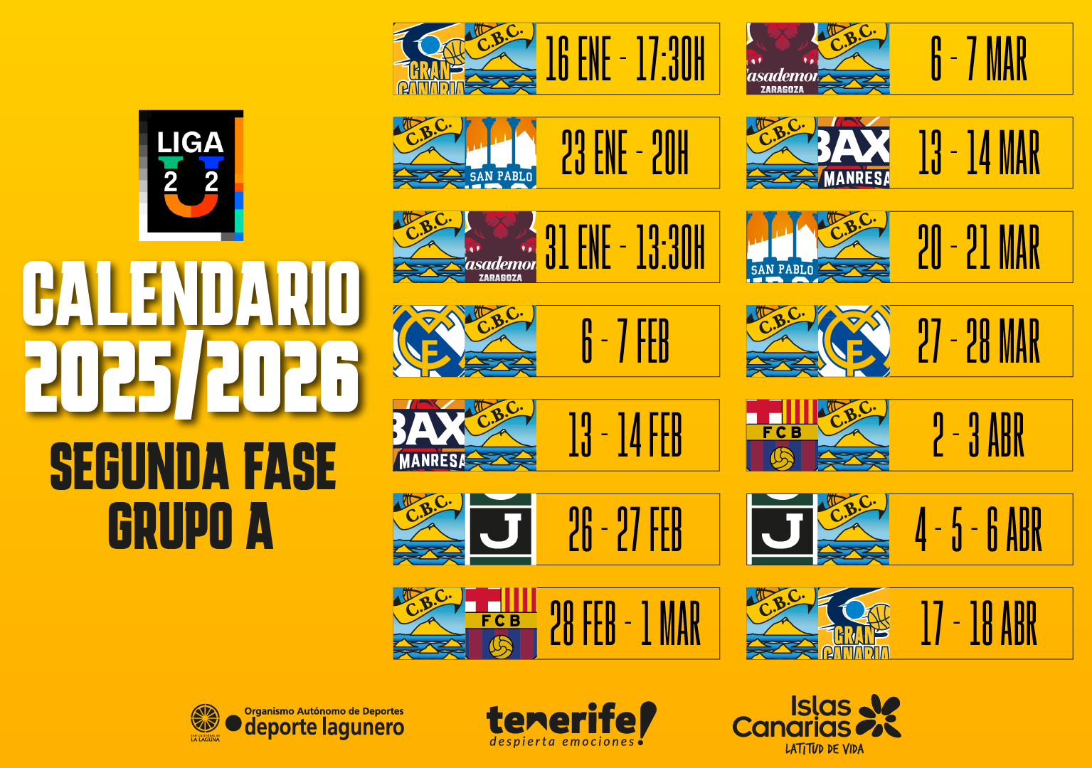 La Liga U está de vuelta y el Fundación CB Canarias ya conoce sus emparejamientos de la segunda fase de la competición y los horarios de las tres primeras jornadas. El filial aurinegro, que seguirá compitiendo en el grupo A tras cuajar una notable primera fase, regresa con un derbi a domicilio ante el CB Gran Canaria este viernes (17:30 horas) y posteriormente afrontará dos citas consecutivas en el Santiago Martín.