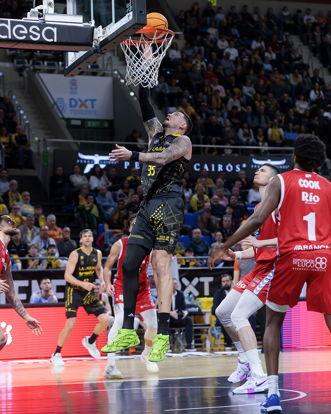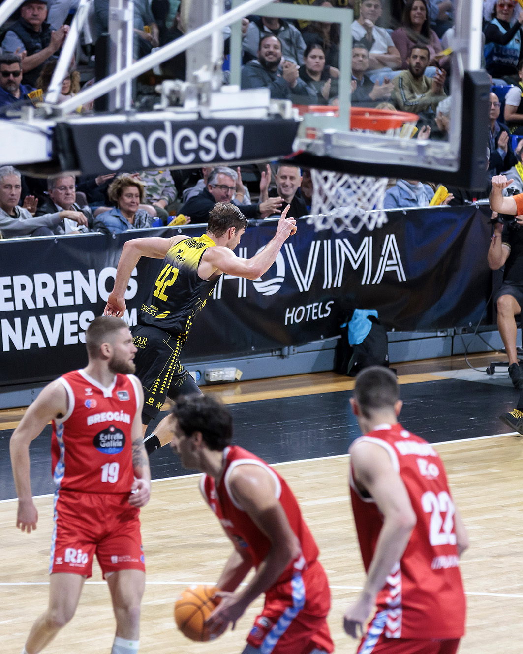 El pulso nació y creció con mucho ritmo, con Wesley Van Beck asumiendo los galones en ataque para los anfitriones, y los gallegos atosigando la subida de balón de los bases aurinegros. La irrupción de Jaime Fernández, con cinco puntos consecutivos, y una canasta tras rebote ofensivo de Fran Guerra, amagaban con una ligera brecha (16-11), pero el Rio Breogán respondía con entereza y con un acierto brutal desde más allá del arco: 6/7 de inicio y 9/13 al descanso.