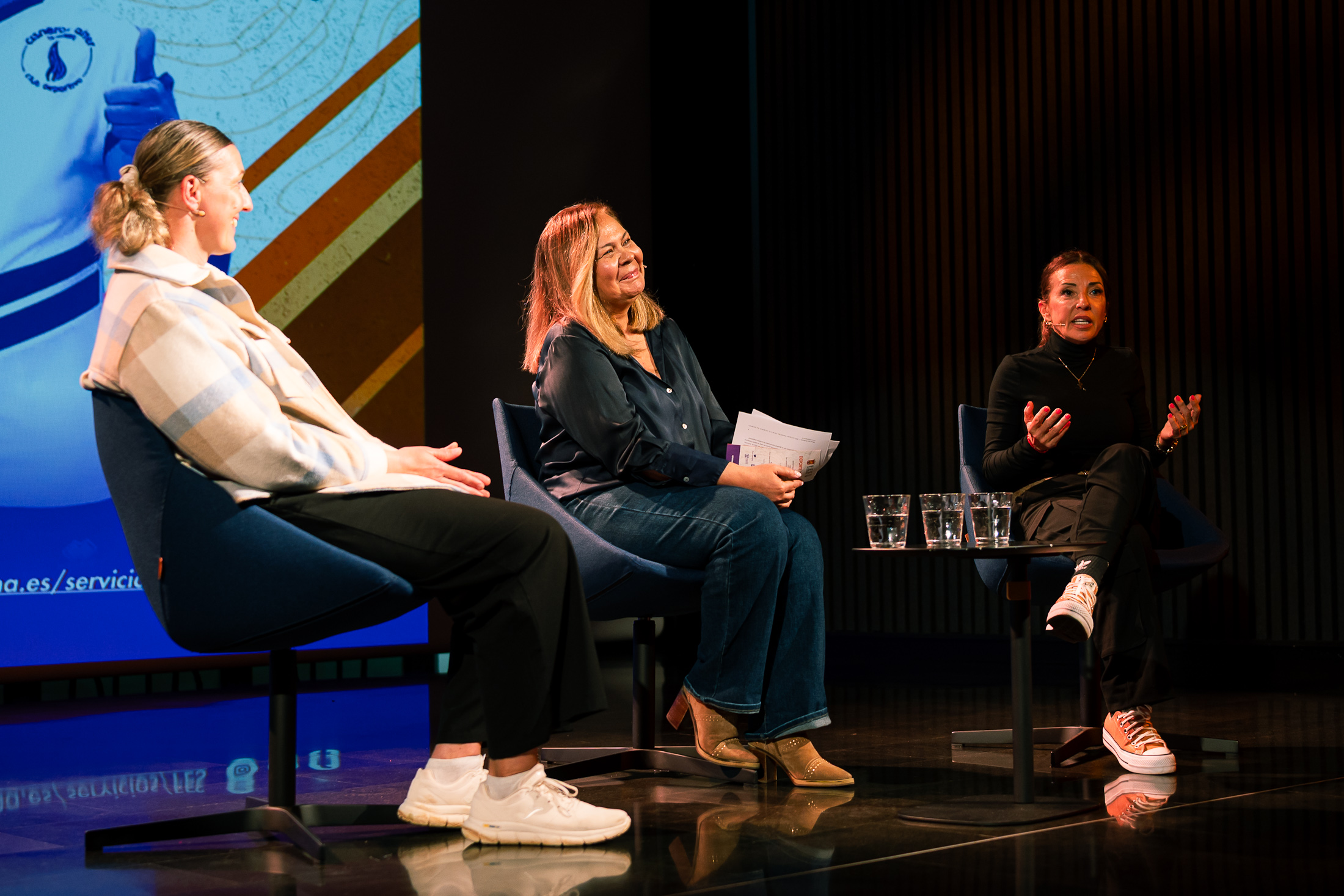 Carmen Cabeza puso la nota de humor antes de la primera mesa de debate, que contó con la futbolista Natalia Ramos y la exjugadora de baloncesto Laura Herrera, siendo moderada por la periodista Fátima Febles. Herrera empezó hablando de Elisa Aguilar, con la que coincidió en las canchas, a la que puso como ejemplo. Para la exjugadora es importante “tener valores, tener referentes”. Por su parte, Natalia dijo sentirse orgullosa de ser un referente para muchas niñas.