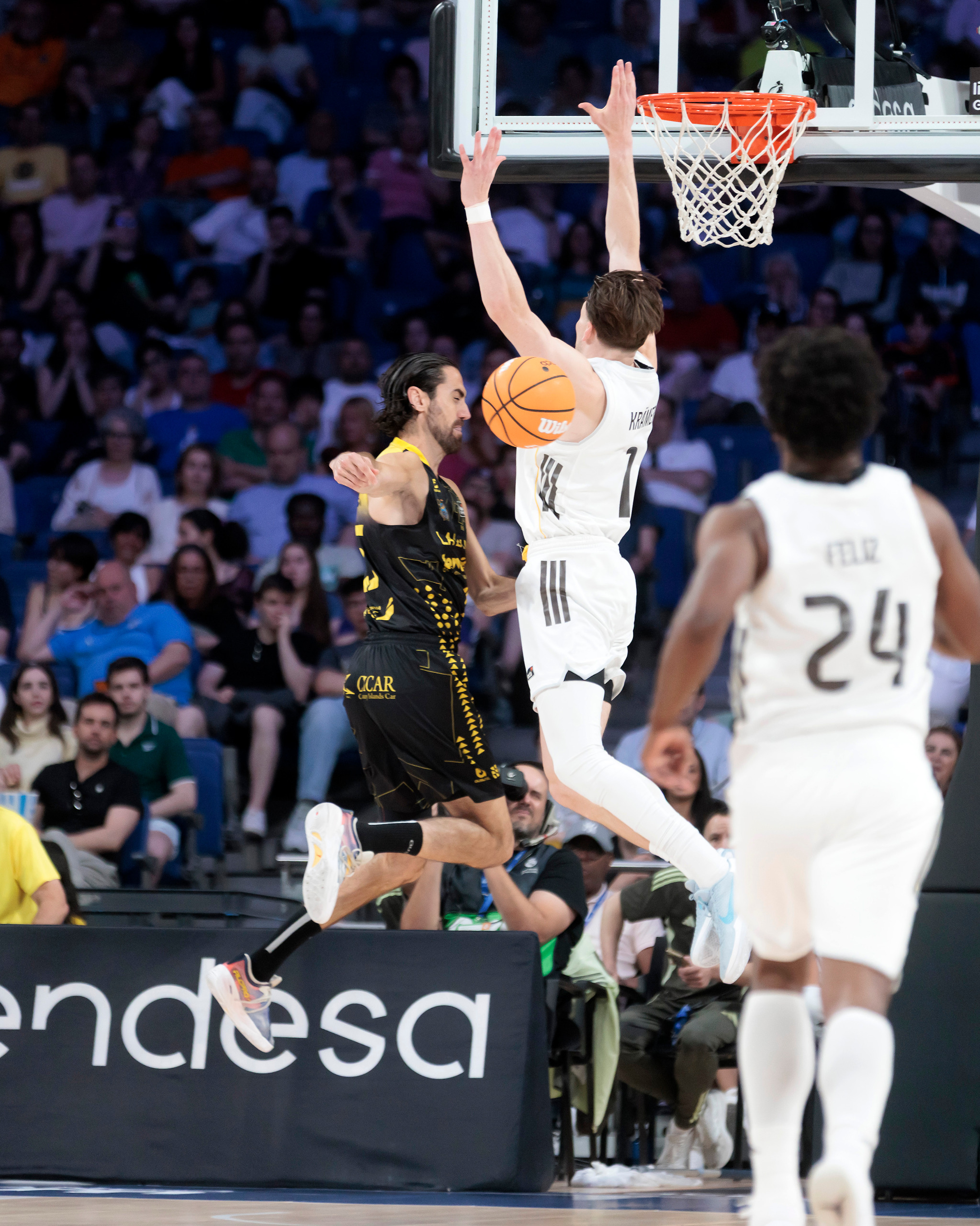Y eso que el Real Madrid lo intentó con todo, especialmente a partir de los balones interiores a Tavares y de la capacidad anotadora de Andrés Feliz desde la dirección. No le bastó a los madridistas, sobre todo, porque se topó con un señor equipo, el aurinegro, muy curtido ya en estas batallas. Un triplazo de Patty al poco de acabar el tercer cuarto, para el 60-68, dejó bien claro que mucho tendría que sudar el rival en el último cuarto para contrarrestar el ímpetu de un Canarias empeñado en llevarse la victoria de una pista donde este año sólo había ganado el Barça en lo que a la ACB se refiere y con un tremendo balance de 18/1 en Euroliga.